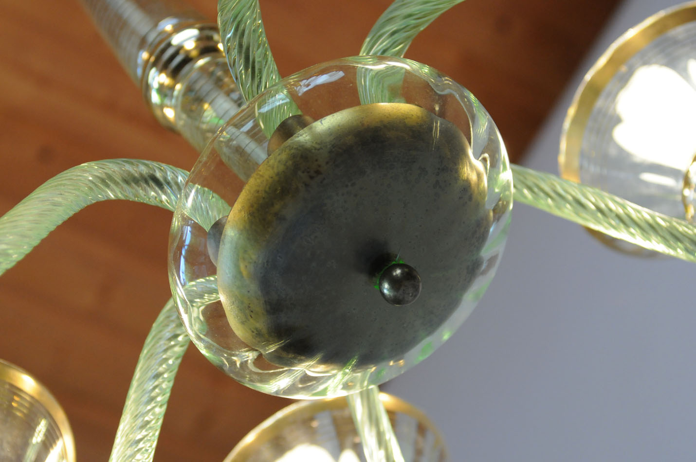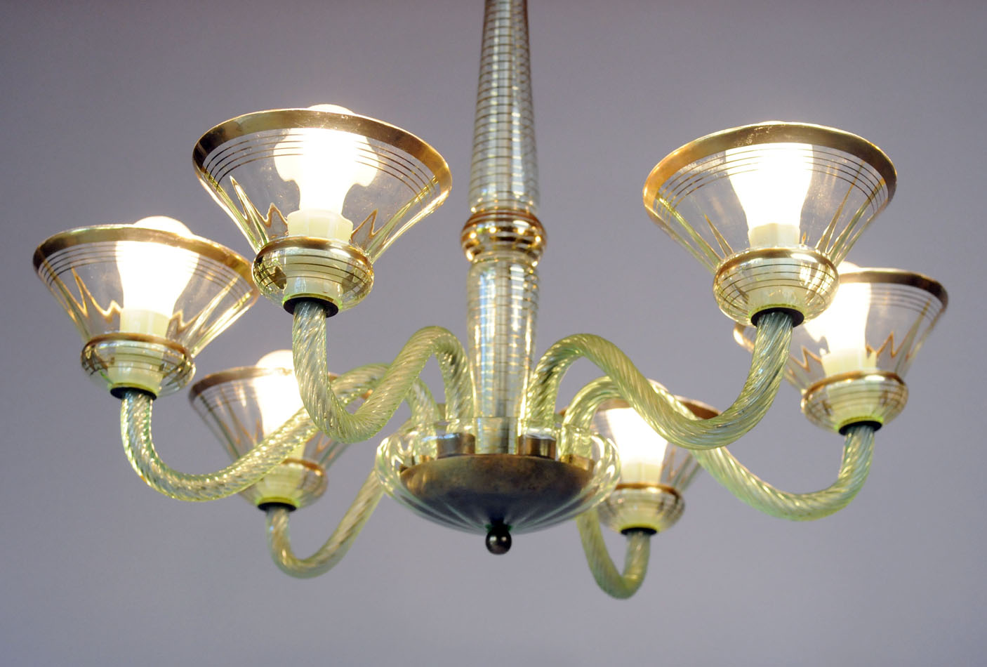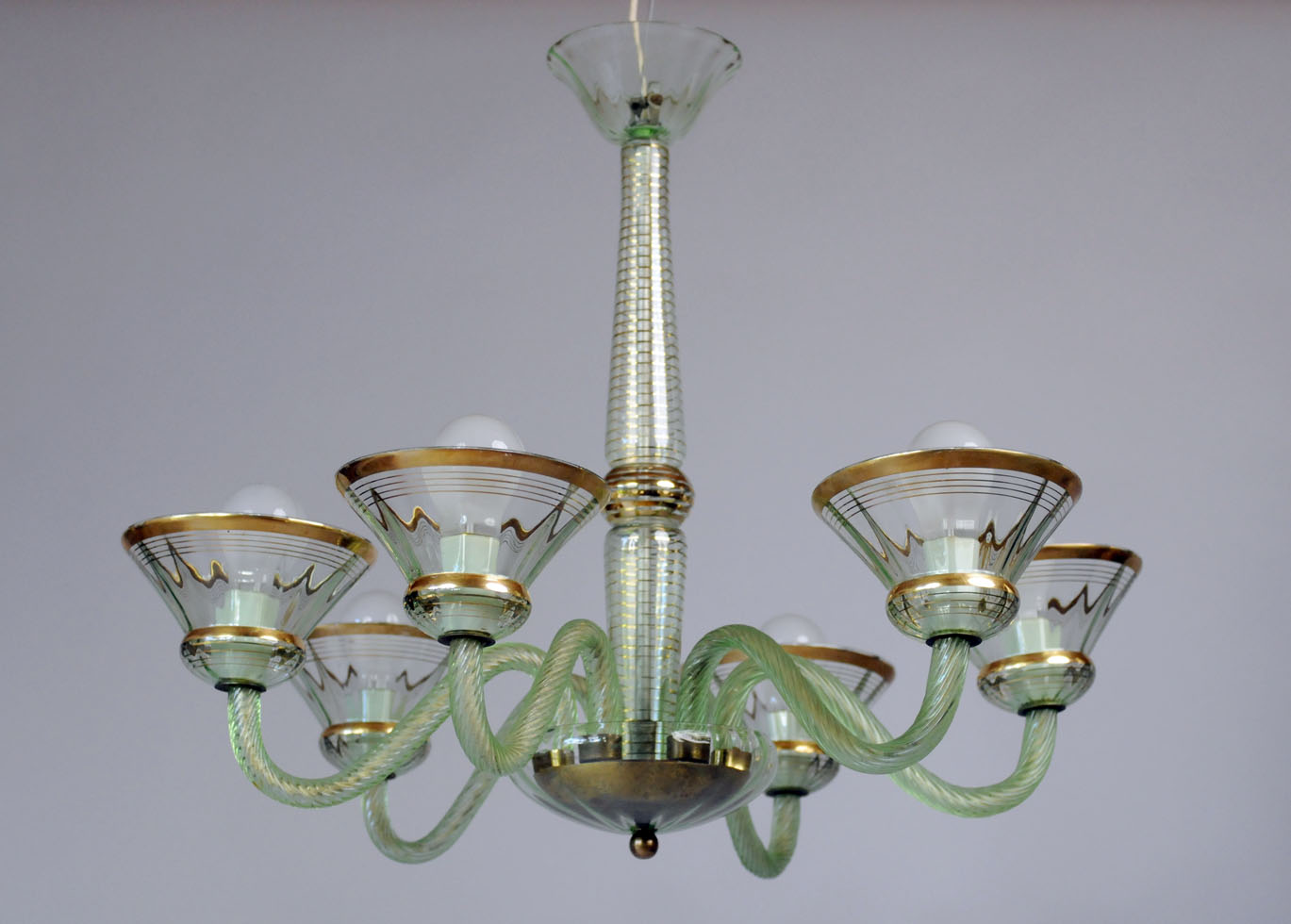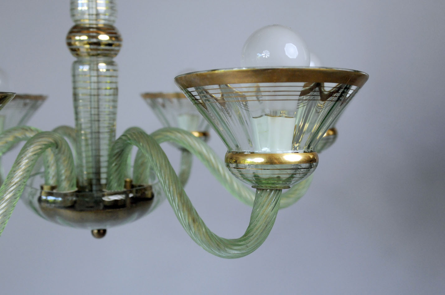 6-light chandelier made of pale green translucent glass lined with gilded rings. Very refined, perfect condition.