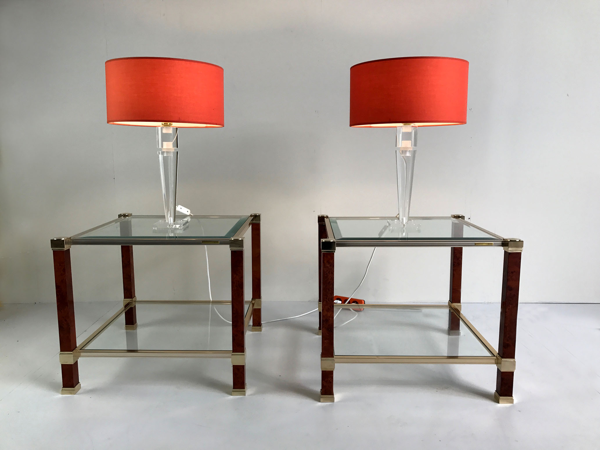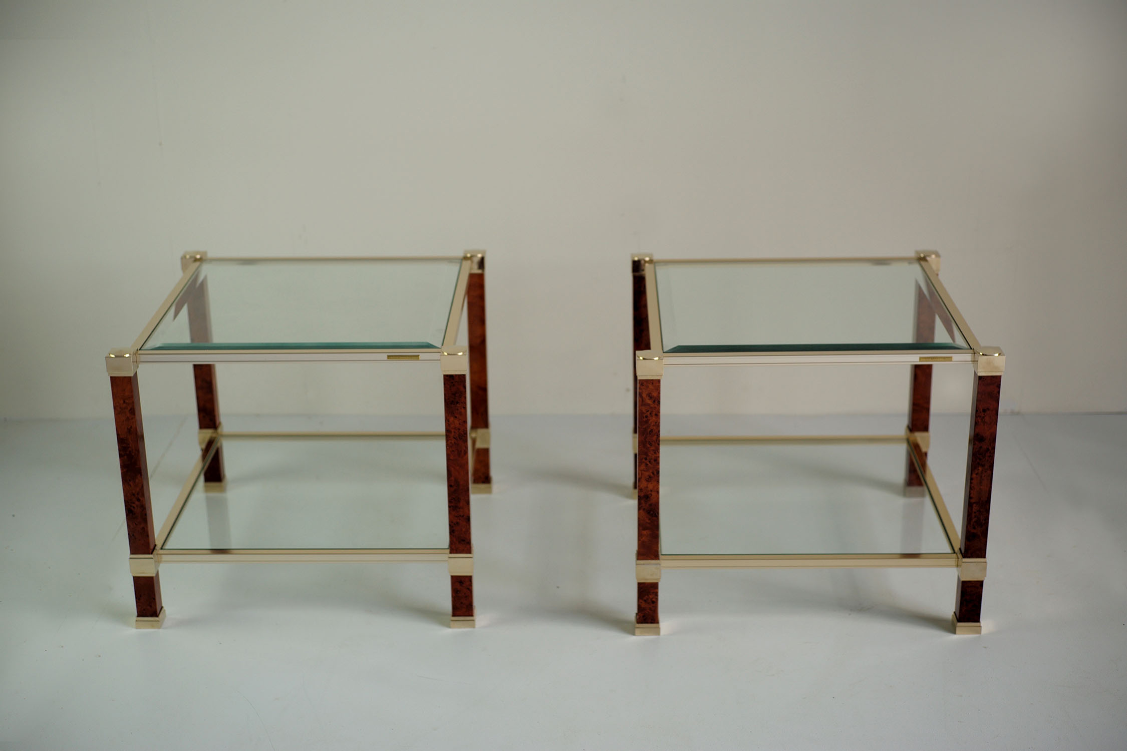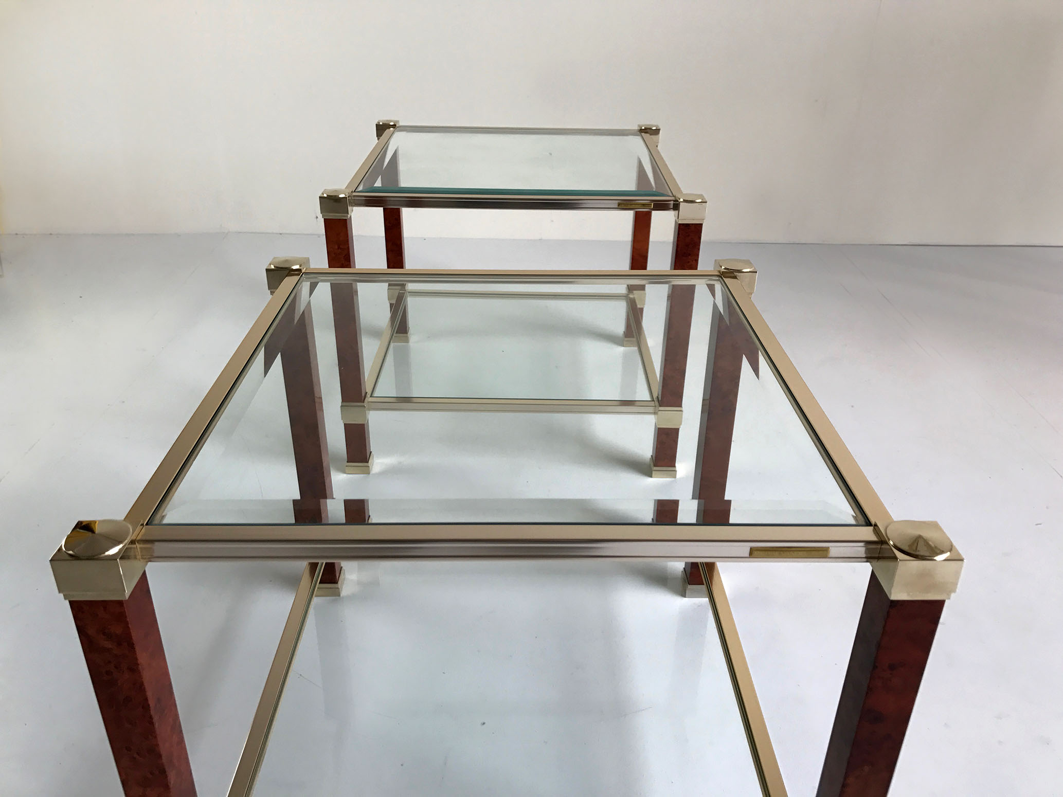 Pair of sofa tables by Pierre Vandel, Paris, 1980. Feet in speckled maple, gilded metal, faceted glass. Exceptional state of origin. Signed.