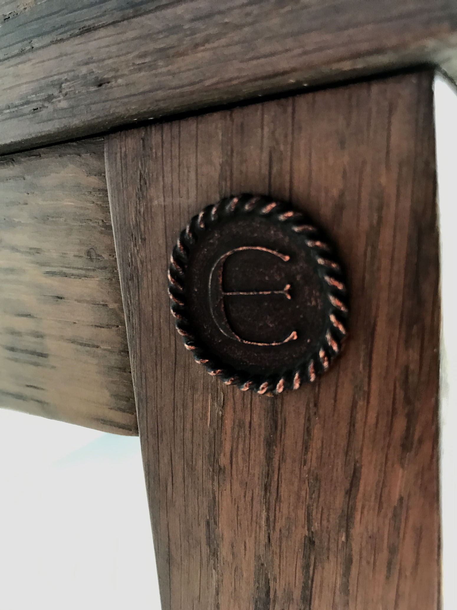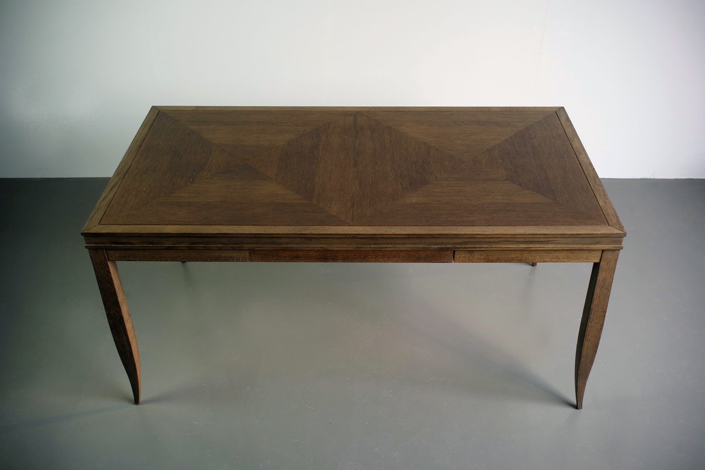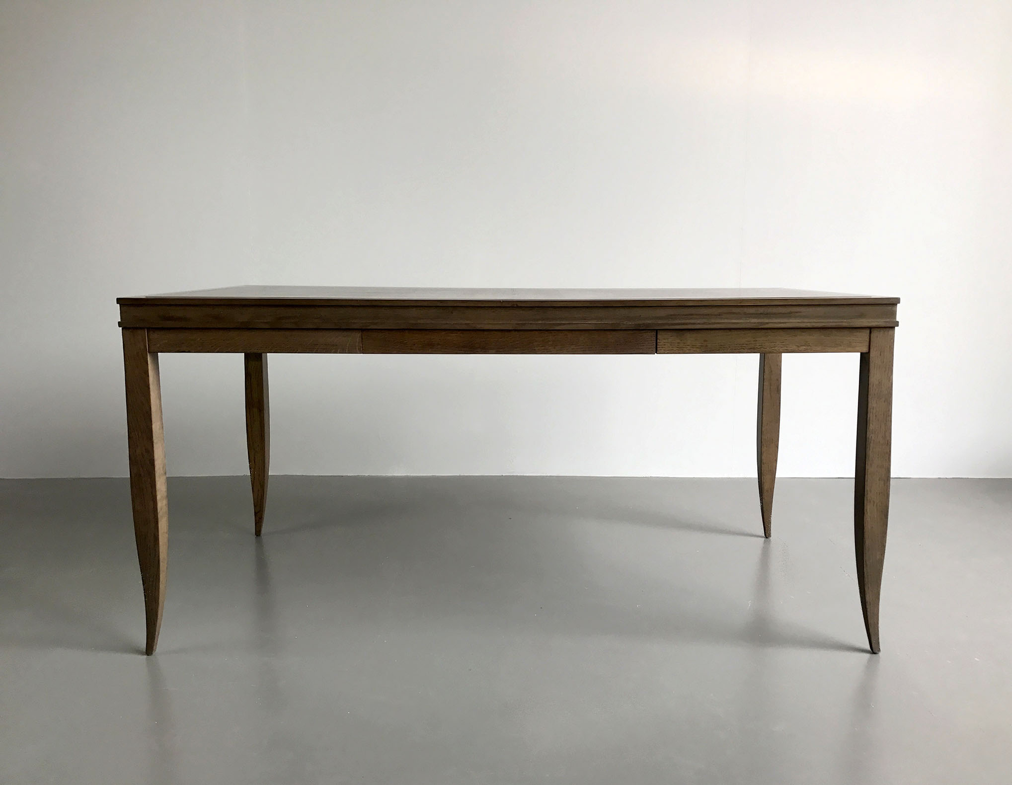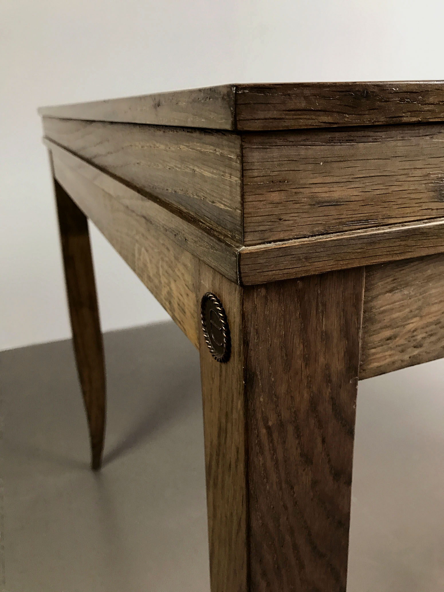 Matte grey stained solid oak structure, double-tipped oak veneer top, concealed drawer in transom, locking compartment.