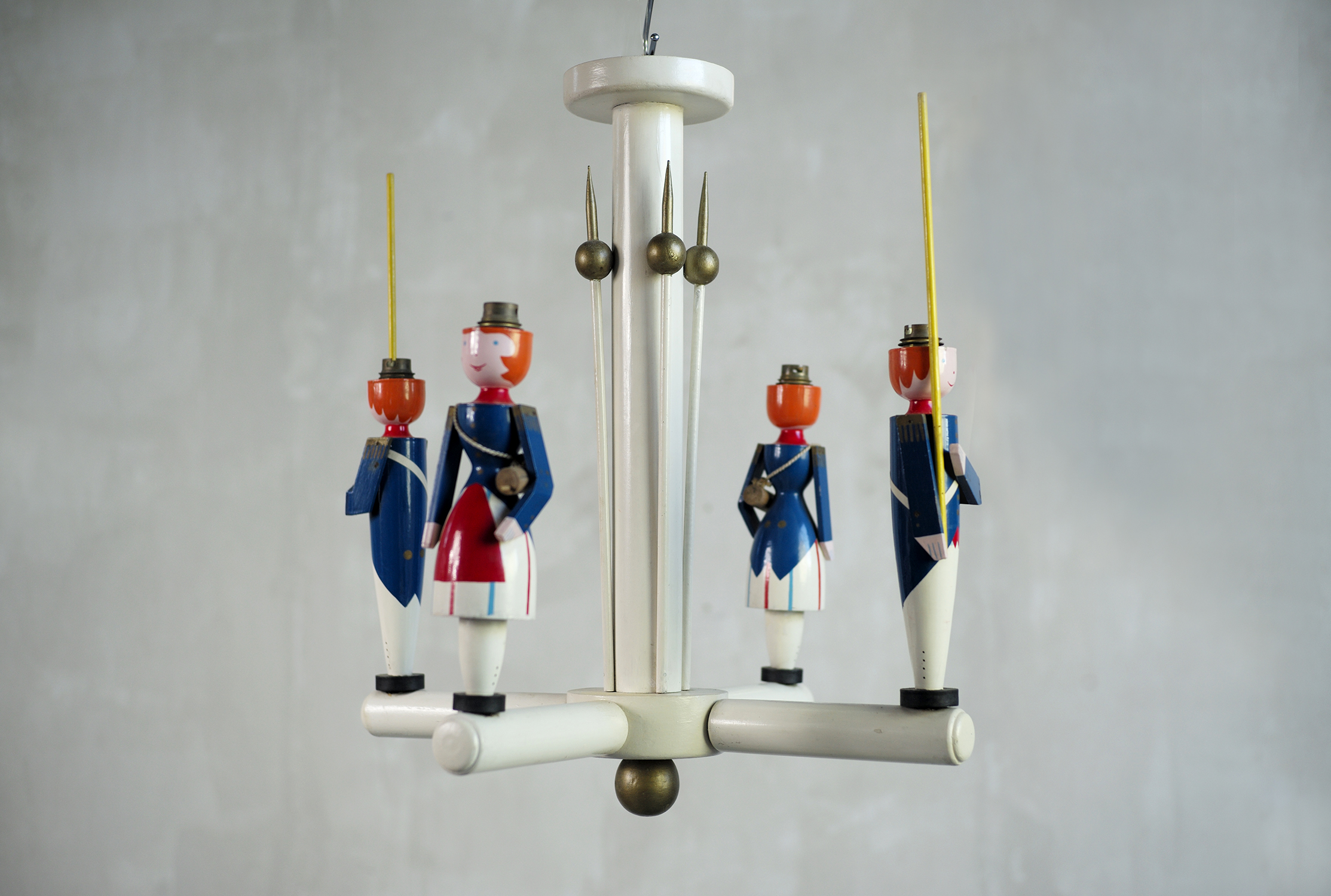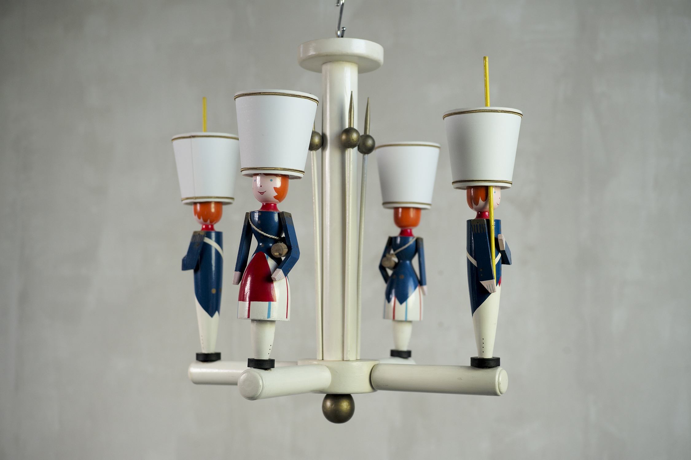 Suzanne Guiguichon, 4-light lacquered wood chandelier edited by La Maitrise under the direction of Maurice Dufrène, France 1930. In remarkable freshness, this iconic lamp represents two soldiers and two cantinières. The pikes and accessories of the costumes are complete, the colors are superb.
