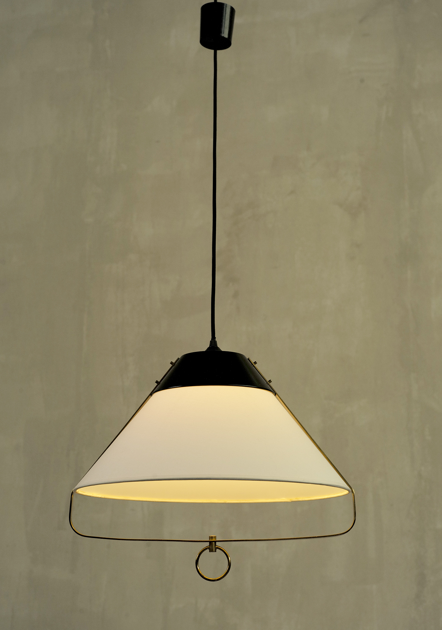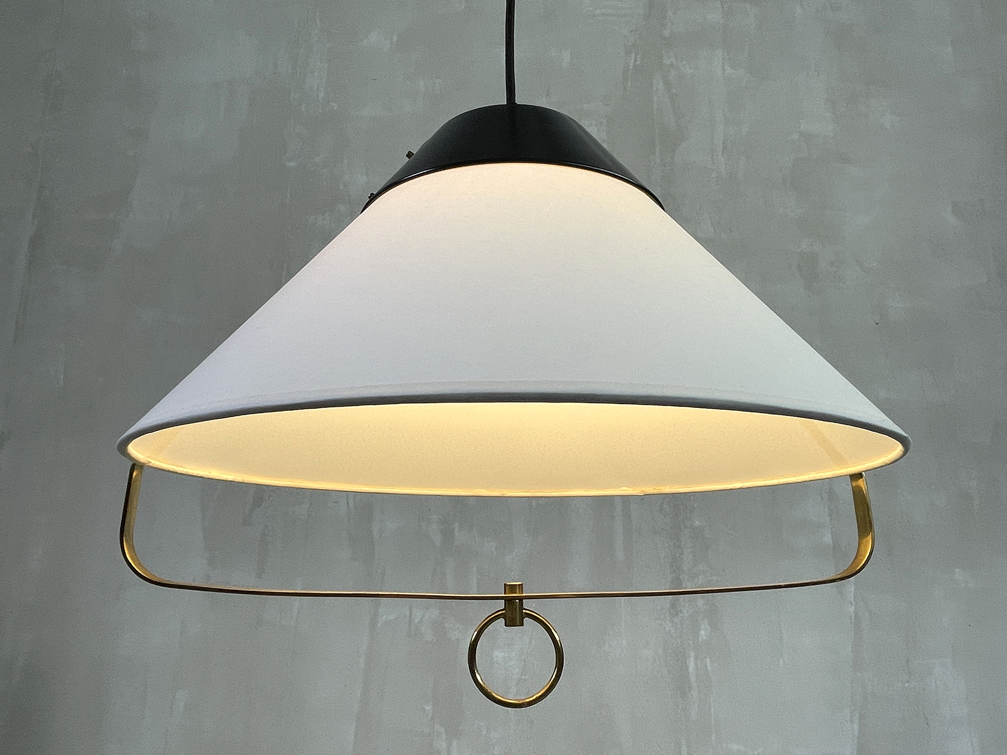 Elegant suspension in black lacquered metal, gilded brass and fabric, attributed to Lunel, France 1950.