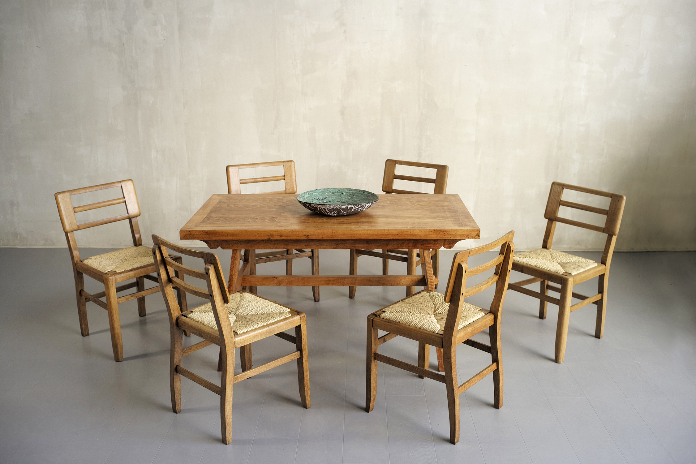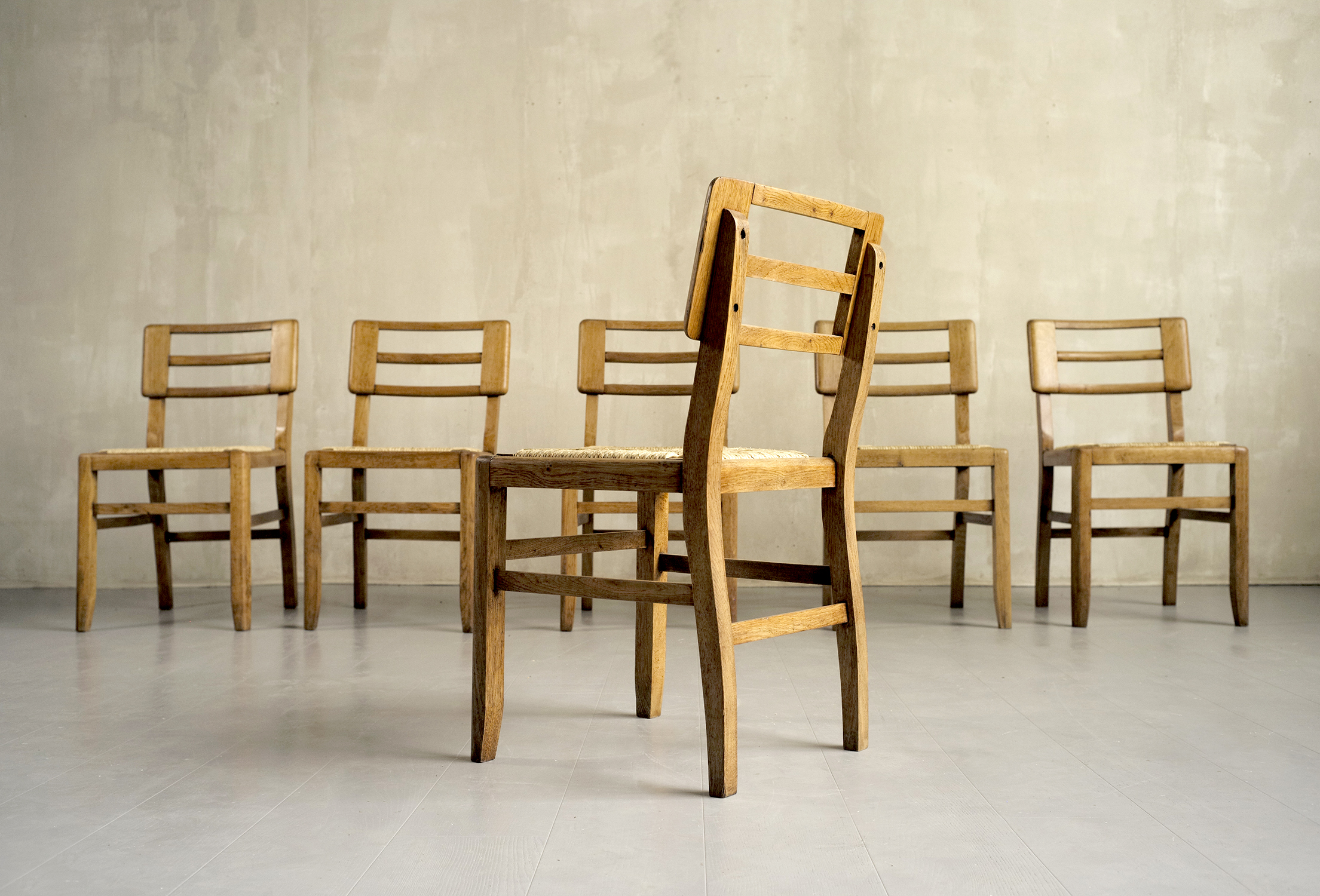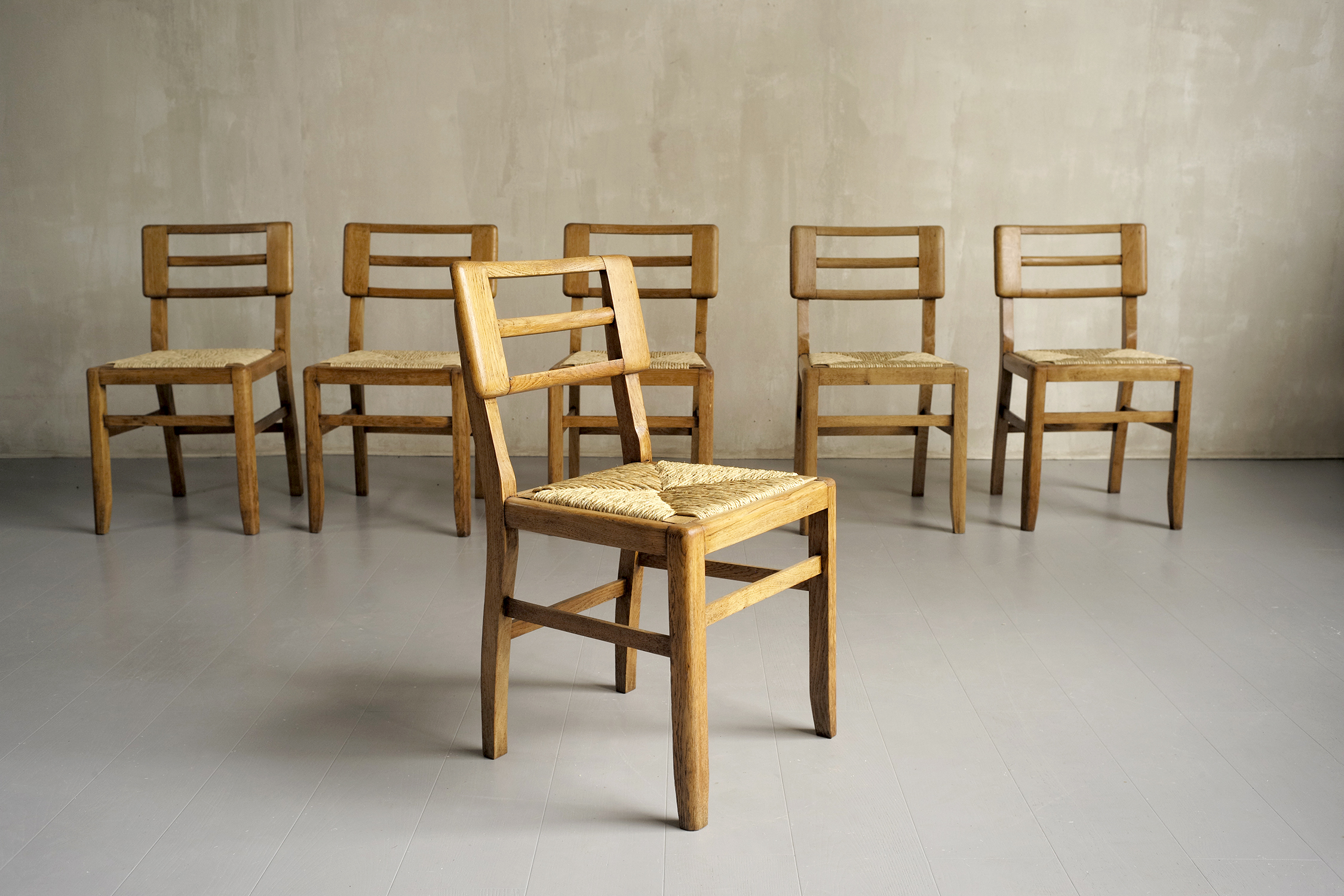 Set of 6 straw chairs by Pierre Cruège, France 1950. Structure in blond oak, seat in natural straw. After having created high quality furniture sets before the Second World War, Pierre Cruège put himself at the service of French Reconstruction (1945-1955). These chairs were produced during this period. Very good condition.