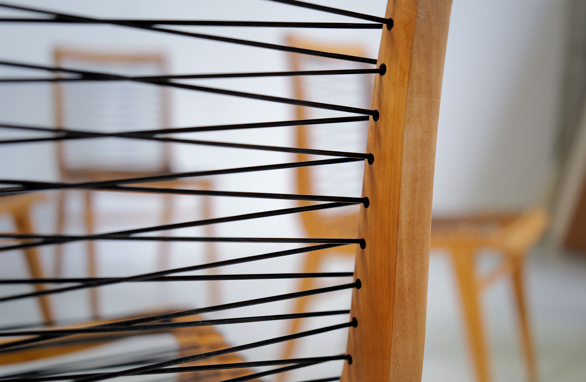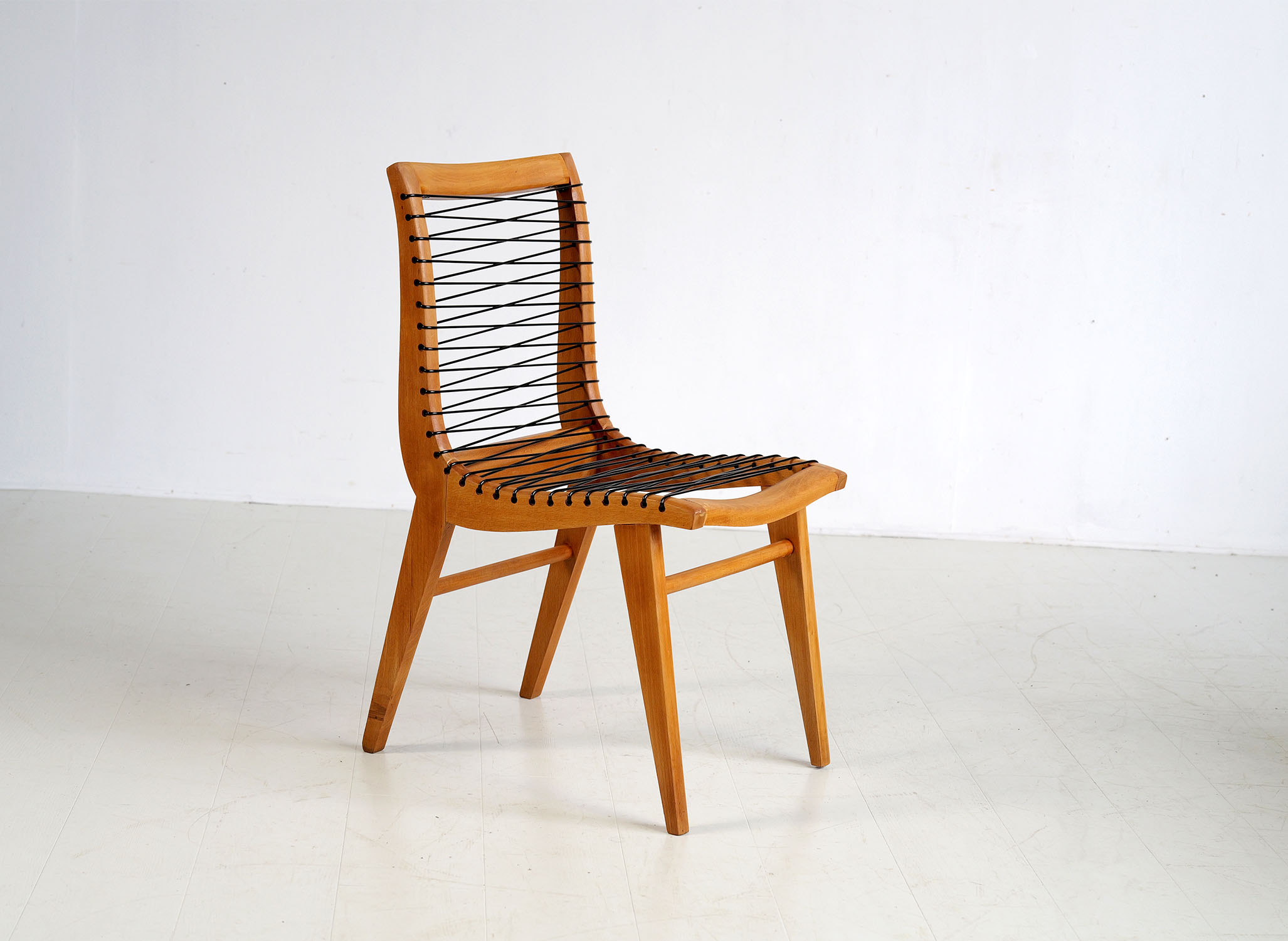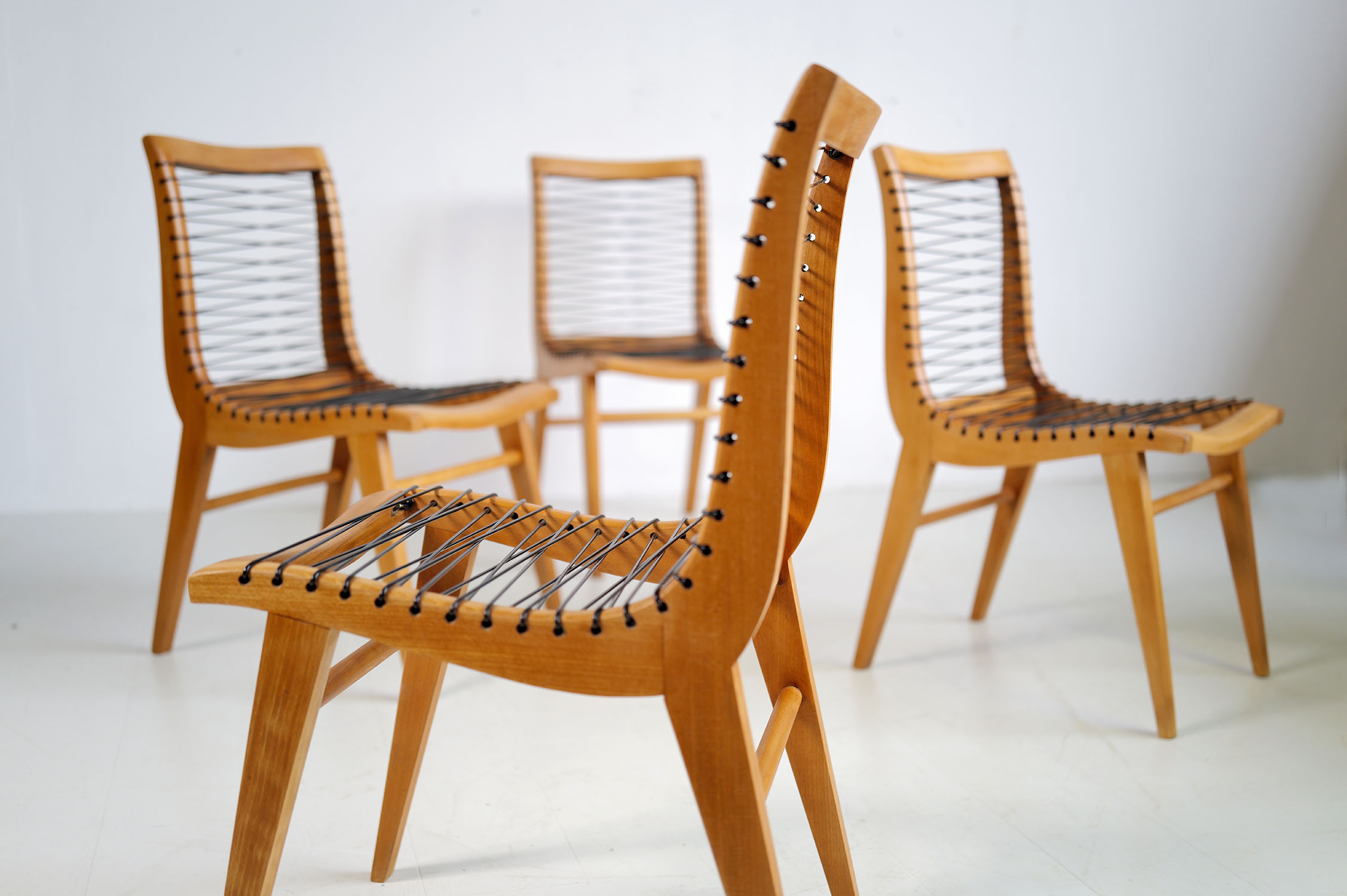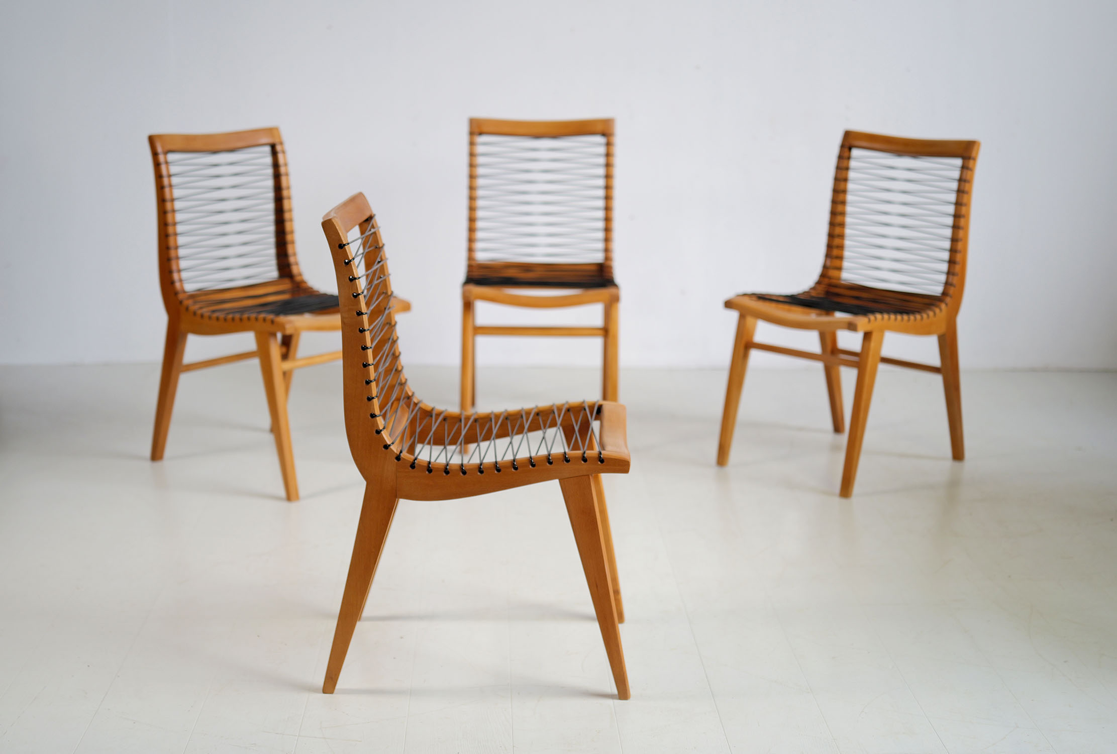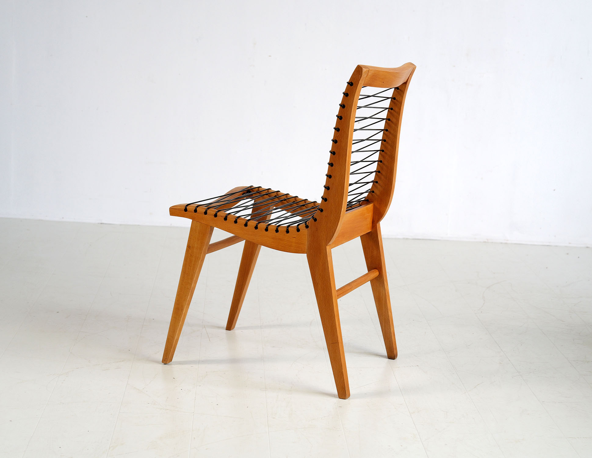Set of 4 beech and "black scoubidou" chairs by Louis Sognot, France 1950. Very good condition, scoubidou refurbished.