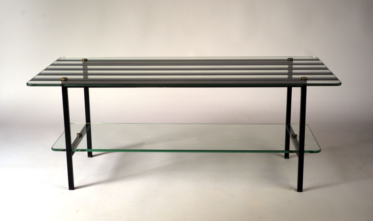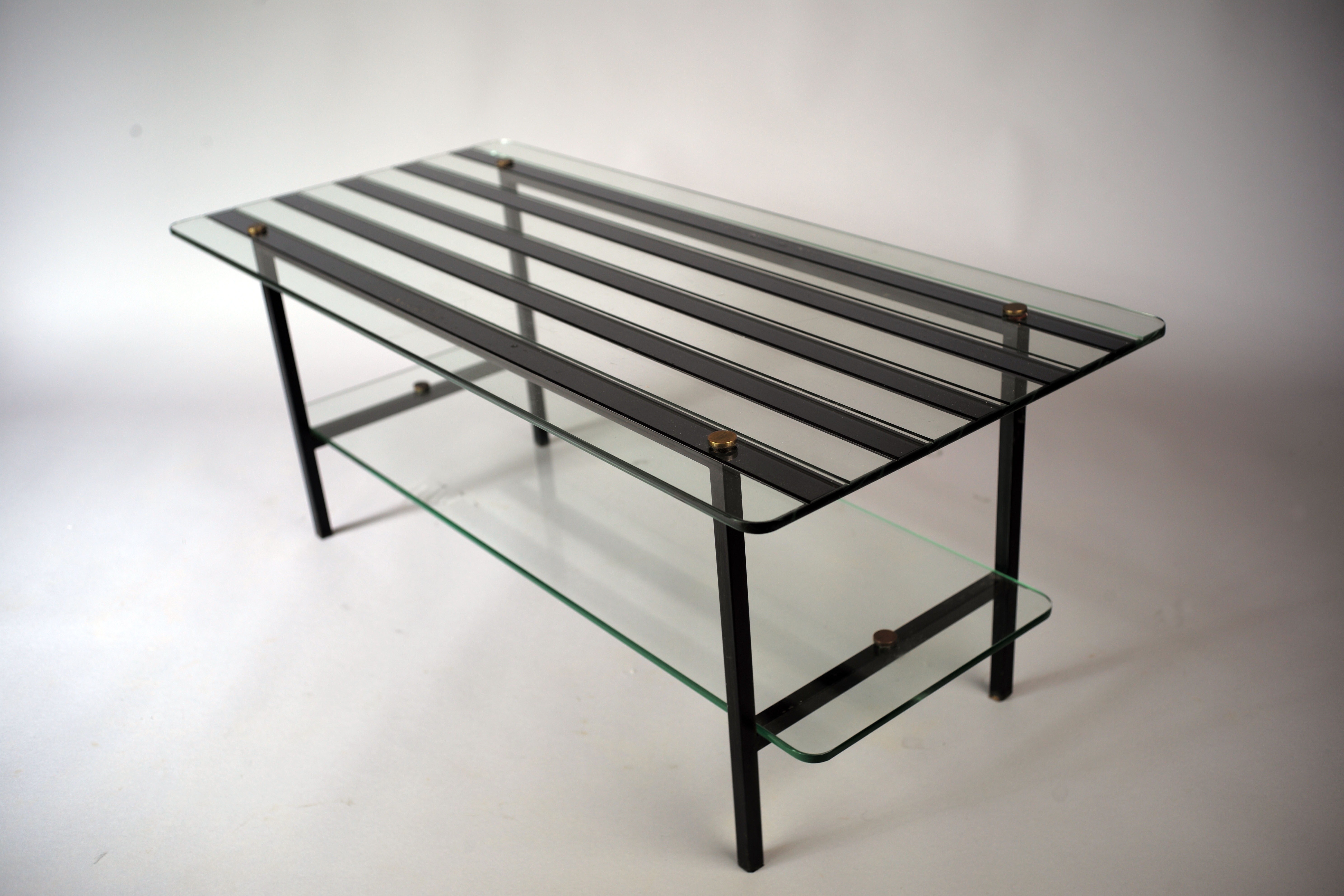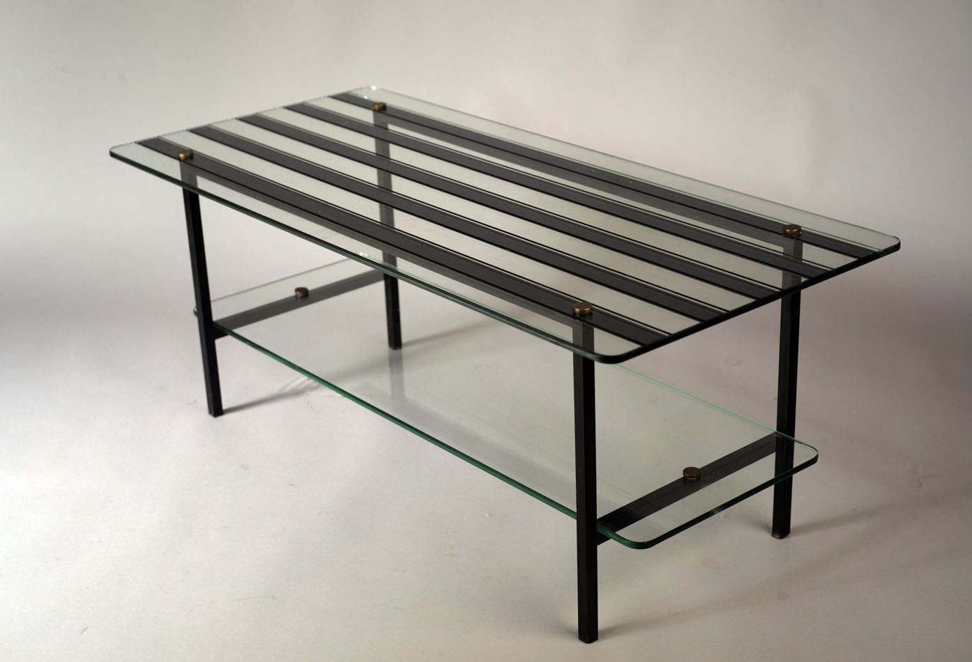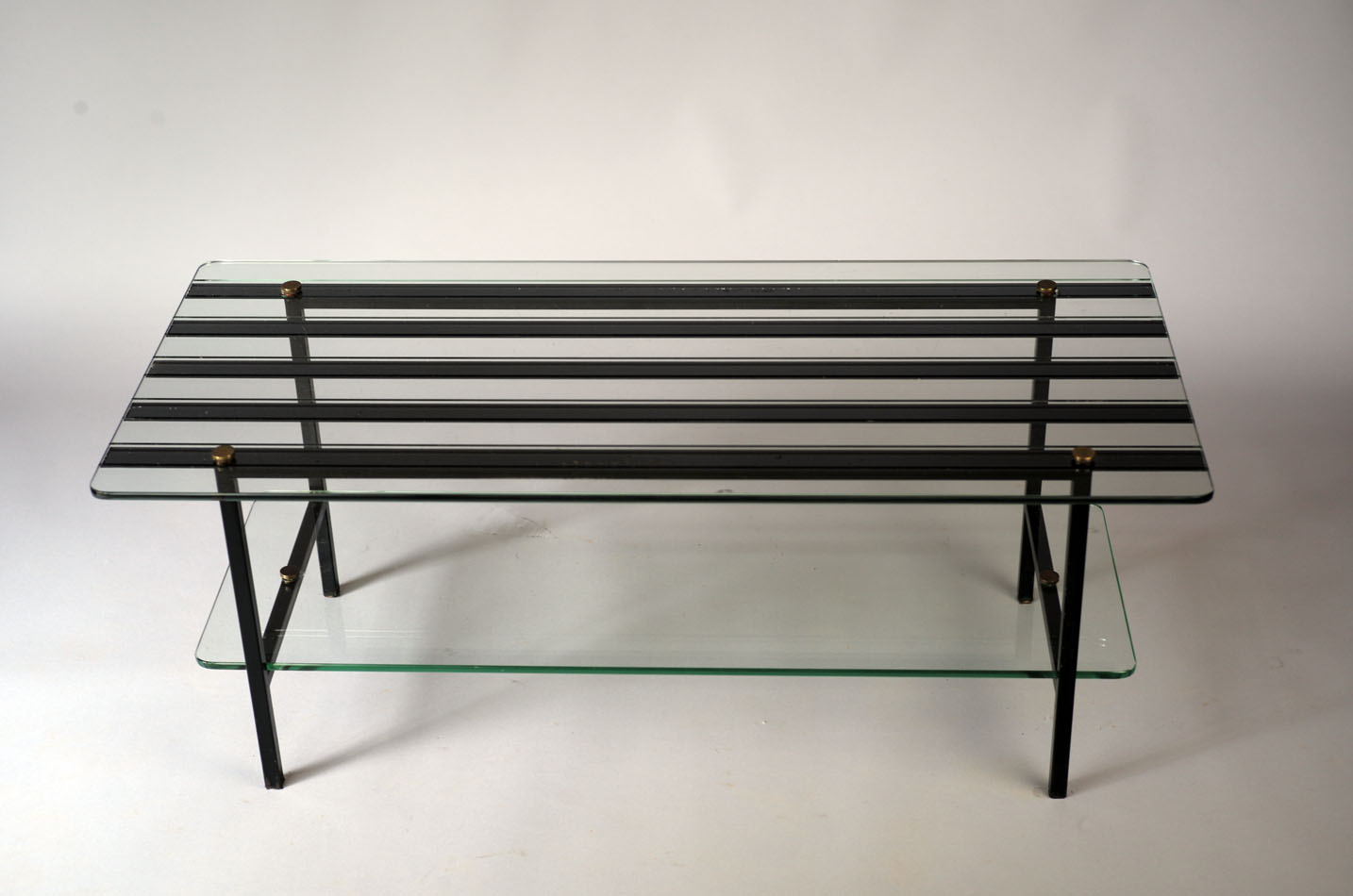 Elégante table de salon à double plateau de verre montées sur une armature en métal quadrangulaire laqué noir. Le plateau supérieur alterne des bandes de miroir délimitées par un chanfrein biseauté. Très bel état, épaisseur du verre 1cm.
