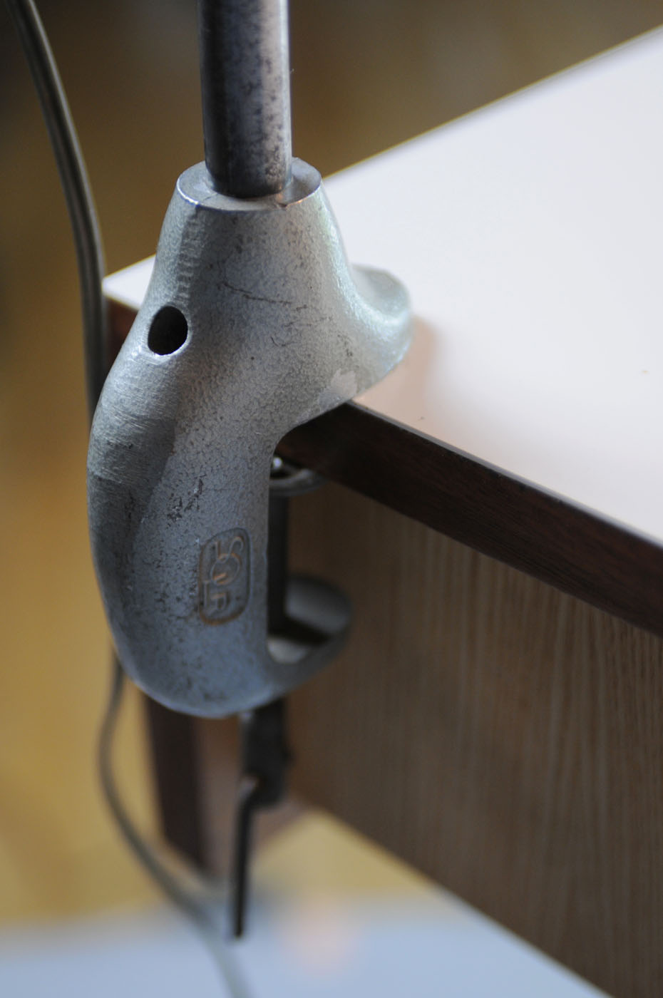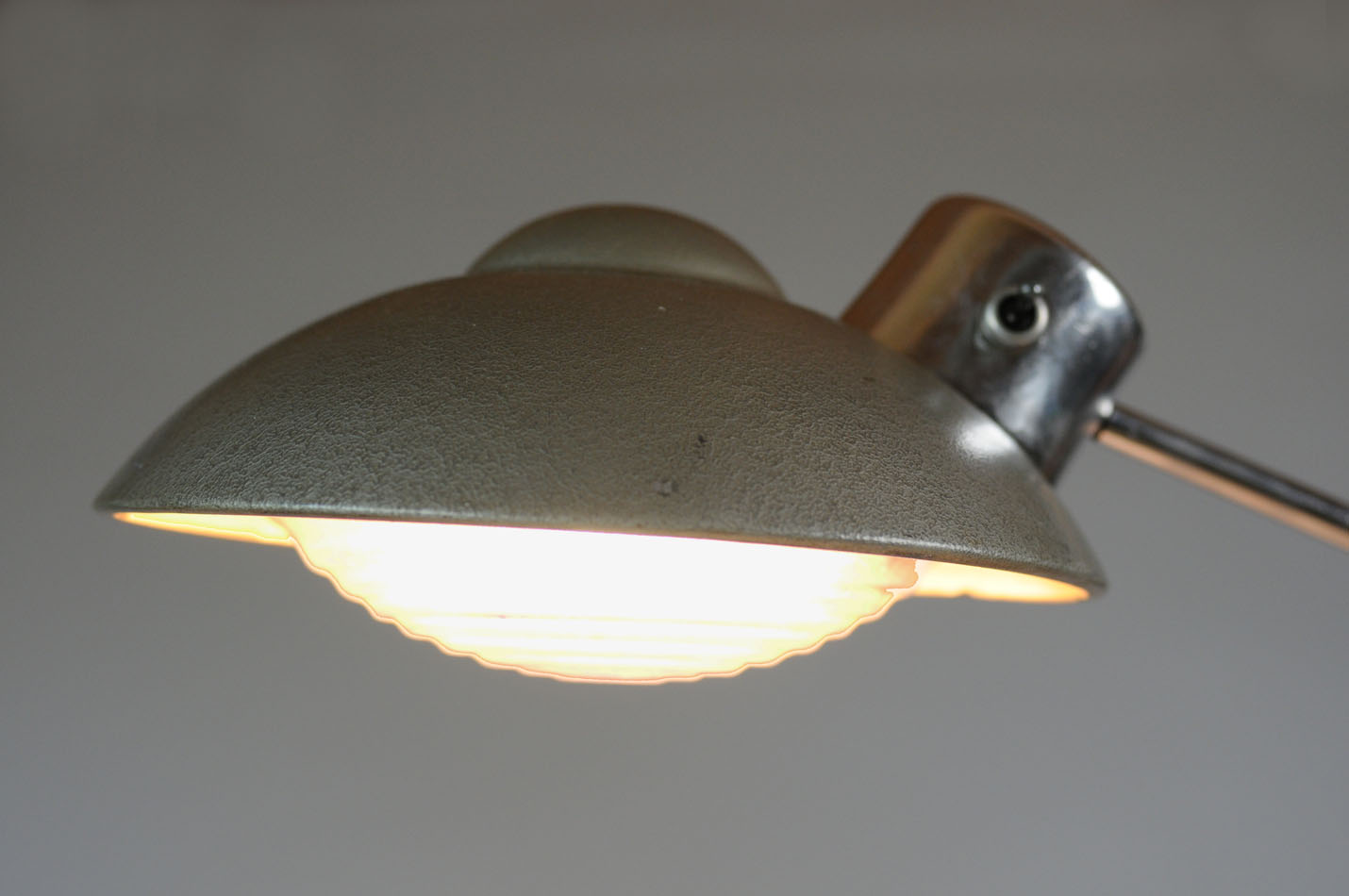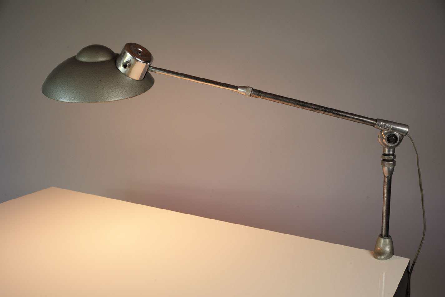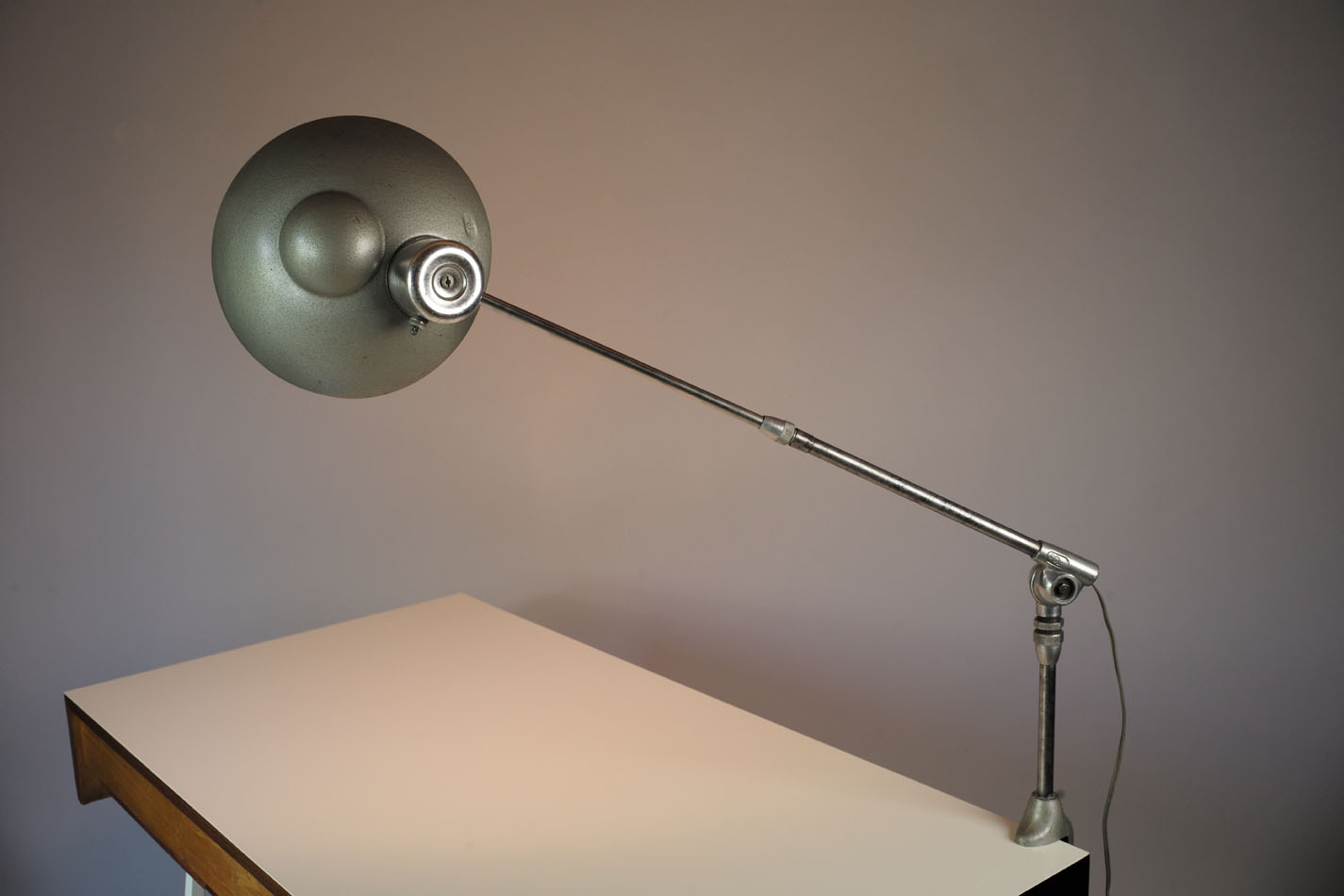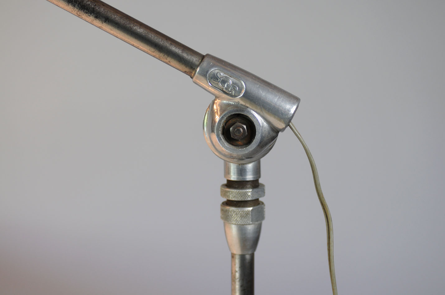 Produite dans les années cinquante pour un usage professionnel, cette lampe signée de Solr (Ferdinand Solère)est en métal et aluminium anodisé gris-vert. Le diffuseur Solrsol en résine bleu est clipsé dans le réflecteur. Bel état d'usage, électricité vérifiée.
