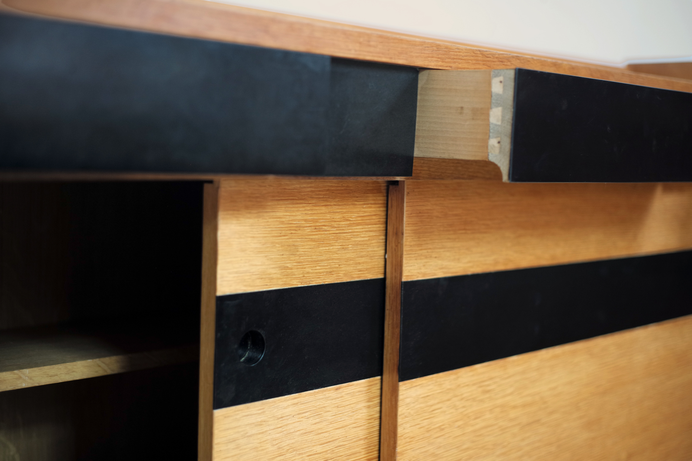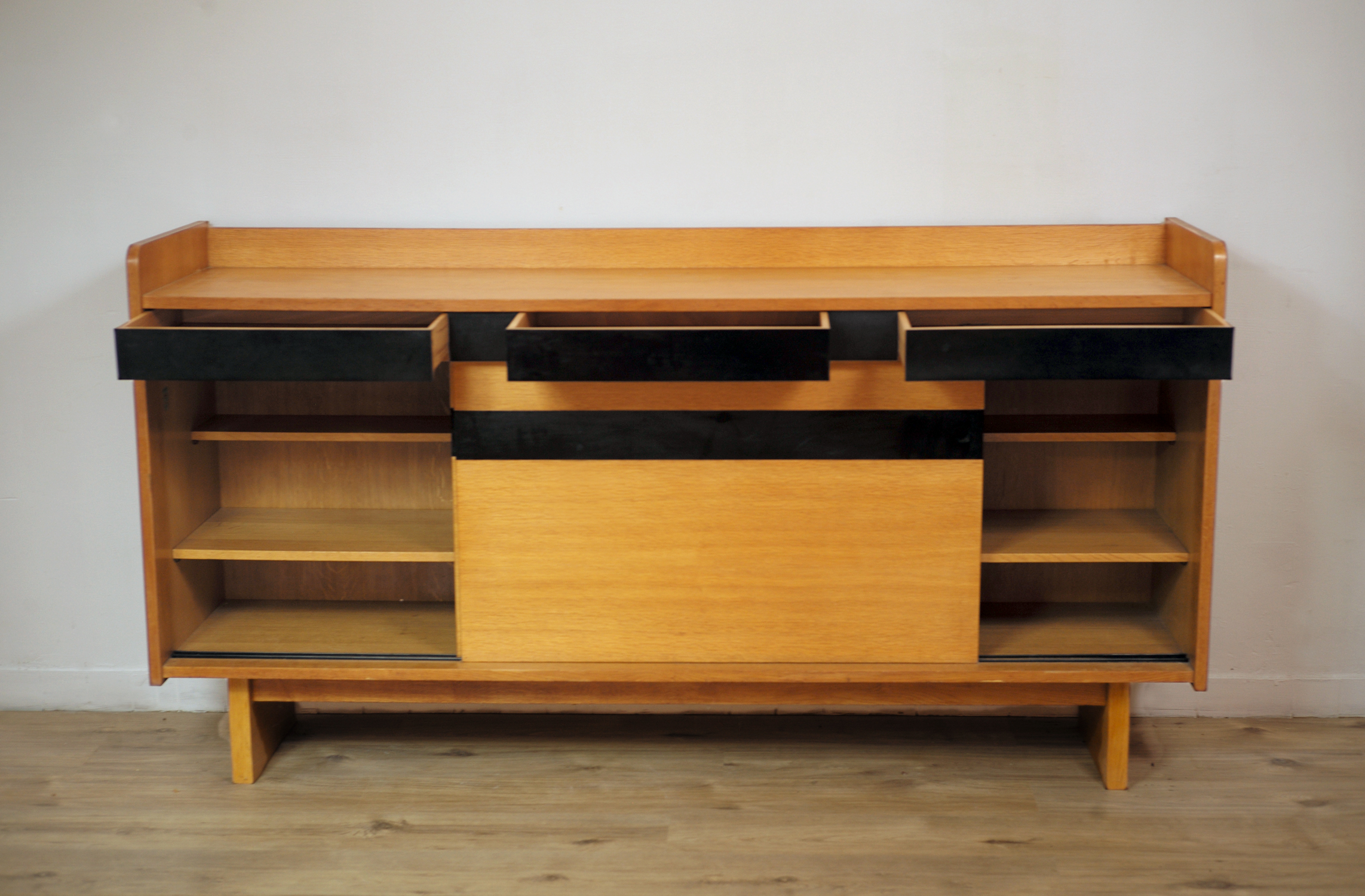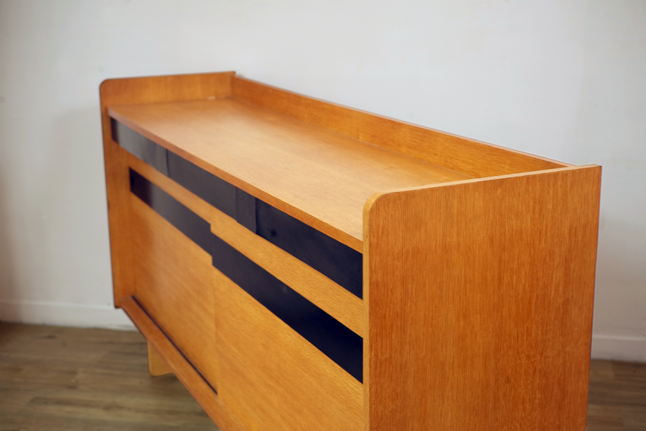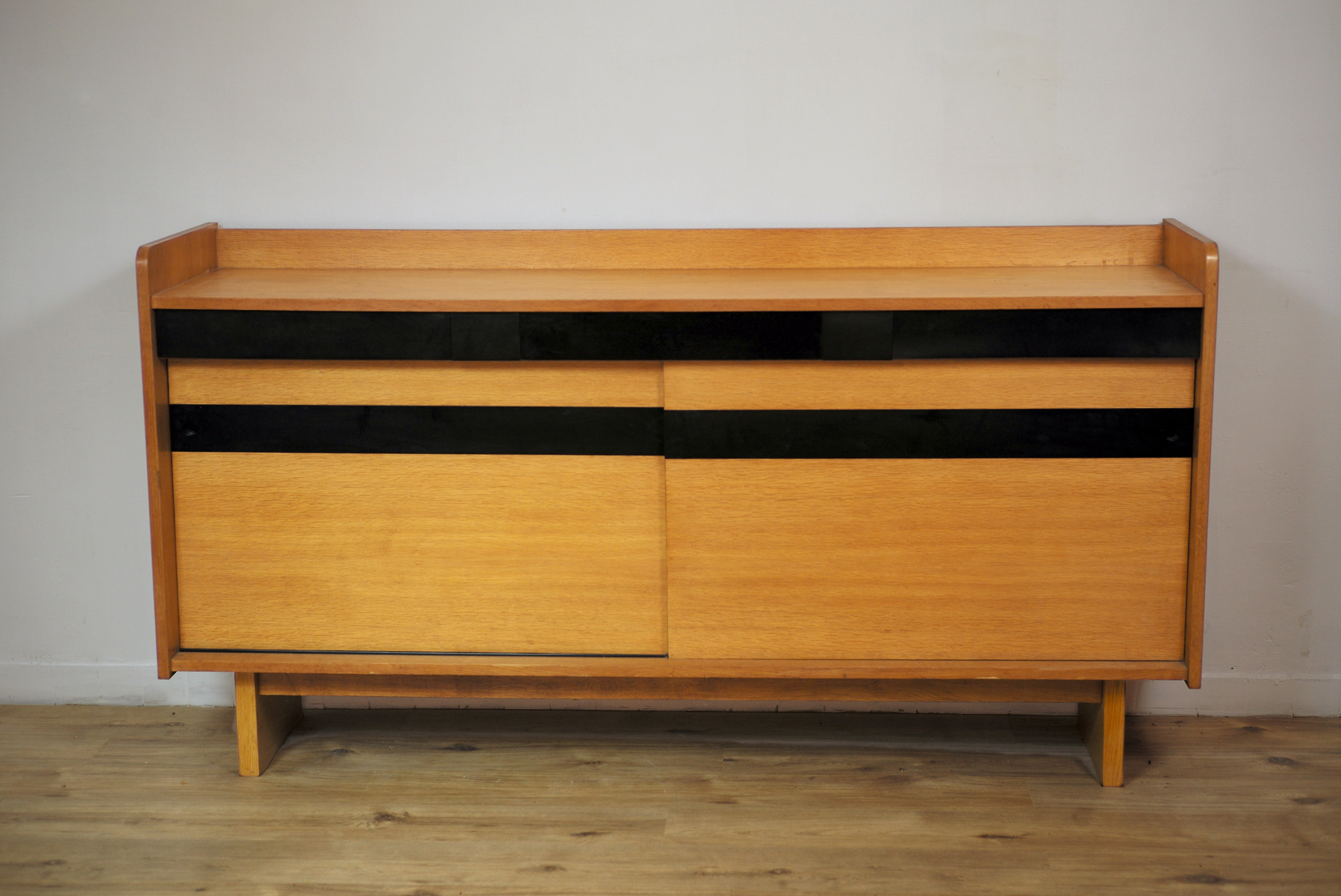 Enfilade à deux portes coulissantes et trois tiroirs en chêne blond, France 1950. Les prises des portes sont encastrées dans les larges bandeaux en formica noir. Le dessin avant-gardiste est à rapprocher des créations de Maurice Pré/Lieuvin.