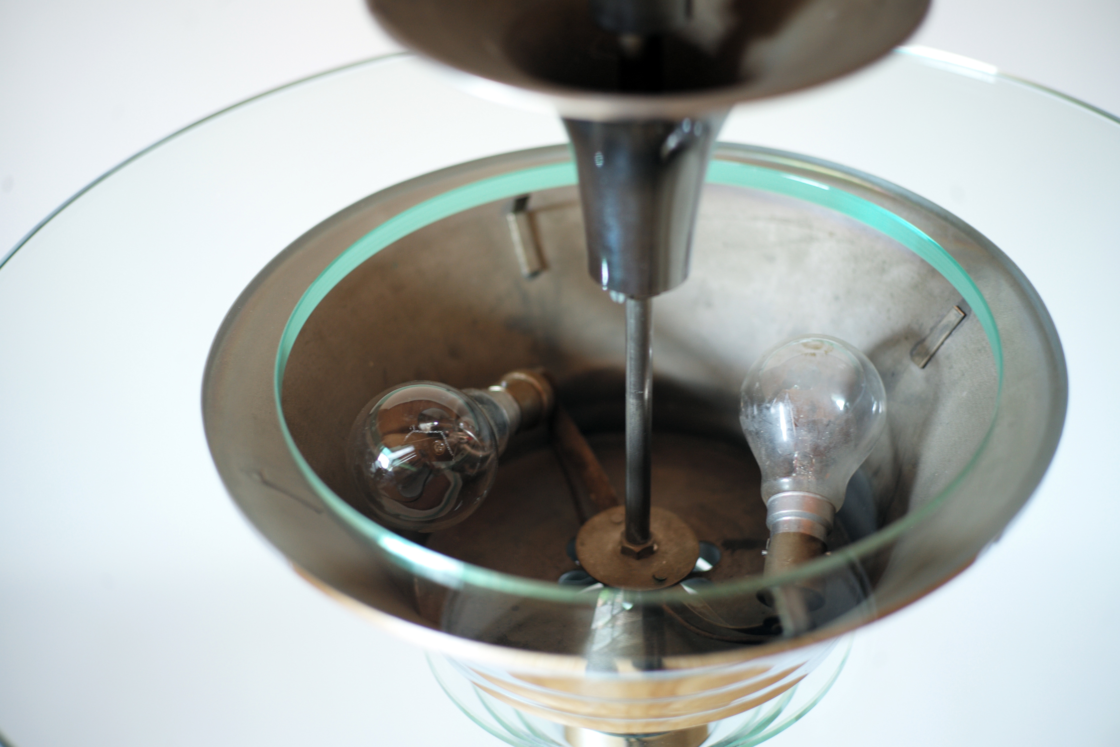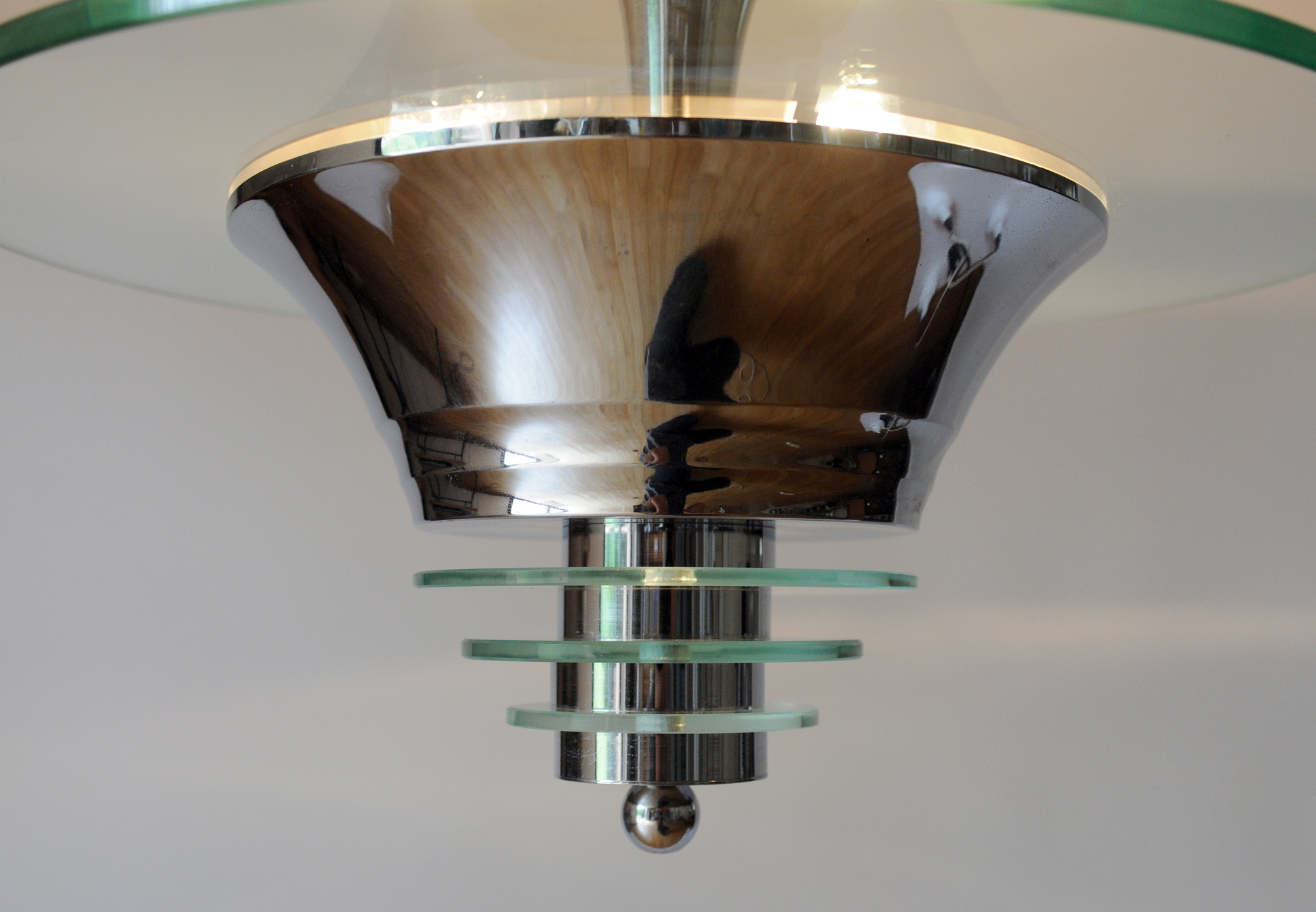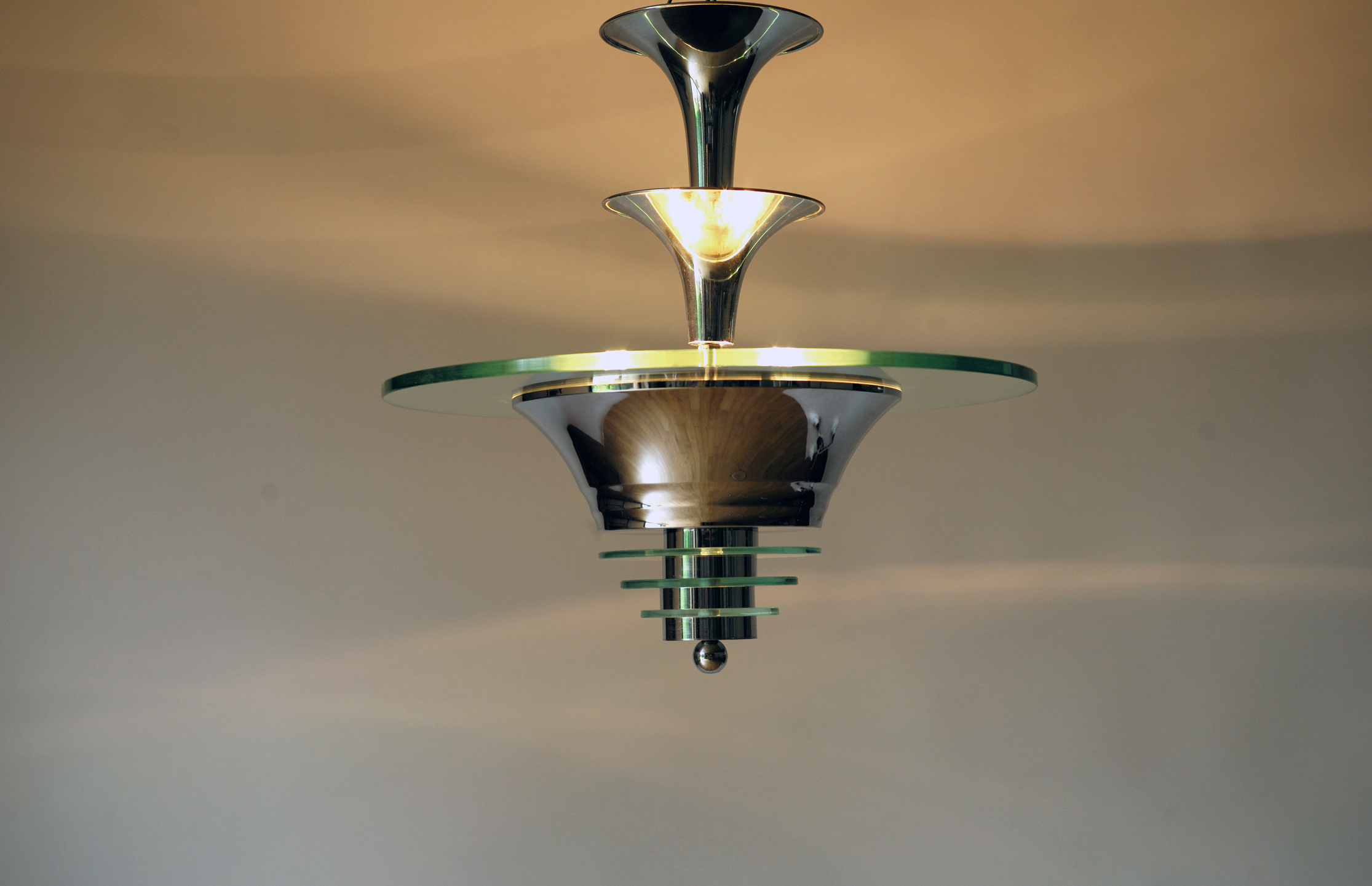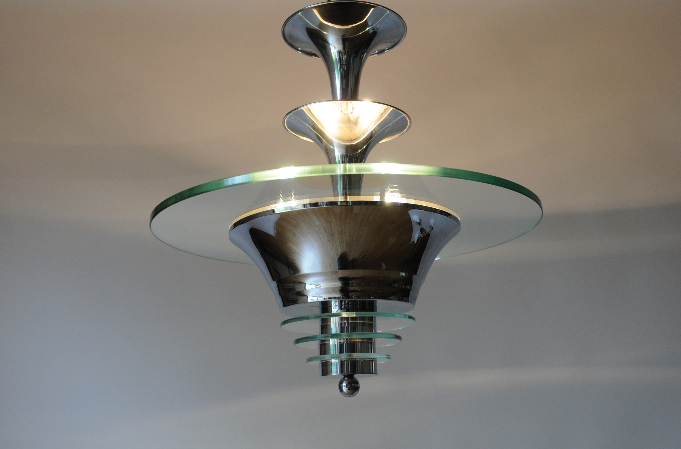Rare suspension moderniste en métal nickelé et anneaux de verre transparent attribuée à Genet et Michon, France 1930.