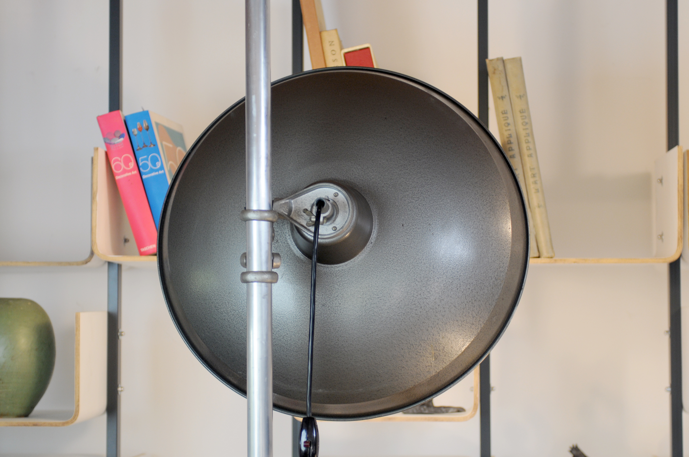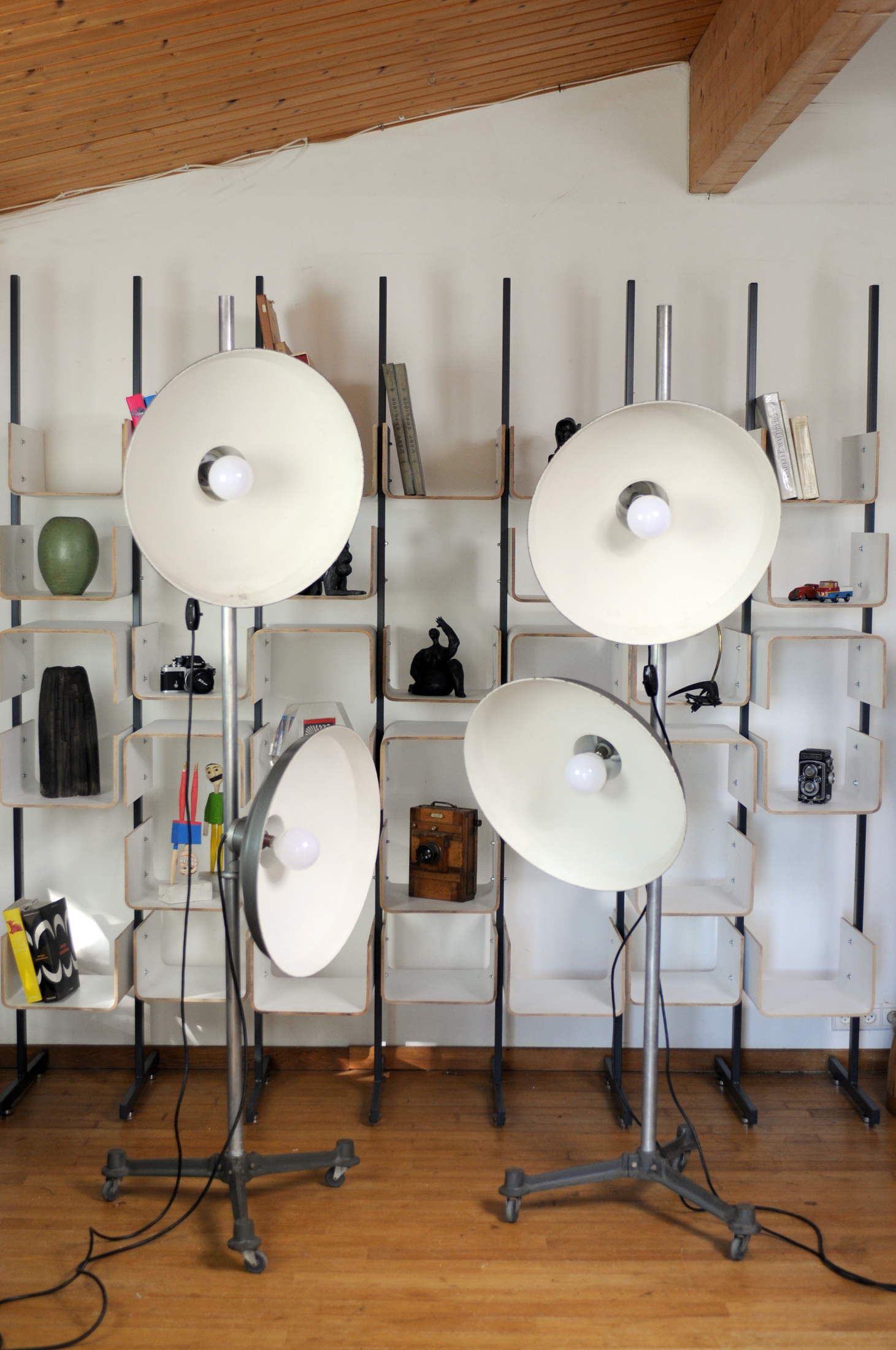 Rare ensemble de studio de photographe Cremer, France 1960. Lesté par un piètement en fonte à roulettes, chaque fût porte deux grands réflecteurs réglables et orientables par un ingénieux système d'étrier. Utilisés à l'origine avec des ampoules de 500w, ils sont équipés aujourd'hui d'ampoules basse consommation. La lumière est largement diffusée par les grandes gamelles, sans éblouir.