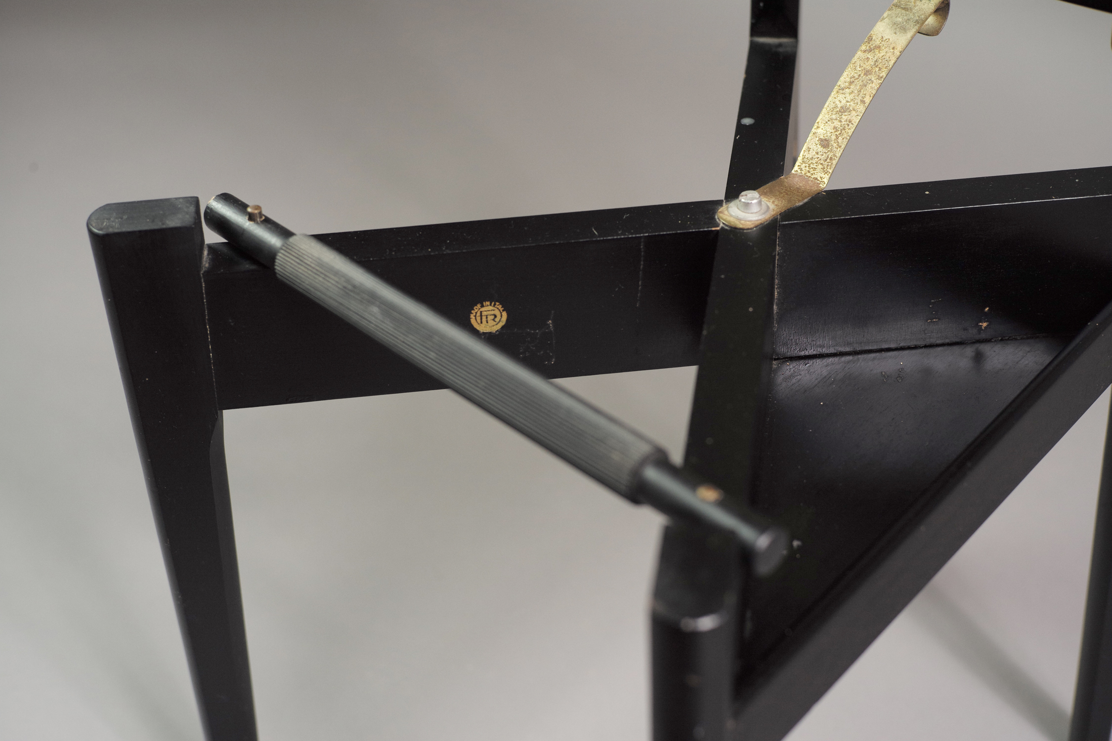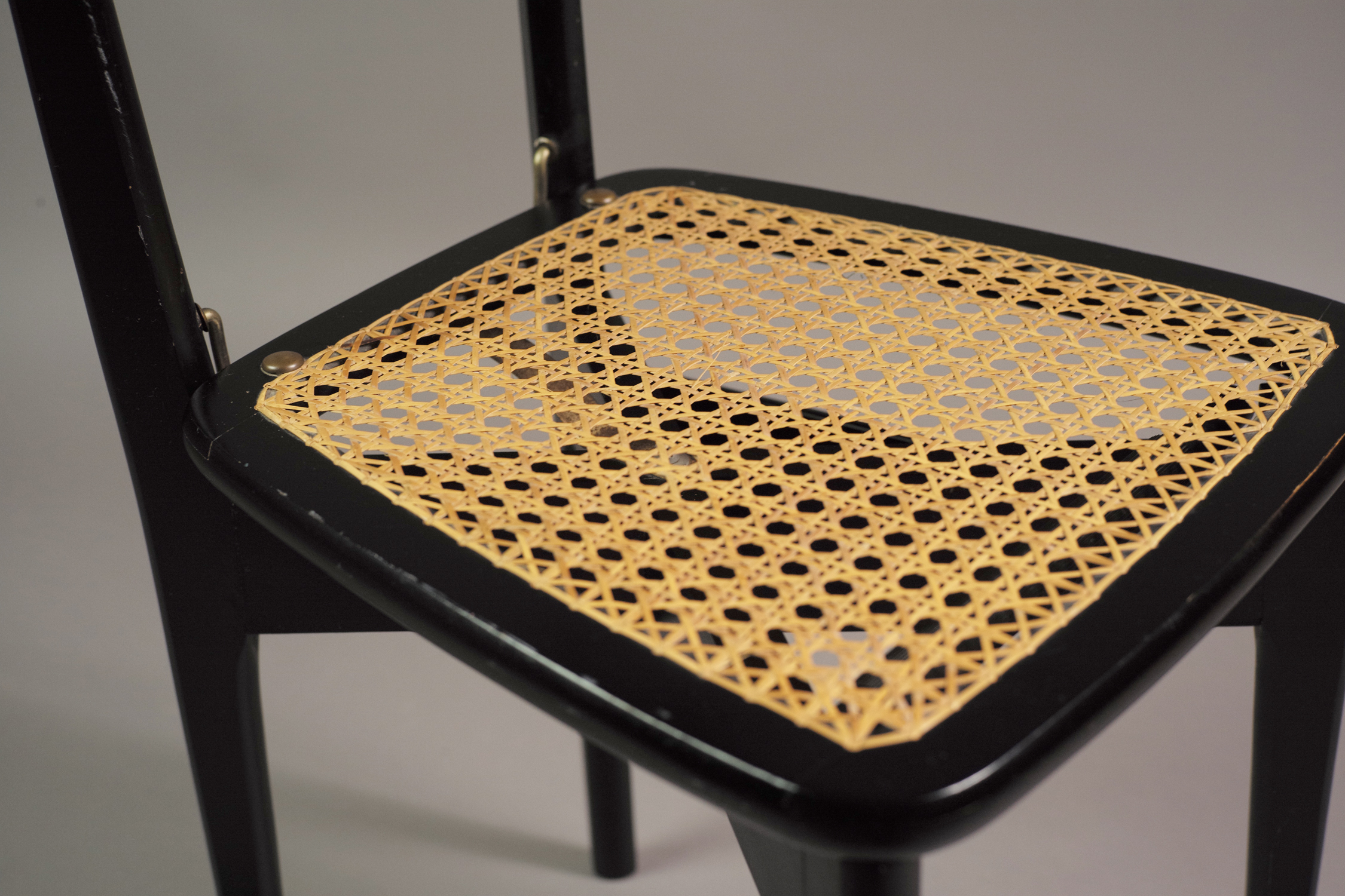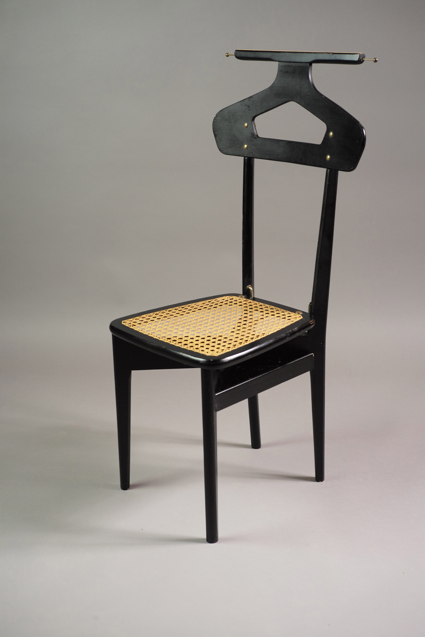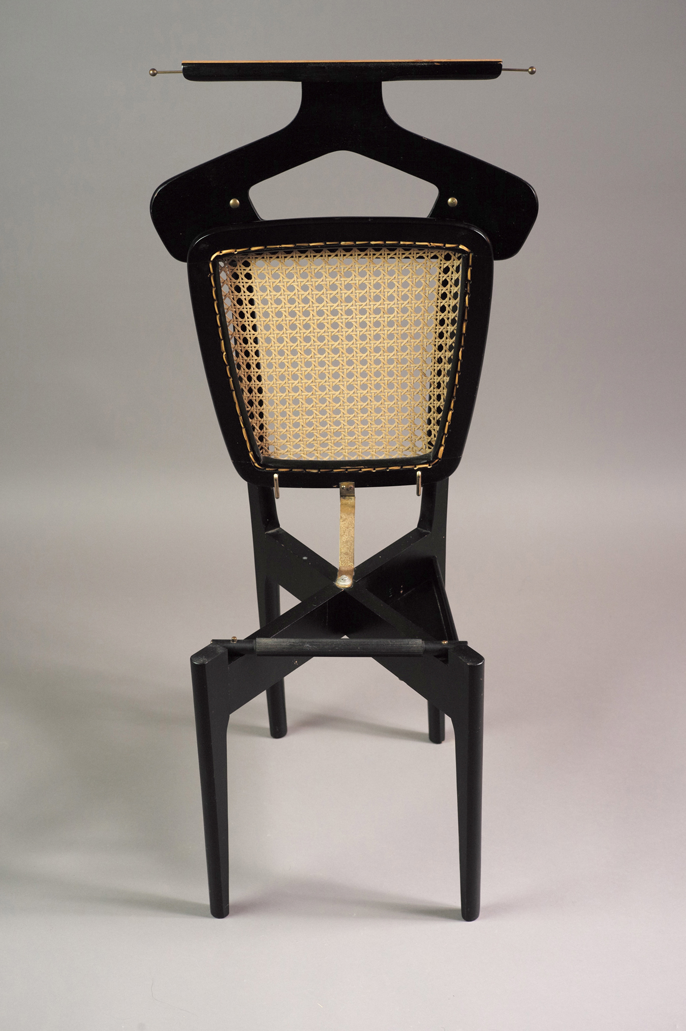 Valet de nuit en bois noirci à assise relevable cannée de la maison italienne Fratelli Reguitti, Italie 1950. Rehaussé par quatre boulons laitonnés, le dossier en forme de cintre accueille deux portes cravates rétractables. Un ressort permet le verrouillage de l'assise relevée, découvrant un logement et une barre habillée de caoutchouc.