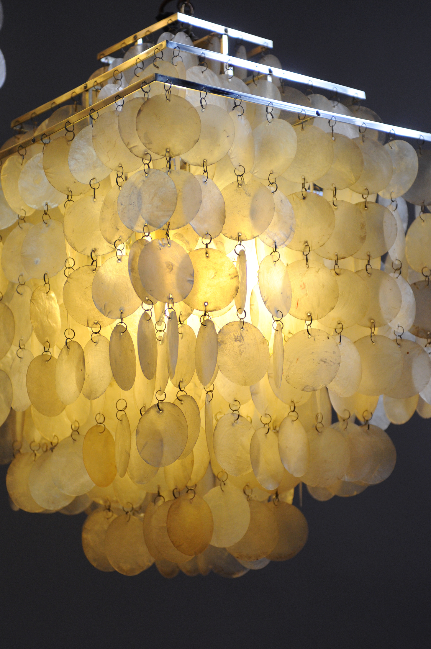 Paire de lustres "Fun" de Verner Panton pour J. Lüber, Suisse 1964. Version à structure quadrangulaire en métal chromé à trois gradins, disques en nacre. Edition des années 60 en très bon état, quelques restaurations sur les disques.