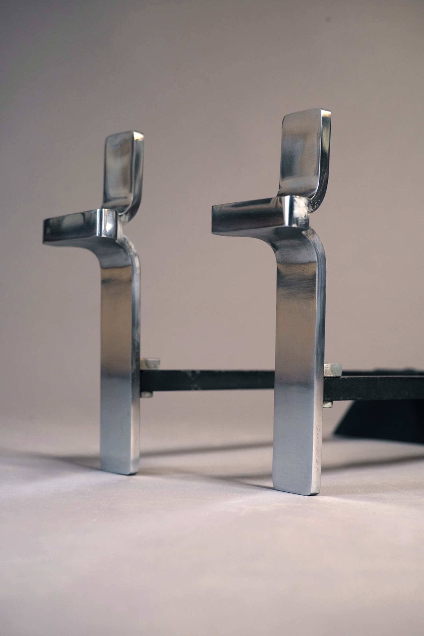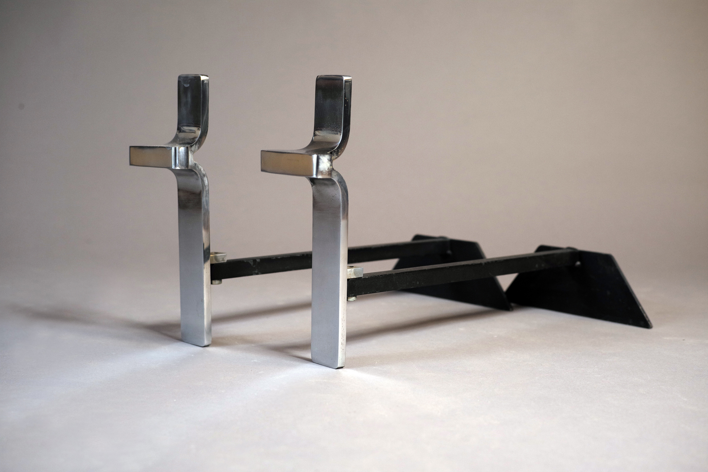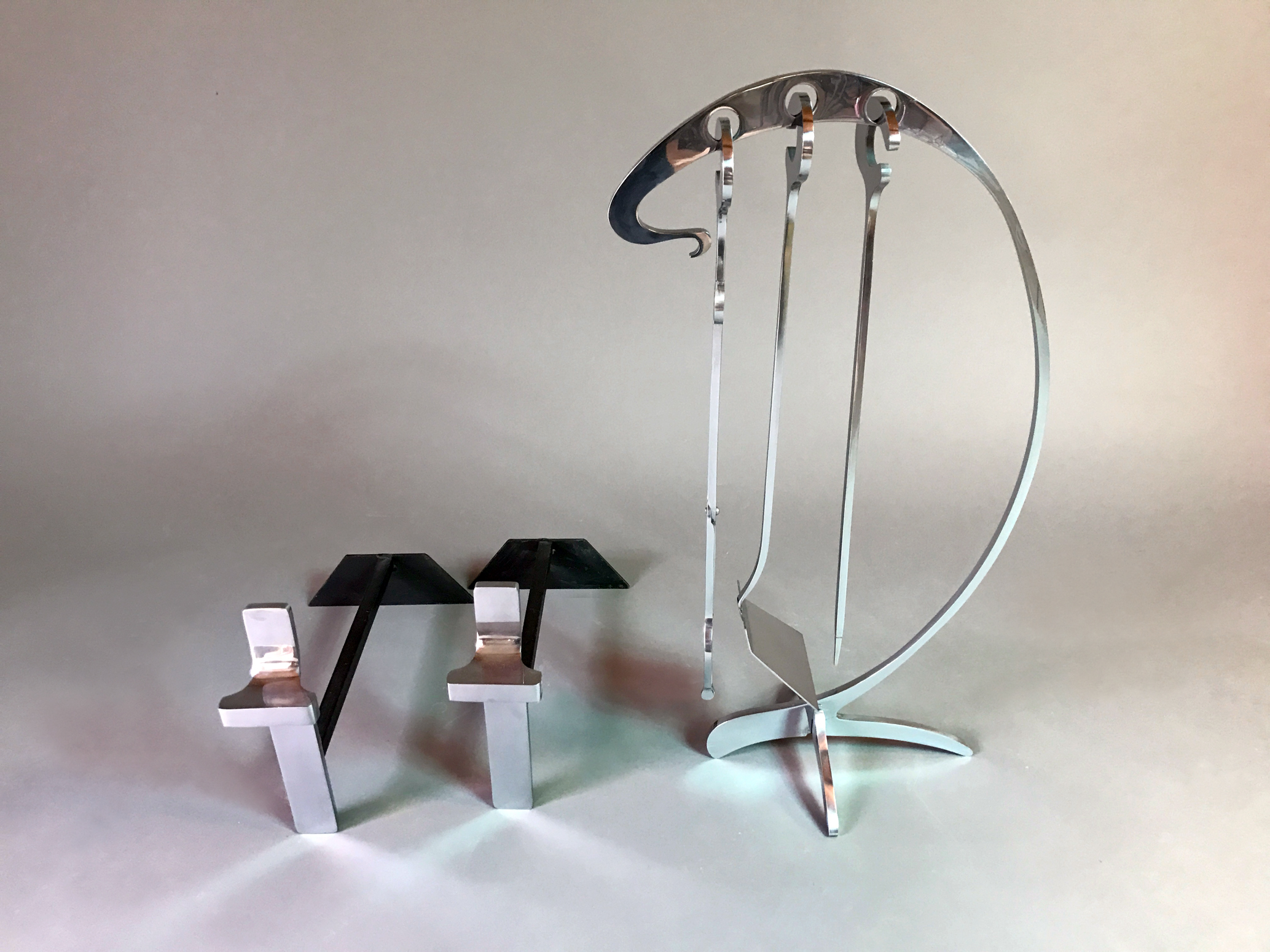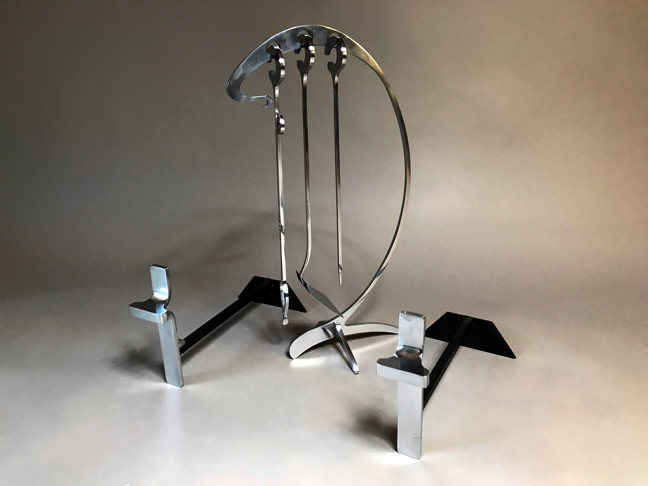 Rare ensemble de Jacques Charles pour la maison Jean-Paul Créations se composant d'un serviteur de cheminée avec ses trois accessoires et d'une paire de chenets.