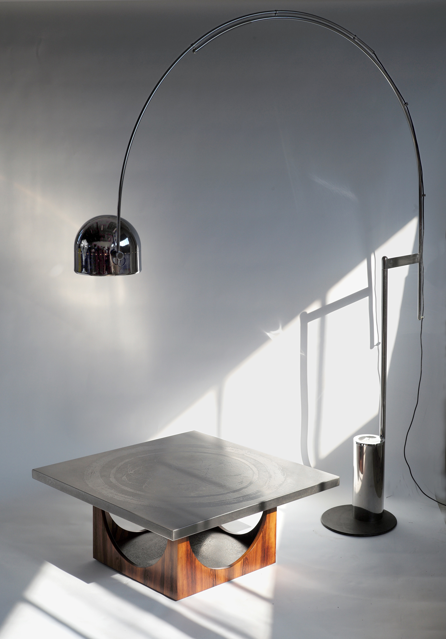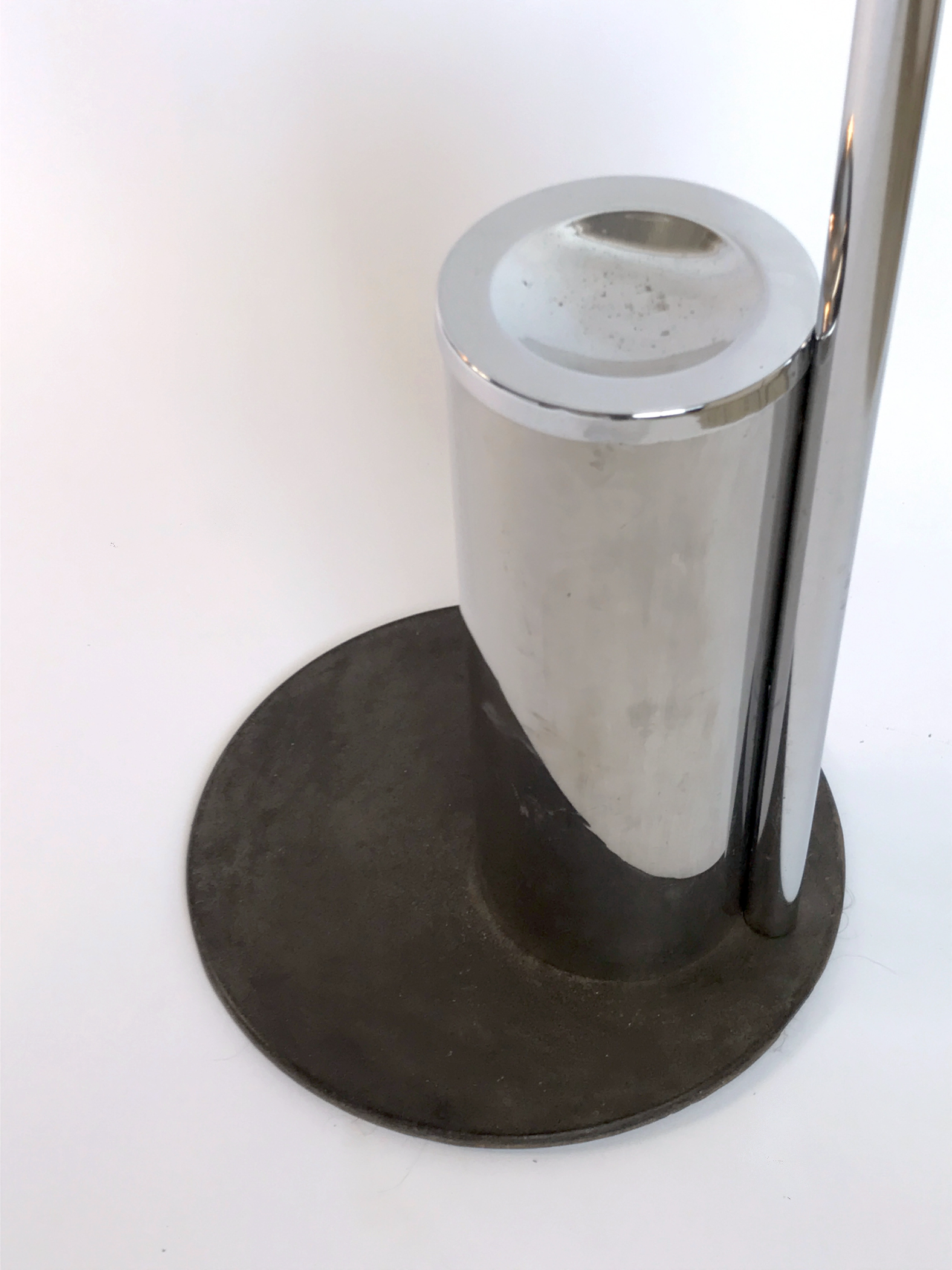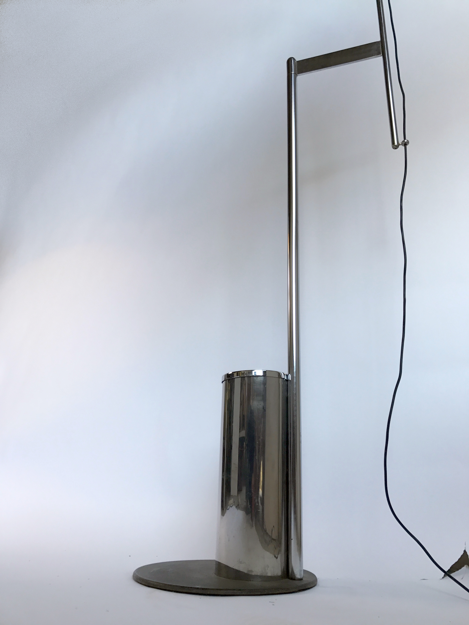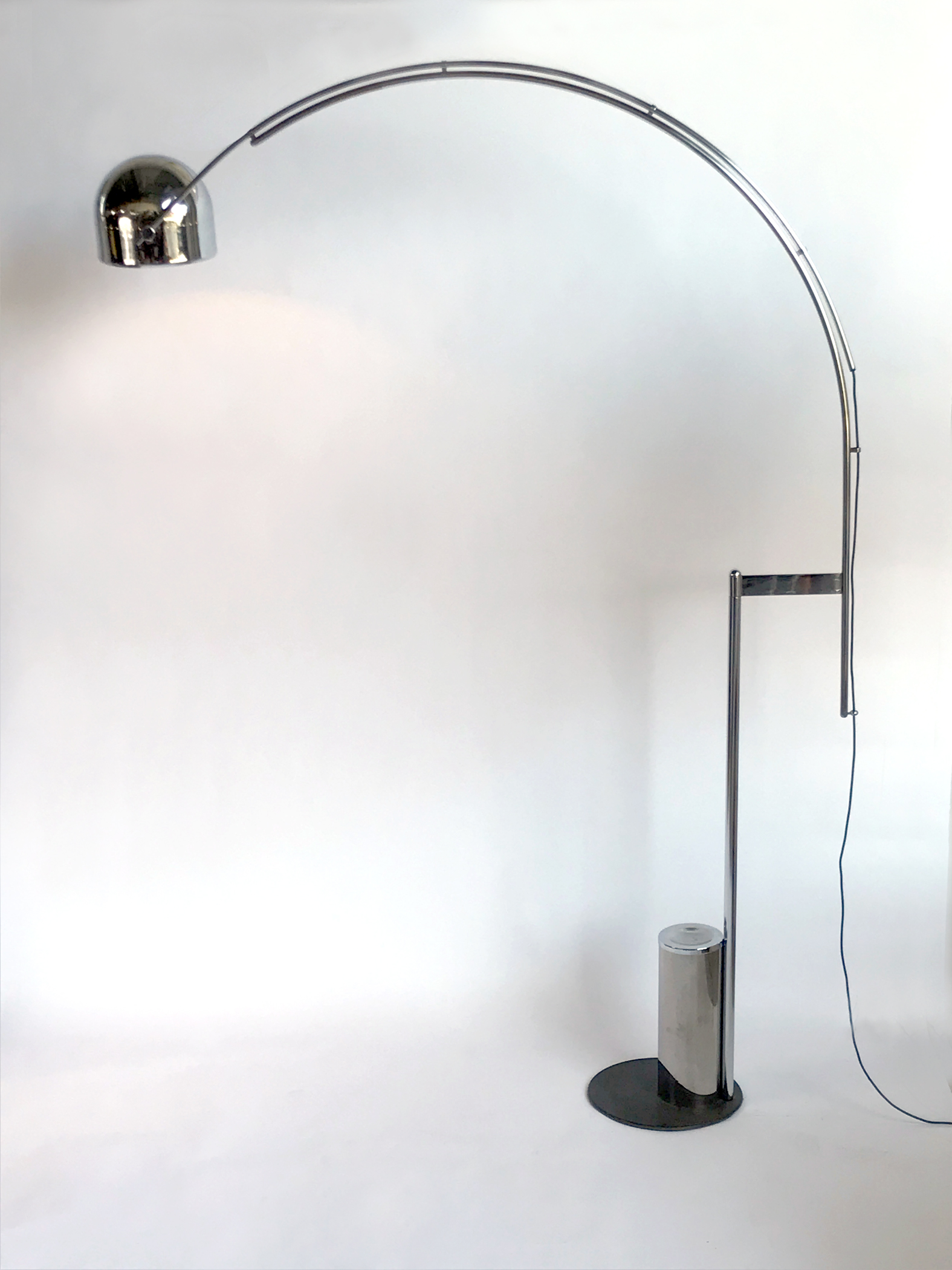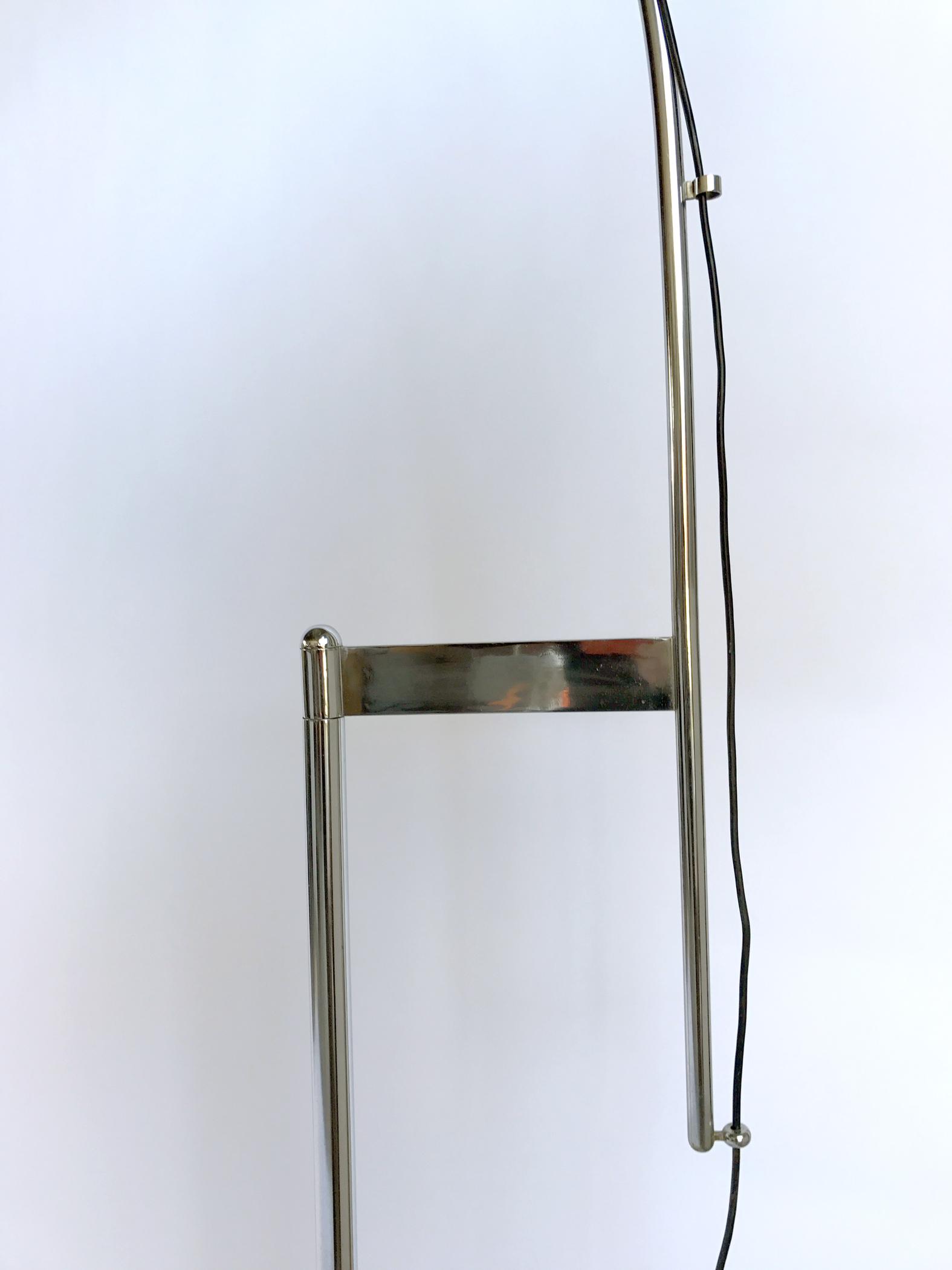 Grand lampadaire Arc de la maison Lamperti, métal chromé, Italie 1970. Lourdement lesté par une gueuse en fonte placé dans le cylindre du piètement, le double bras coulisse et pivote. Le dessin minimaliste, les proportions (250 cm du hauteur) concourrent à l'élégance de ce rare luminaire.