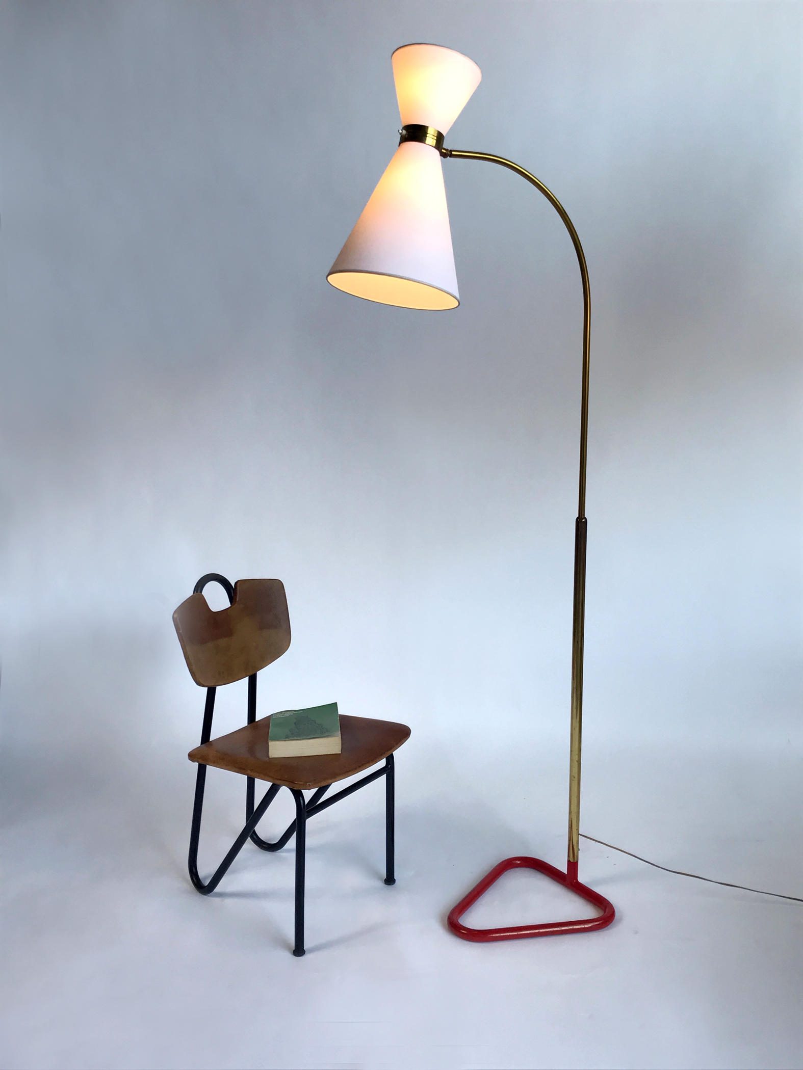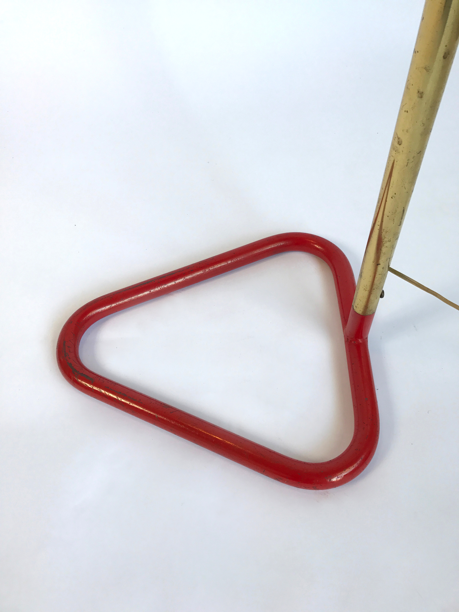 Grand lampadaire à double réflecteur articulé par rotule, piètement en acier massif triangulaire laqué rouge, fût en laiton doré. Maison Lunel, France 1950