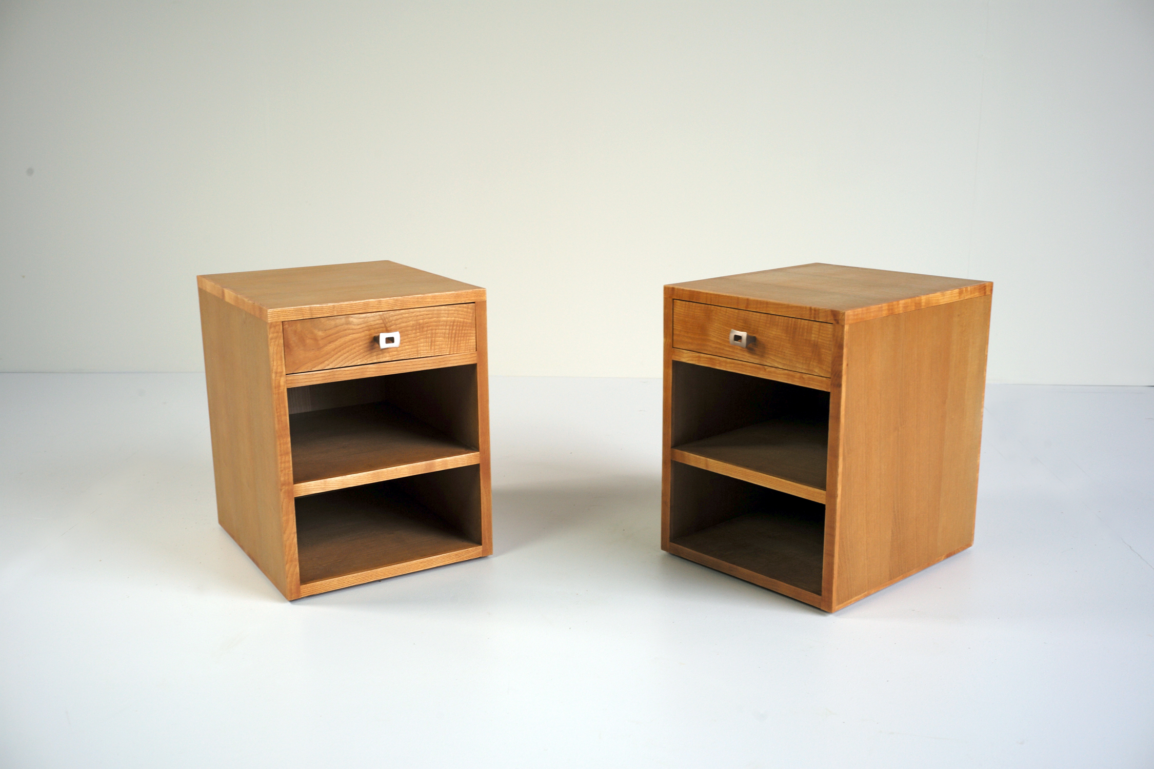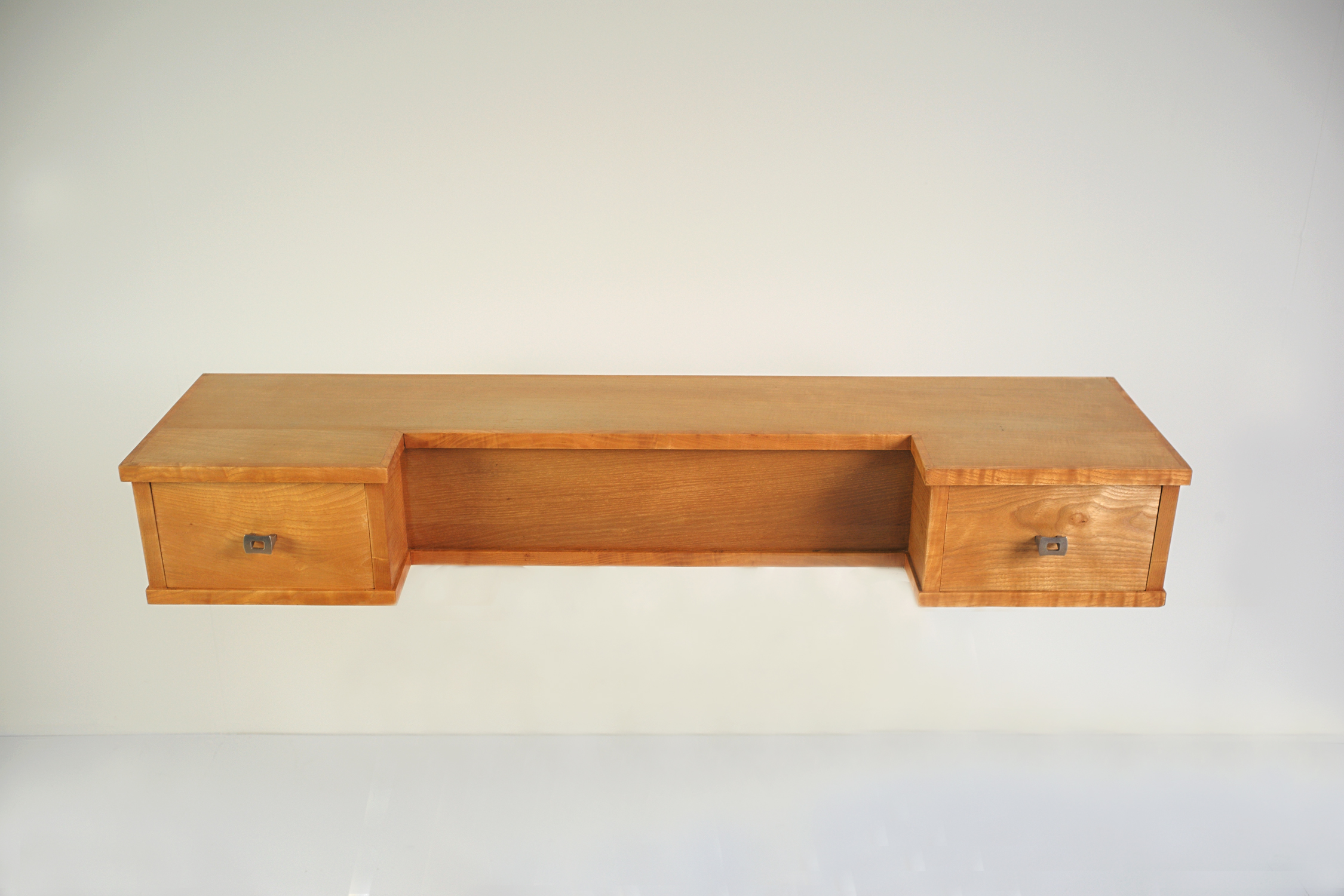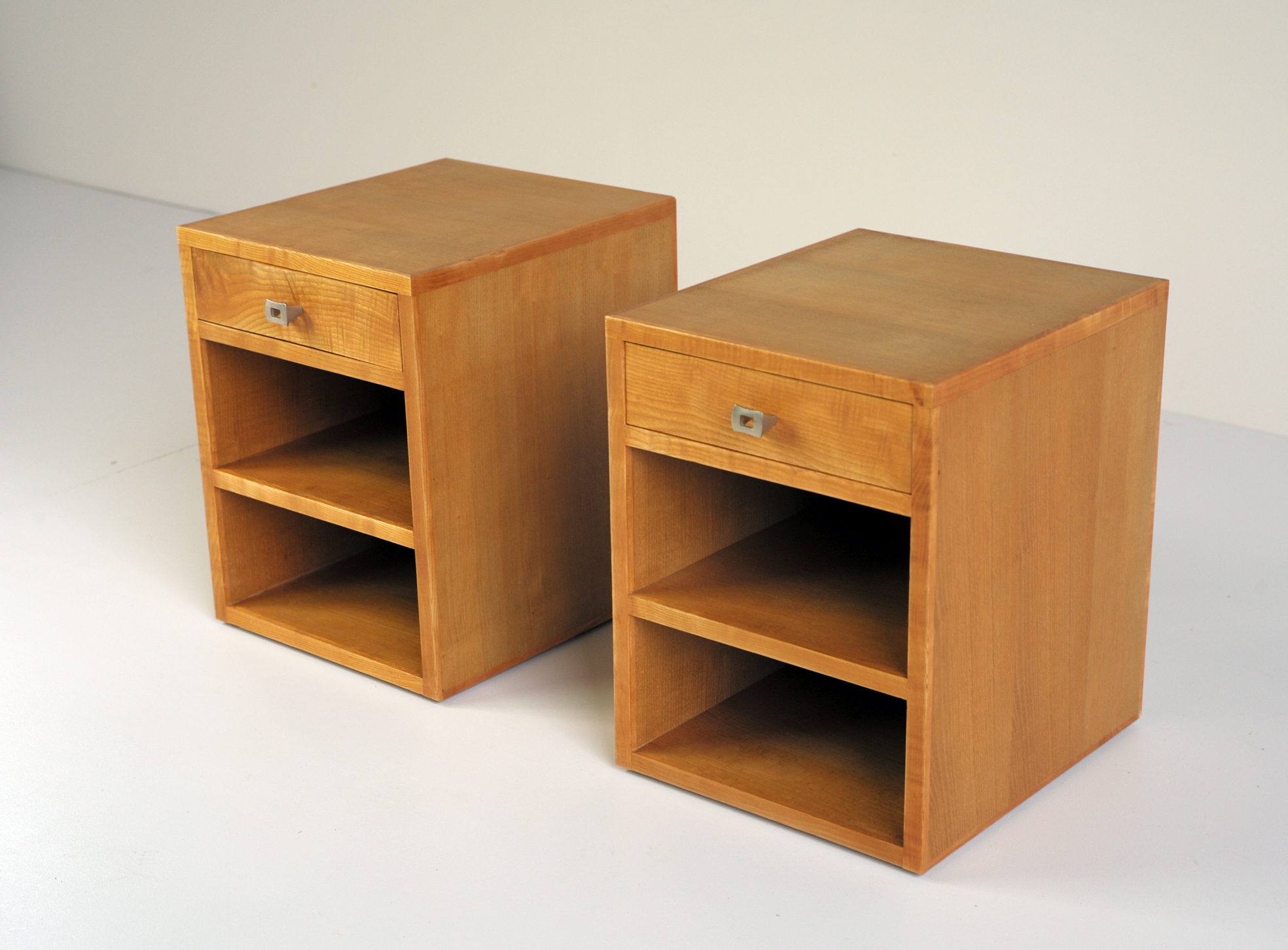 Ensemble composé d'une console murale à deux tiroirs et d'une paire de chevets, Frêne, France 1970.