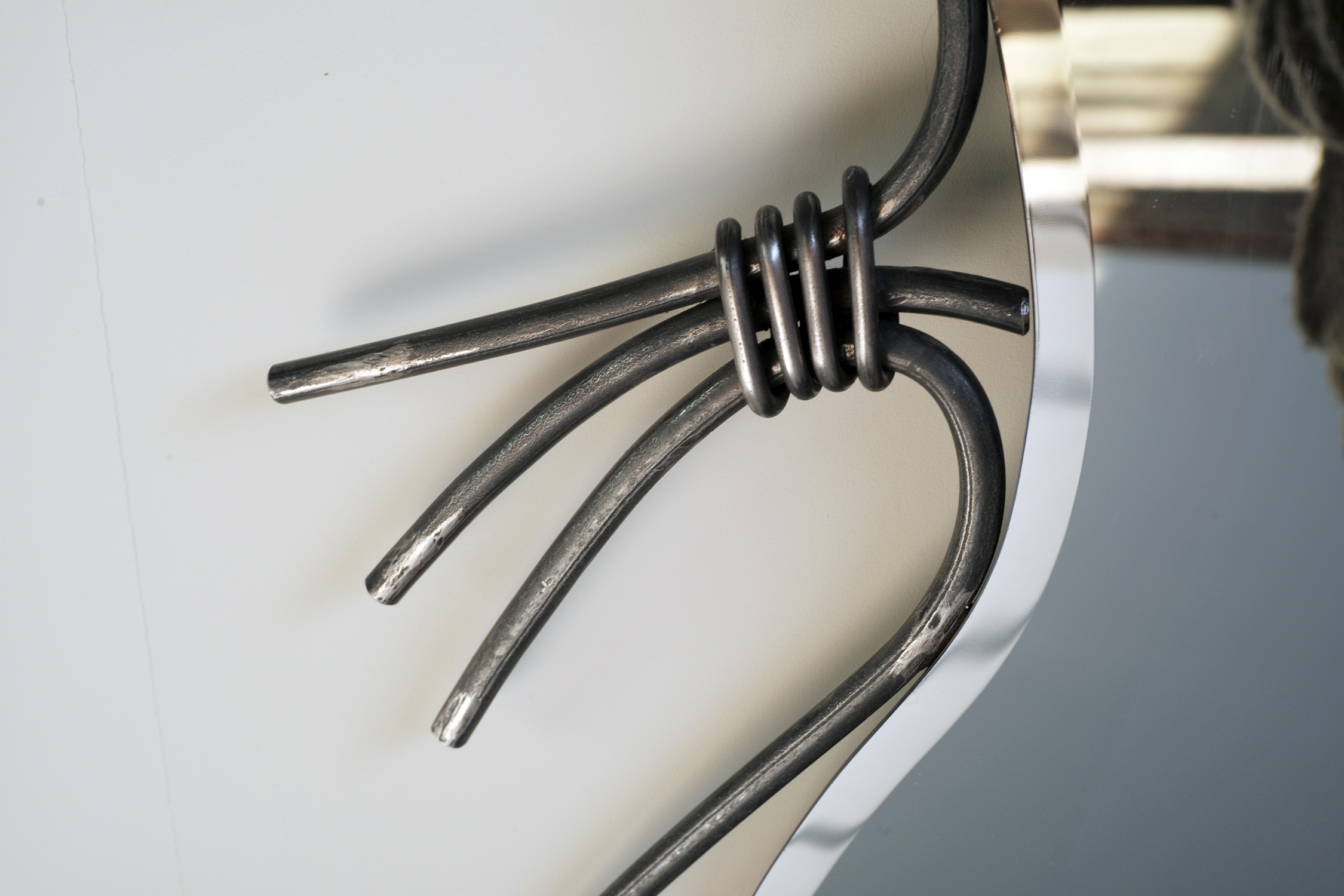 Grand miroir en fer battu à décors de ligatures, France 1950. La glace biseautée de forme rognon est fixée sur un encadrement en rondin de fer, battu à chaud. Métal patiné, traces de peinture bleu au dos. Très bel état.