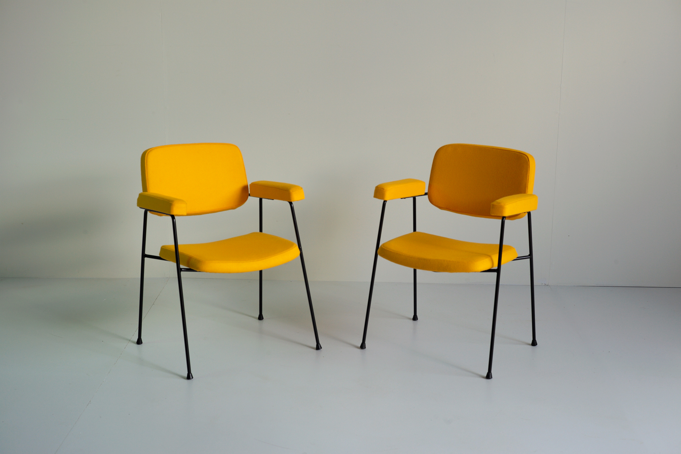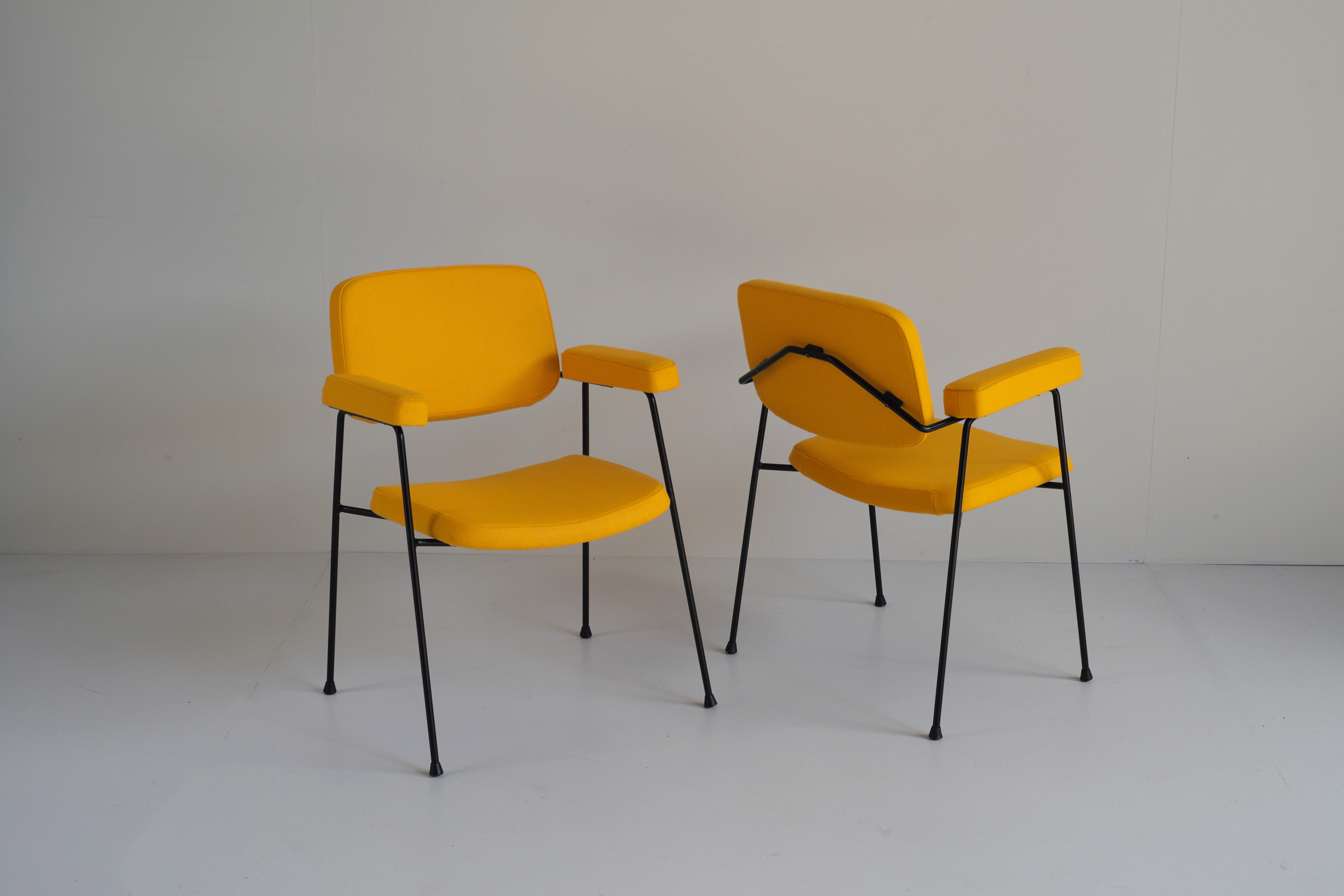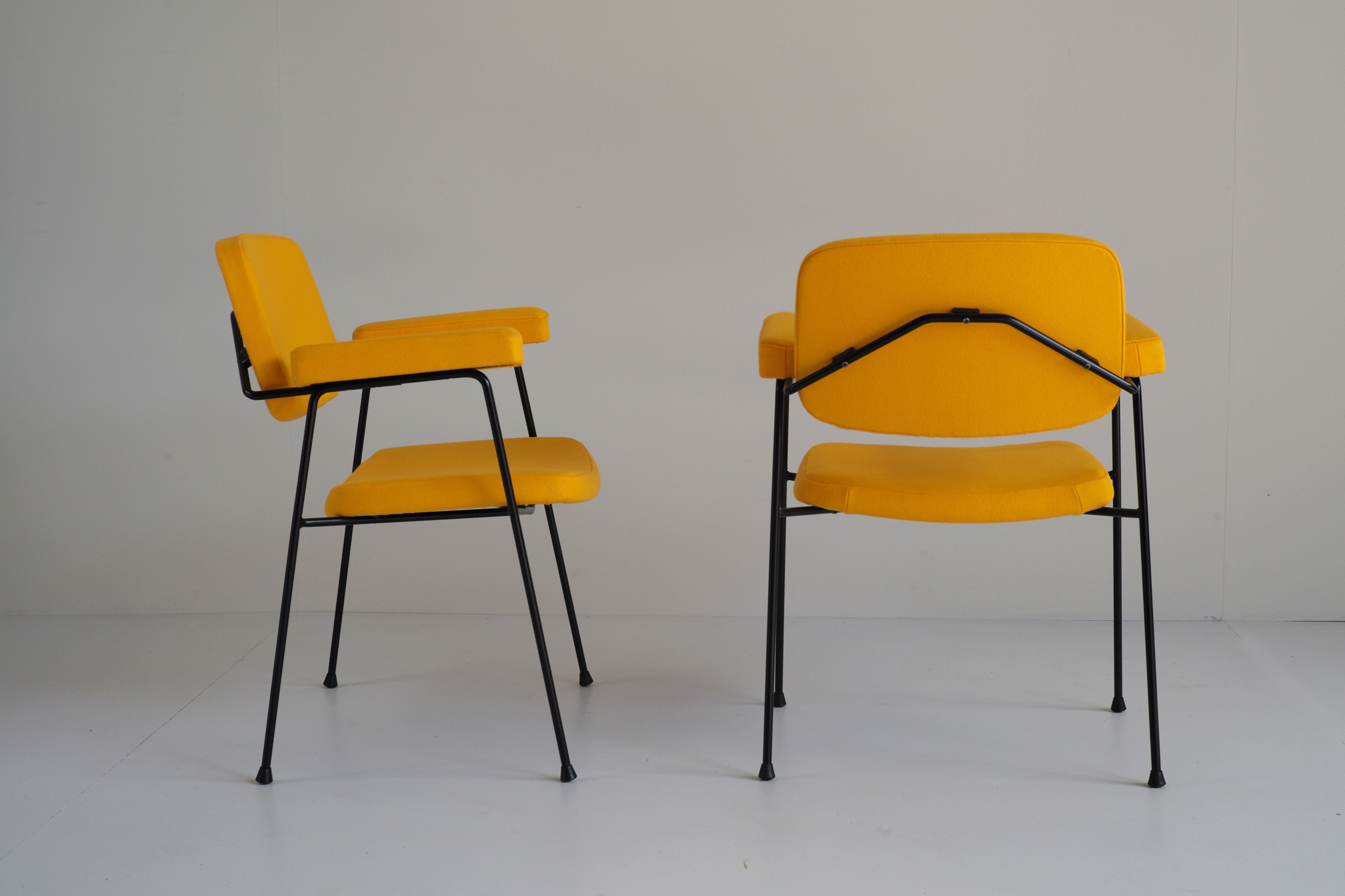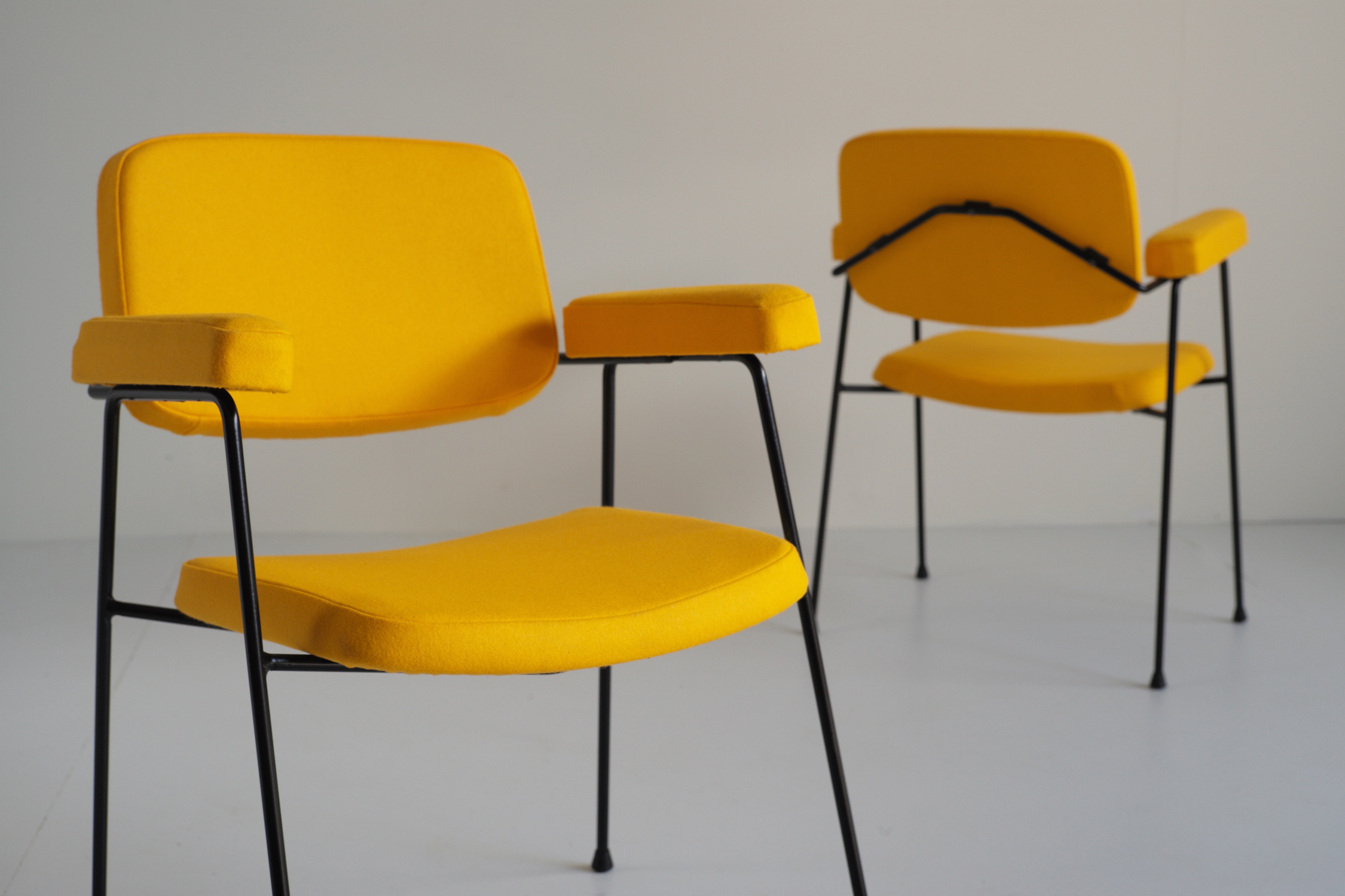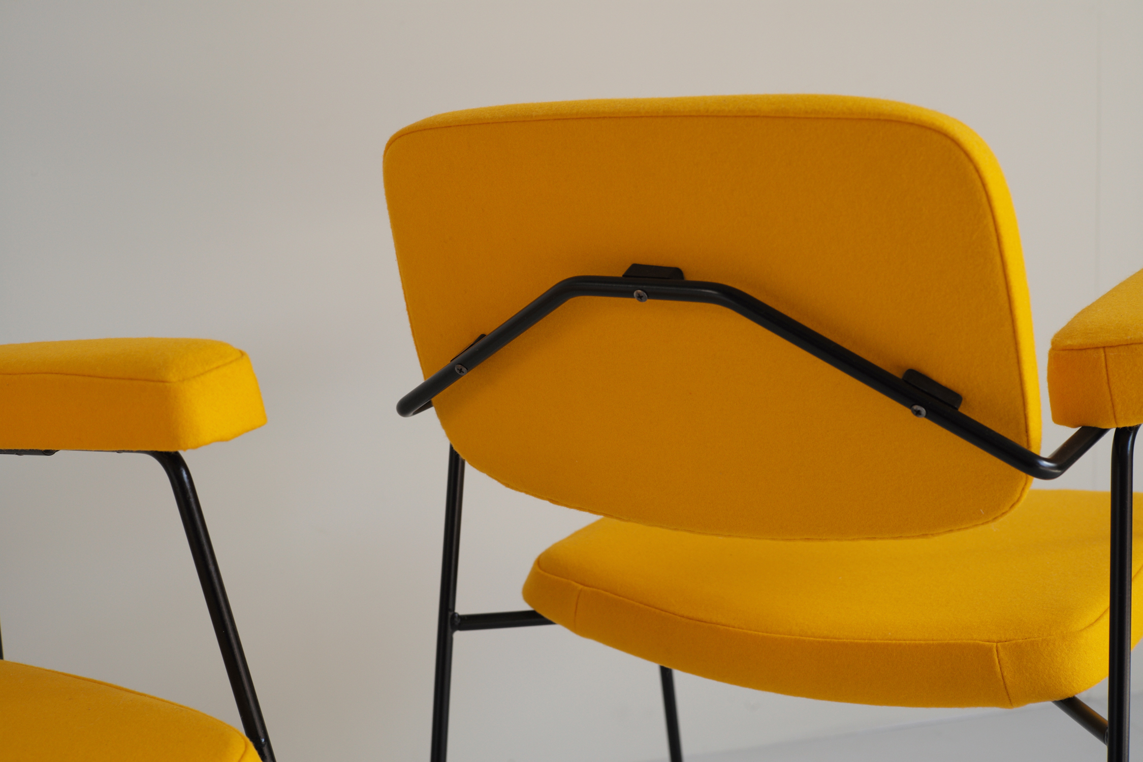 Paire de fauteuils CM 197 créés par Pierre Paulin pour Thonet, France 1958. Ils ont fait l'objet d'une restauration complète, piètement laqué époxy noir, retapissés en laine Kvadrat Divina jaune.