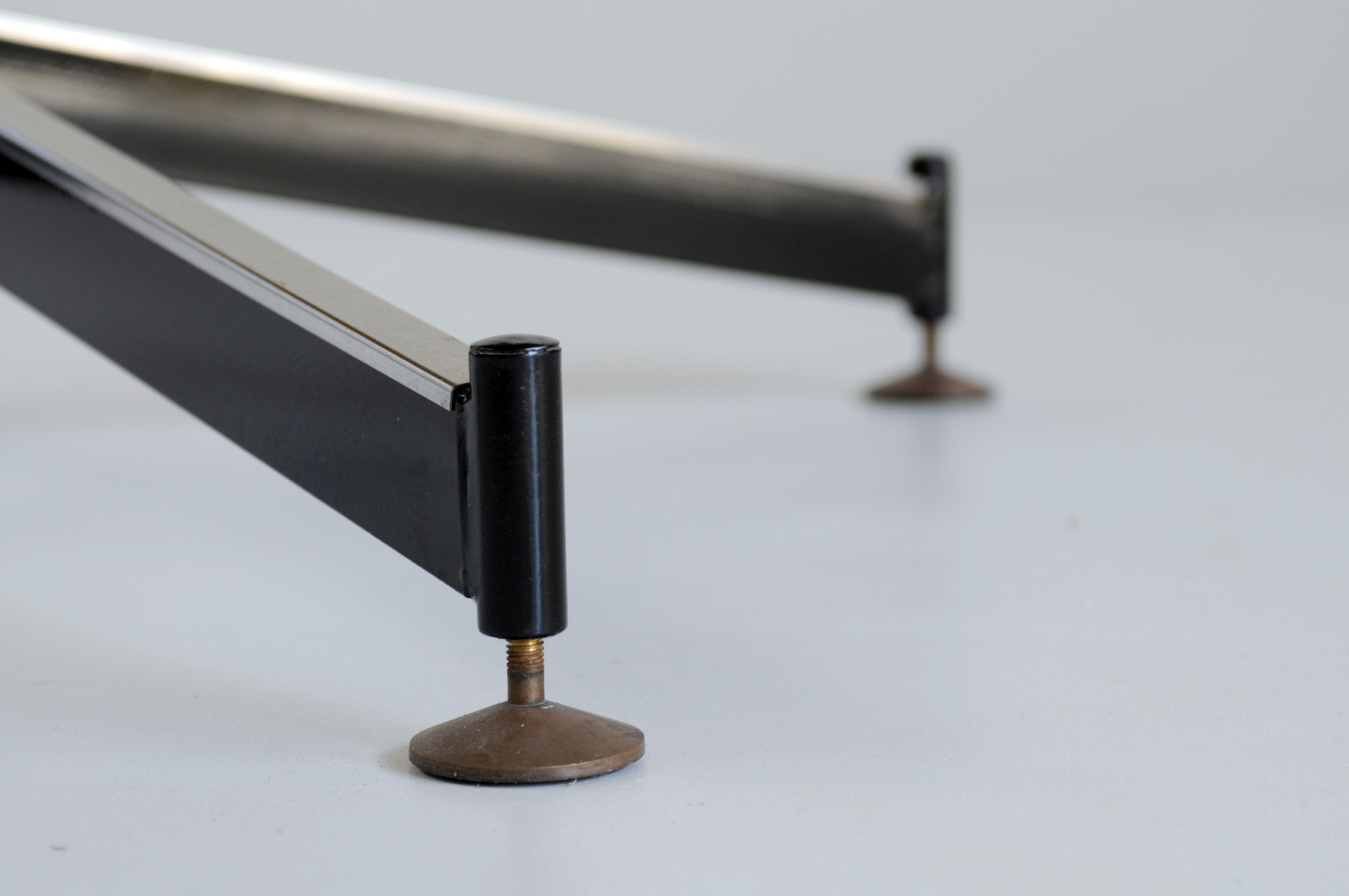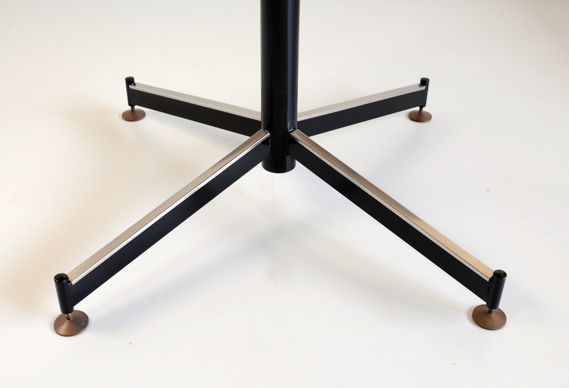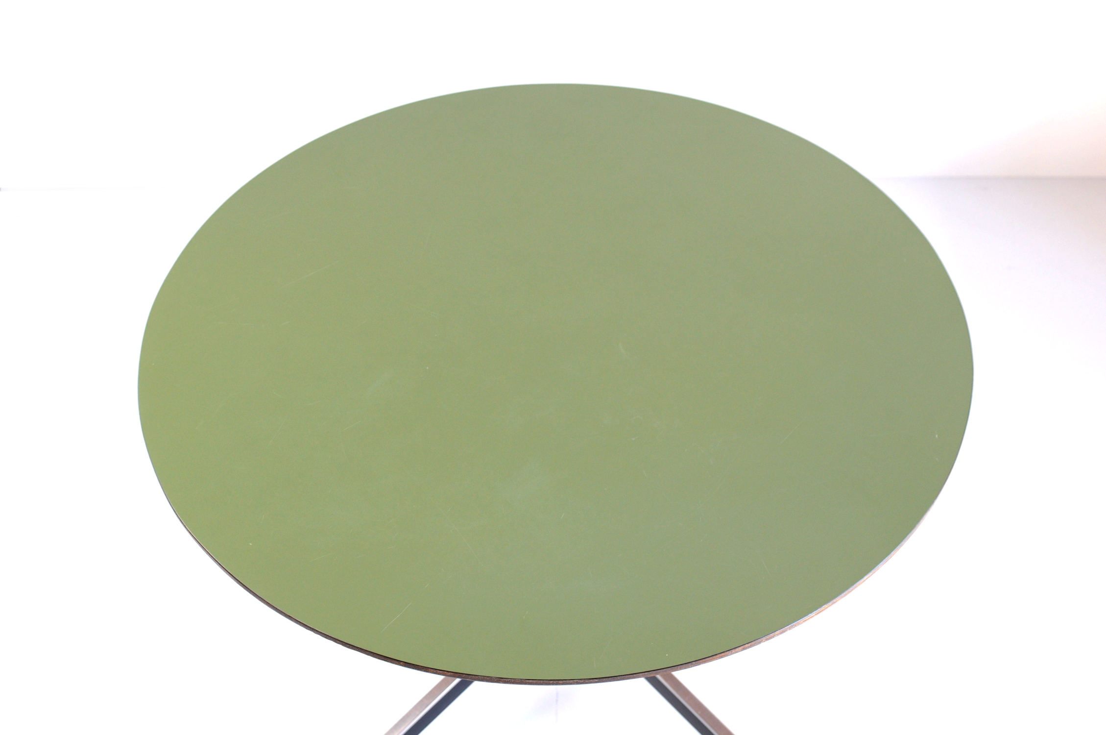 Provenant d'un ensemble créé pour un appartement-hôtel de Vintimille en 1955, cette table a un plateau circulaire en contreplaqué plaqué de mélamine vert amande. Le piètement en acier laqué noir repose sur 4 branches munies de verrins en laiton.
