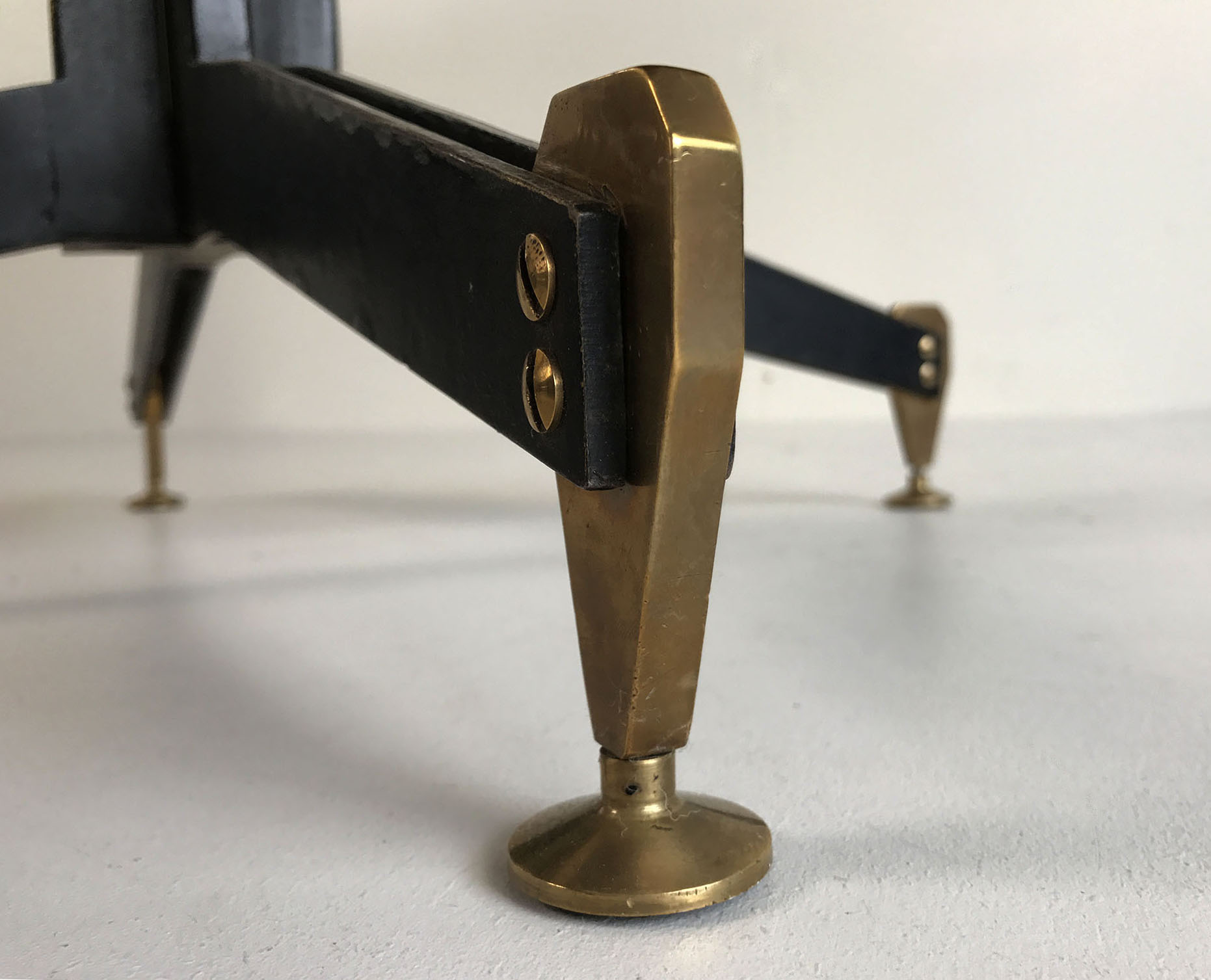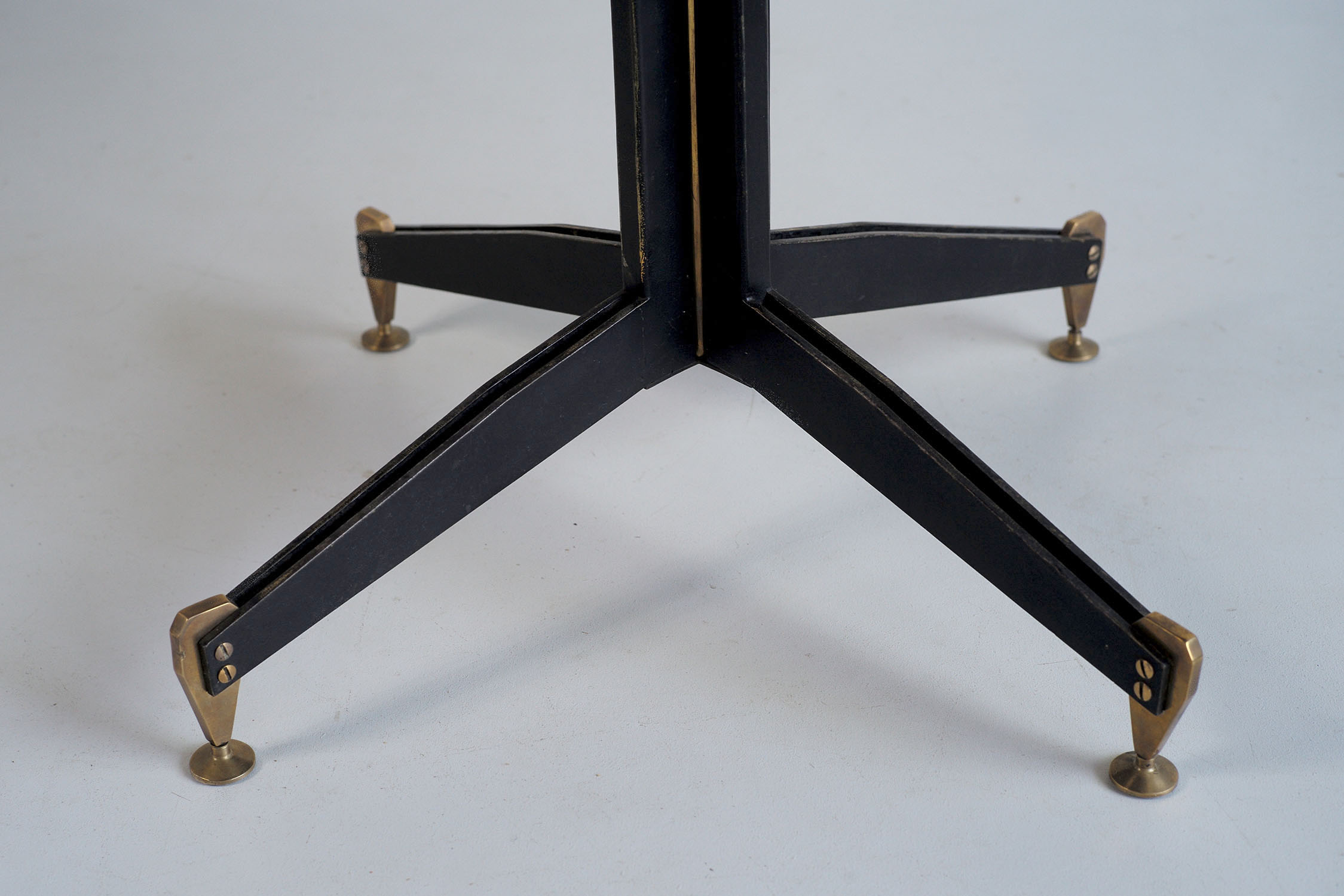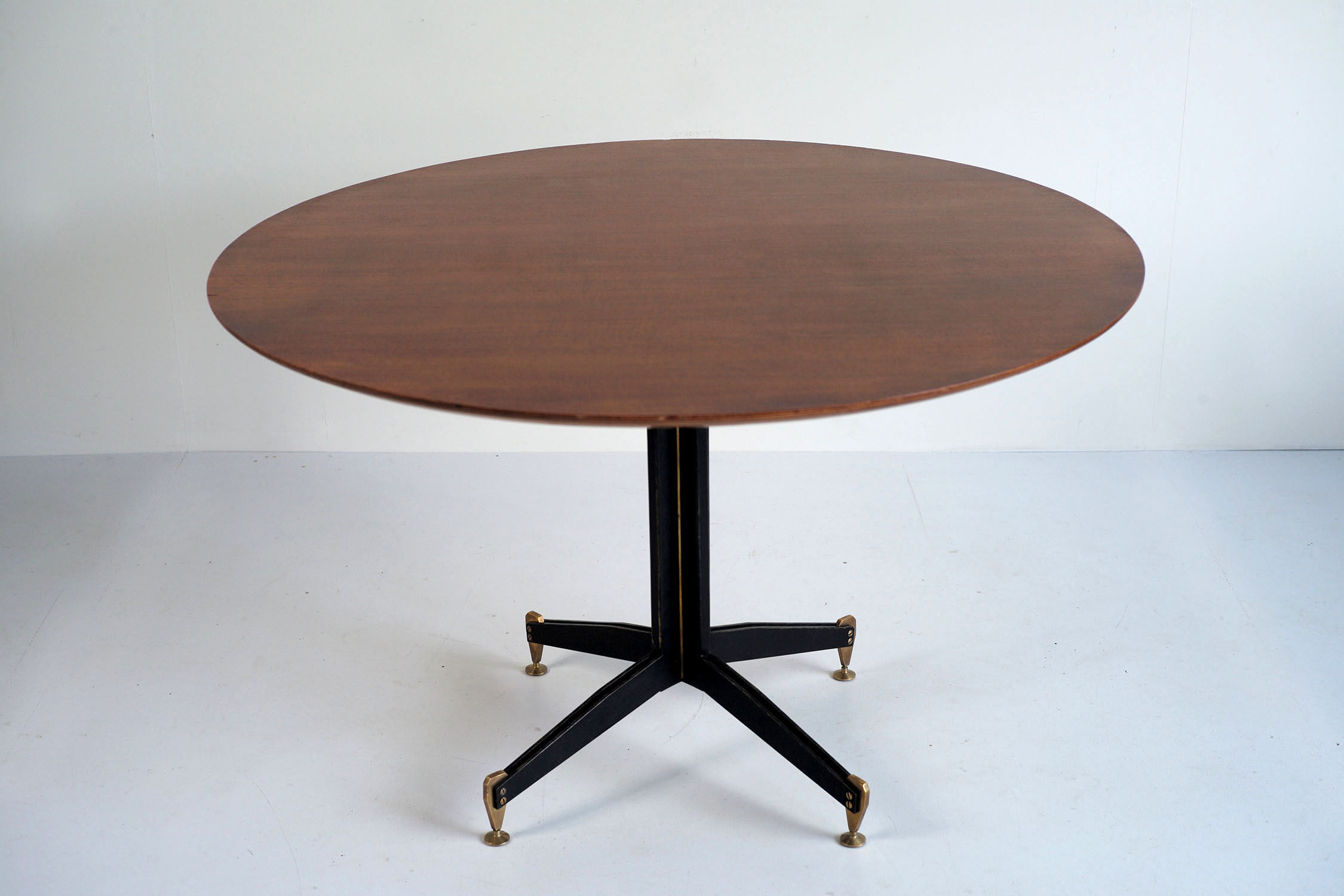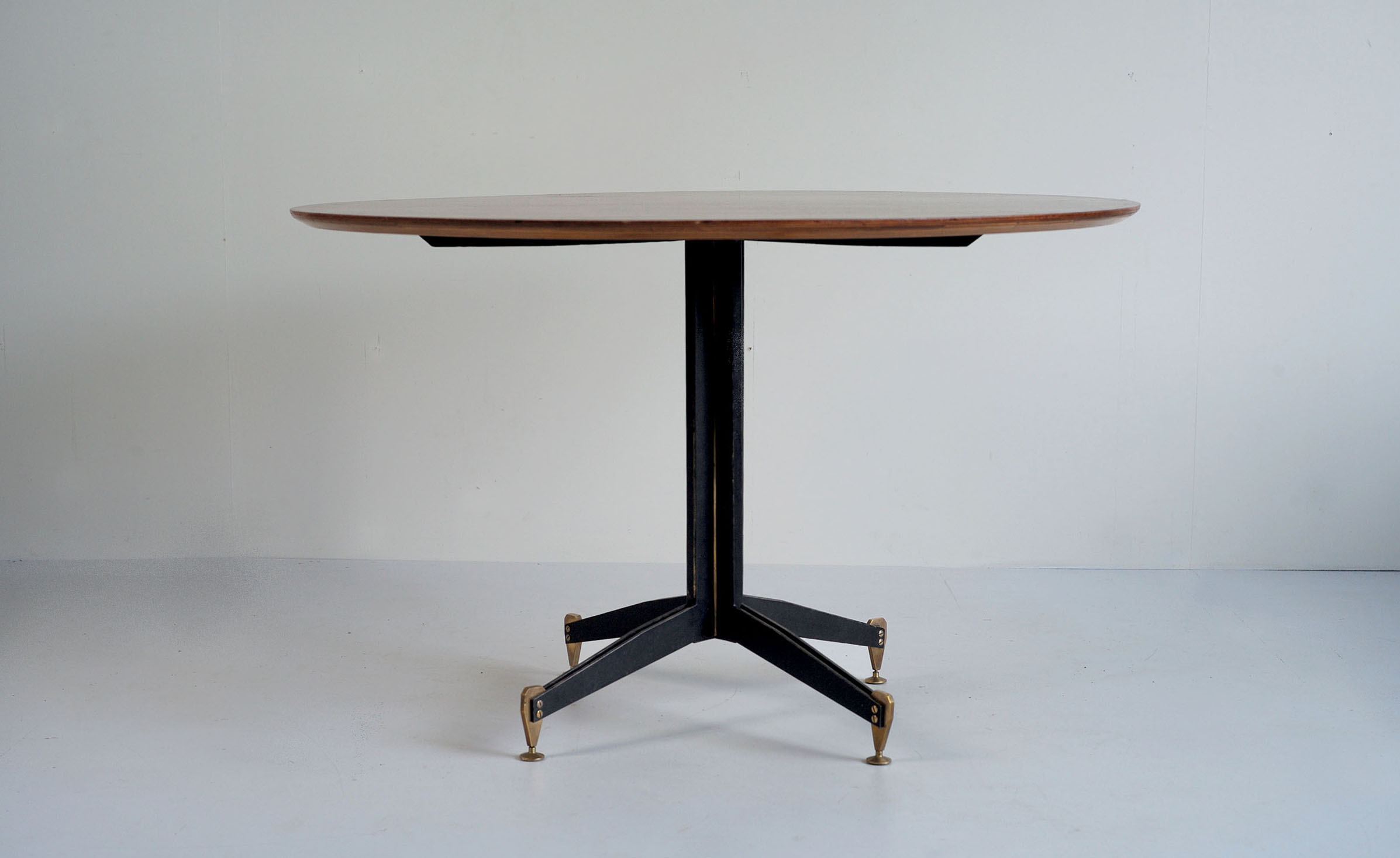 Table ronde en contreplaqué plaqué acajou à piètement central en lames d'acier noirci et laiton doré, Italie 1950. Les pieds en laiton massif sont tenus par deux larges vis apparentes, le fût central est rehaussé par un tube en laiton doré. Cette table est attribuée à Ignazio Gardella. Très bel état