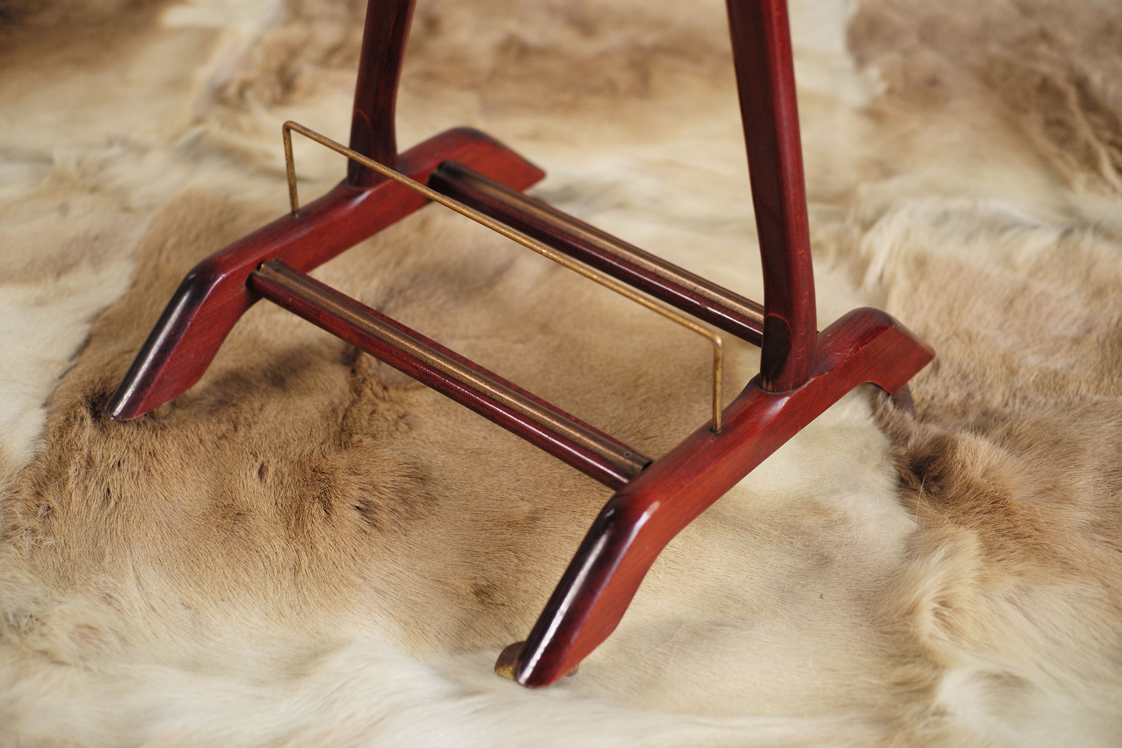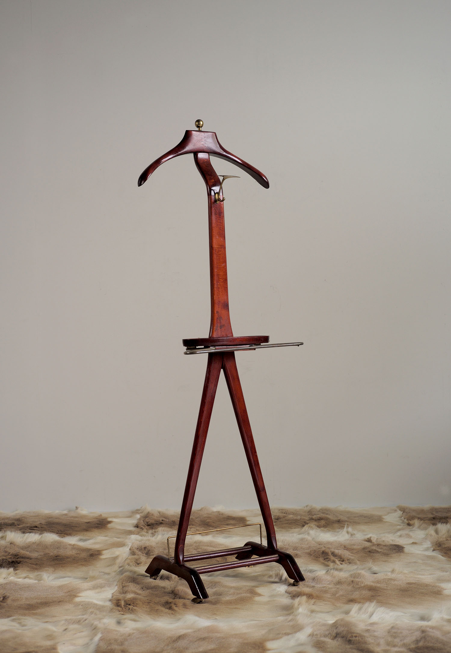 Valet de chambre par Ico and Luisa Parisi pour Fratelli Reguitti, Italie 1950. Cette pièce au dessin anthropomorphique dispose d'un cintre, de deux porte- cravates rétratables et d'un rangement pour les chaussures. Finition acajou, laiton.
