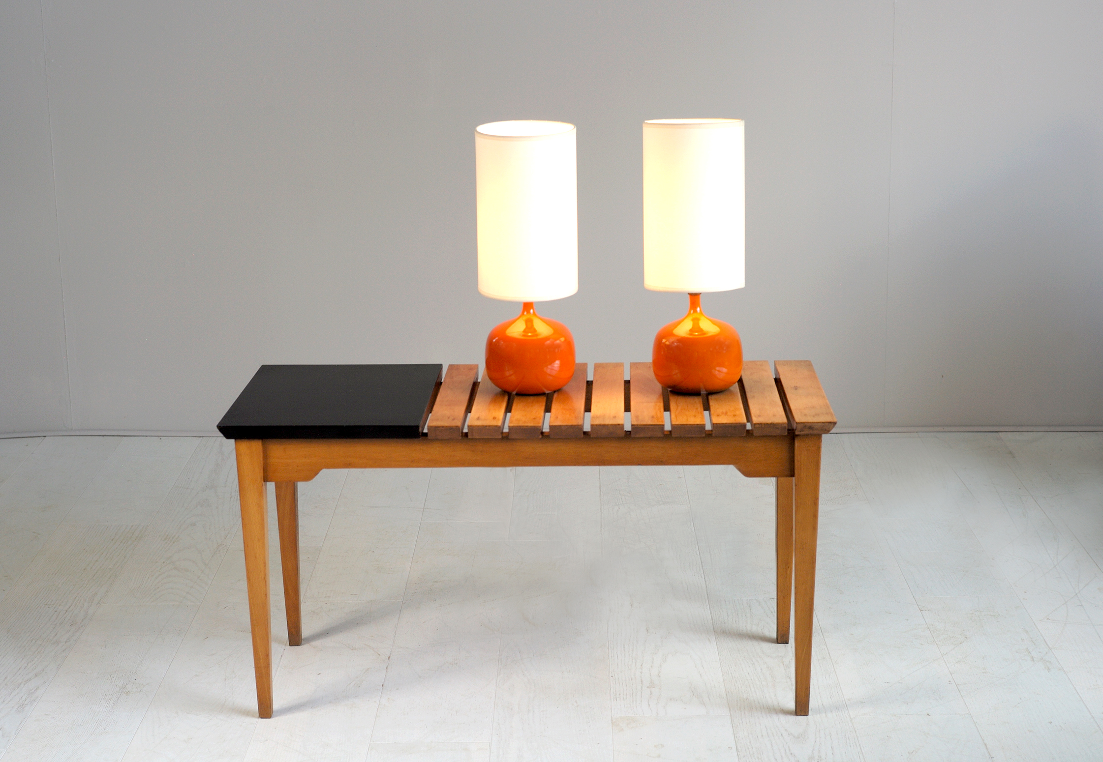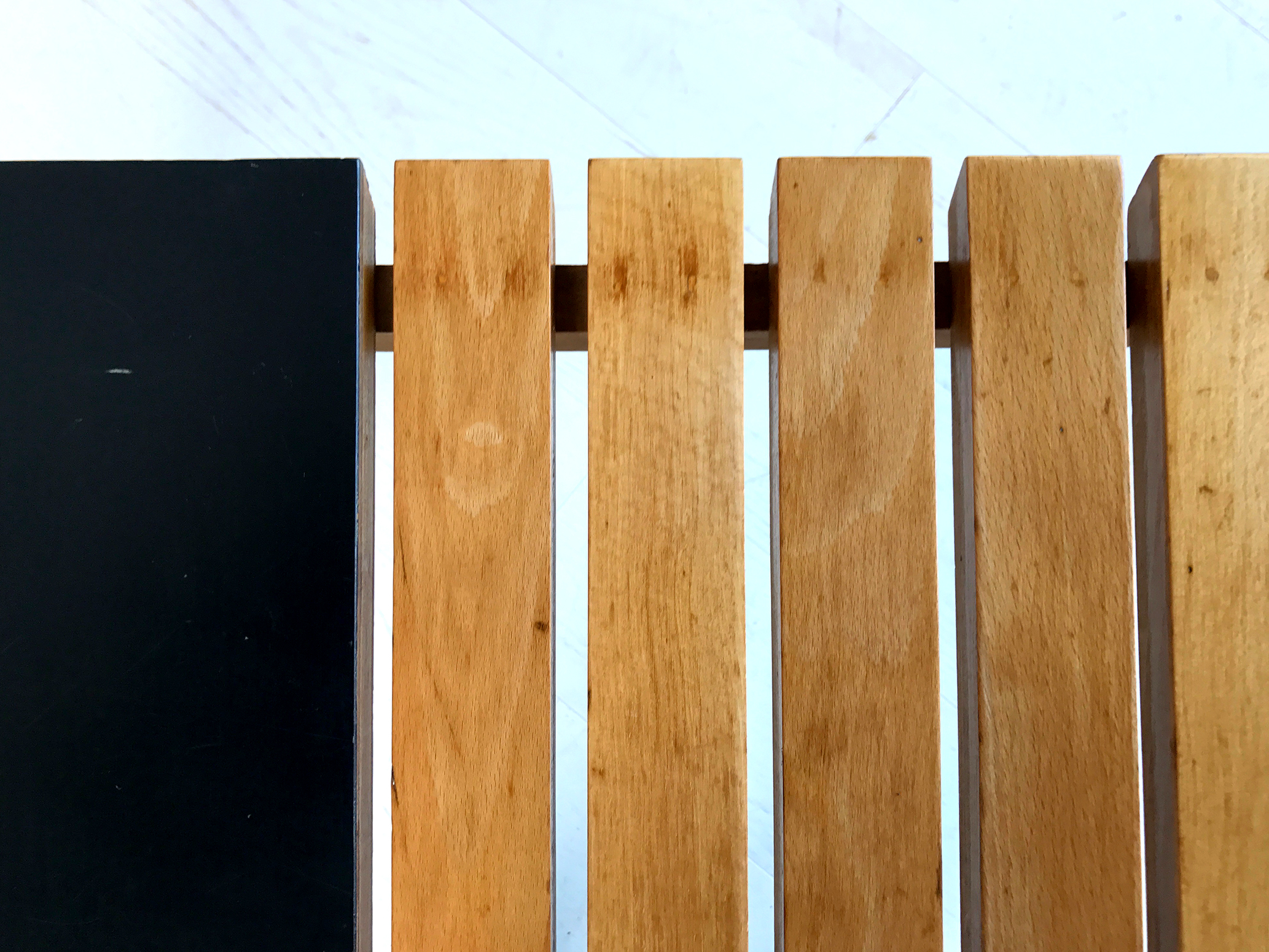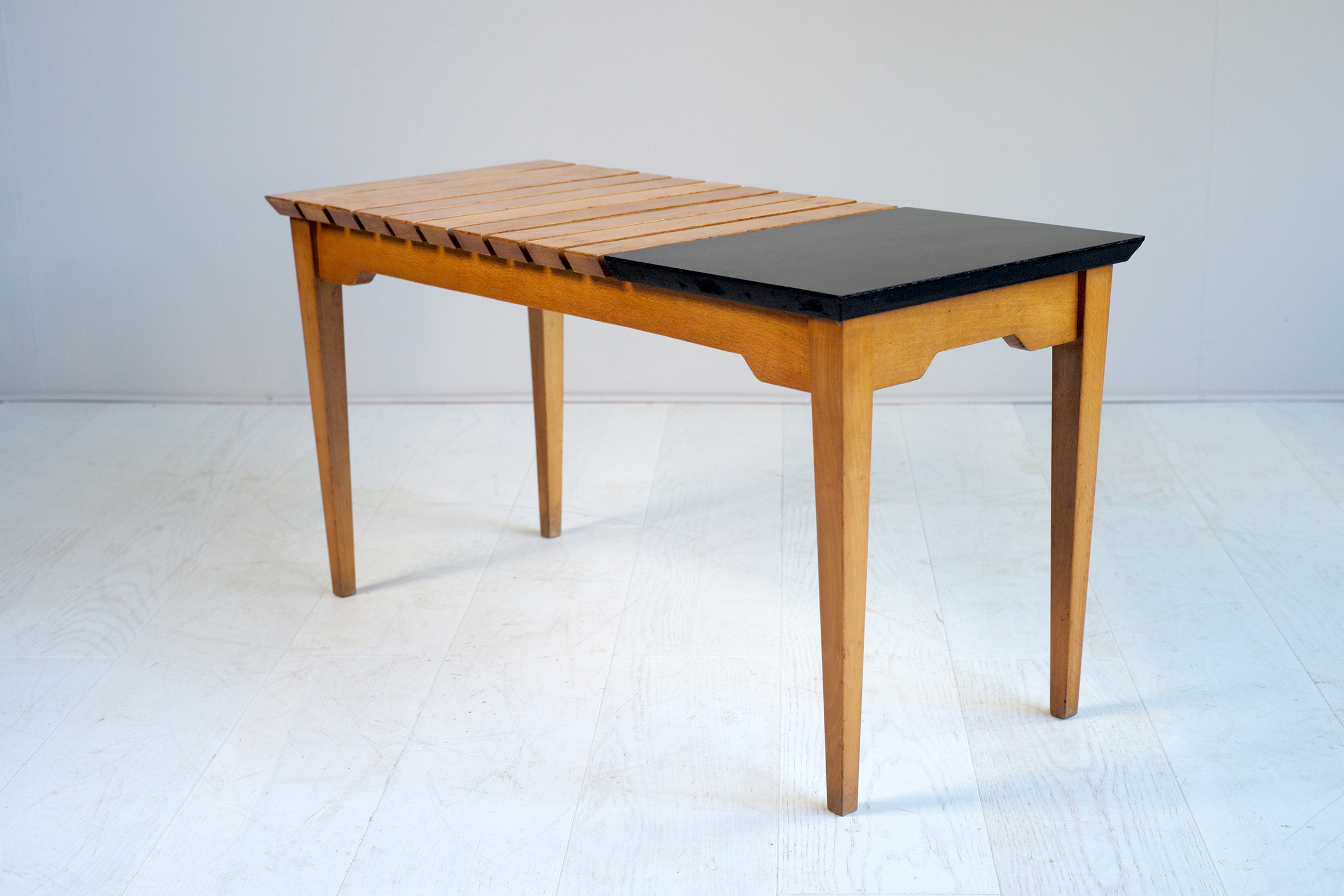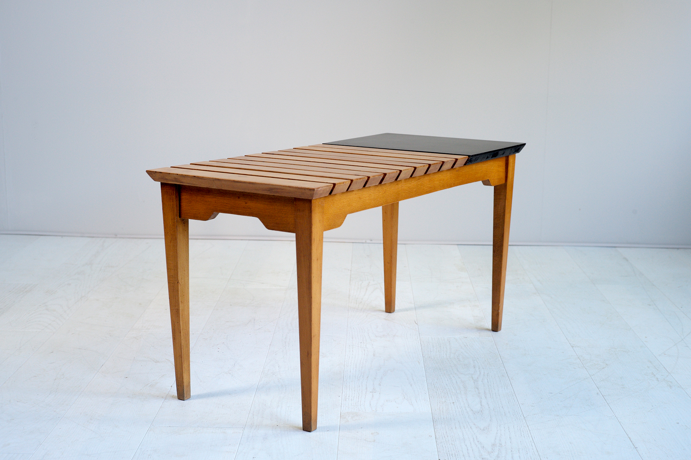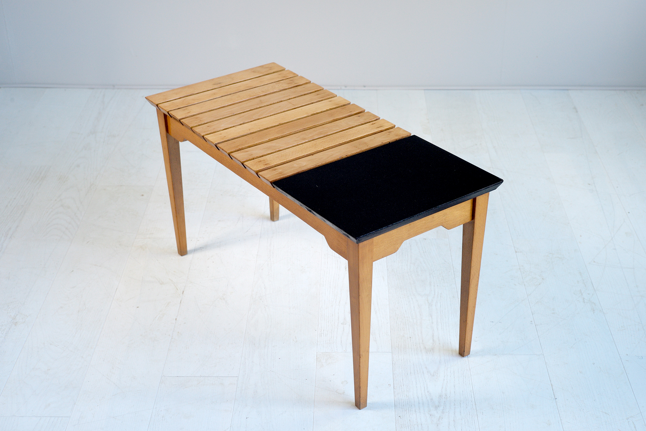 Rare table/banc attribué à André Simard, France 1950. Piètement et lattes en hêtre naturel huilé, tablette en formica noir. Ses proportions permettent de l'utiliser en banquette ou en bout de canapé.
