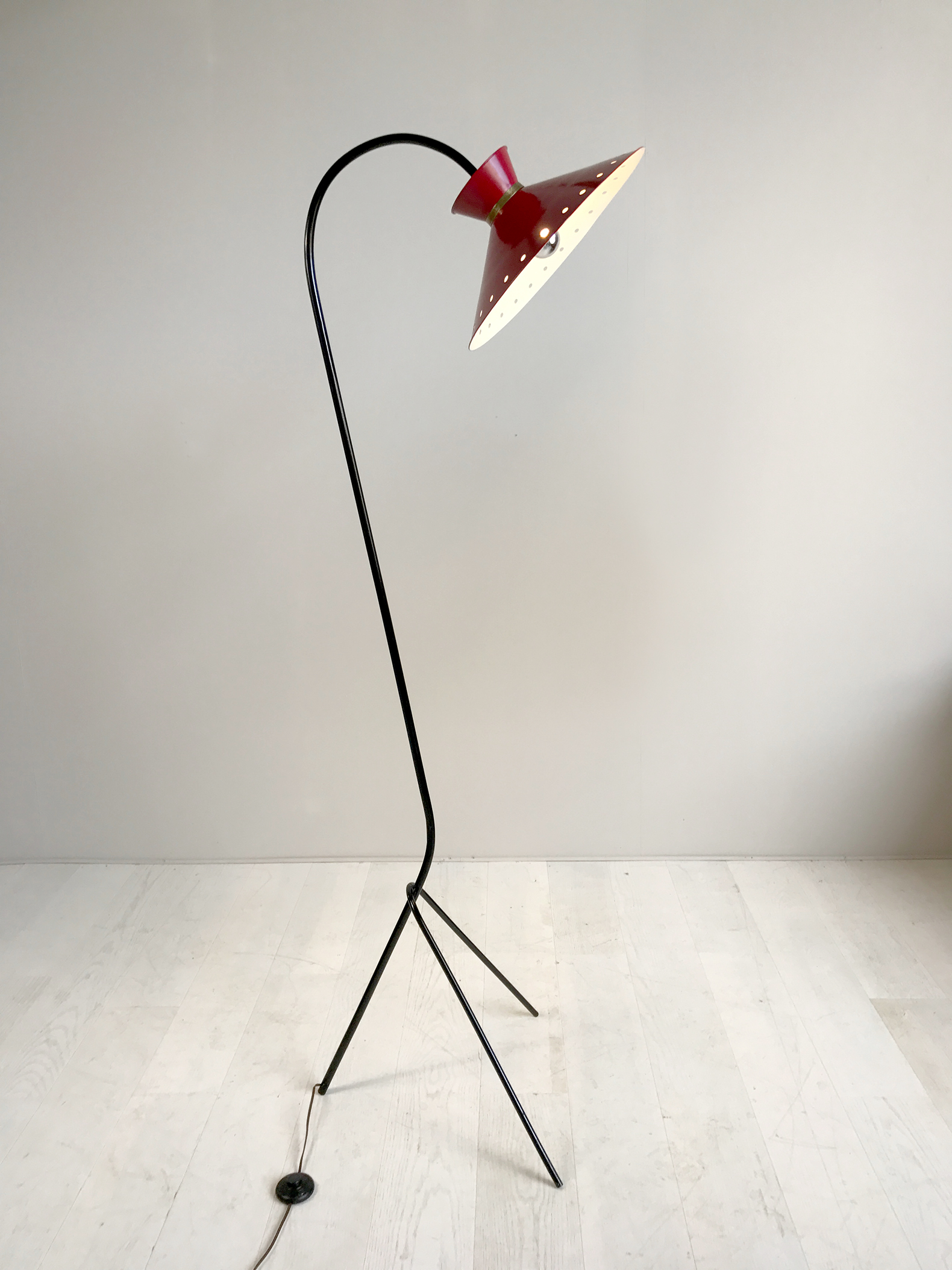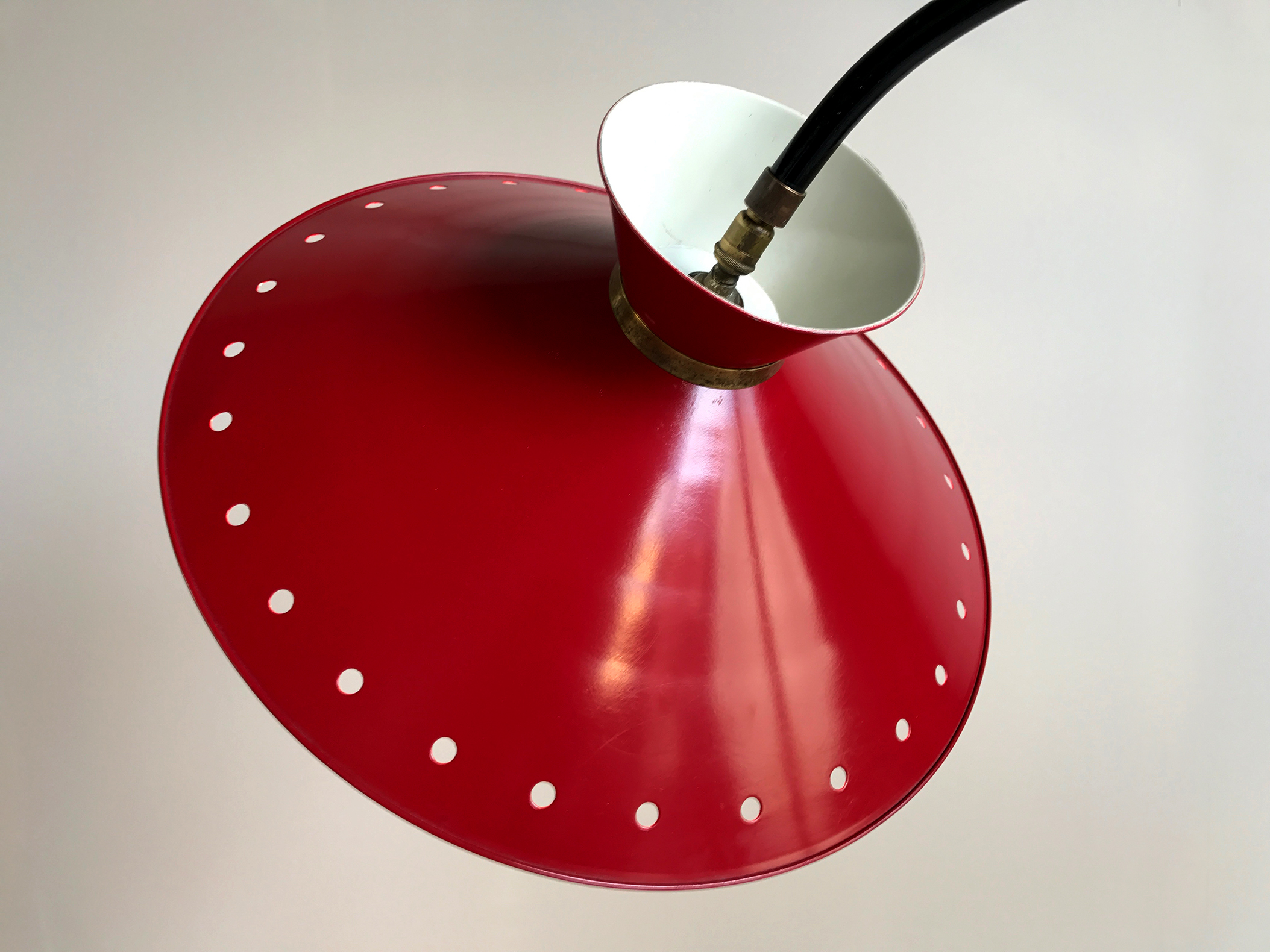 Grand lampadaire tripode à réflecteur diabolo perforé, laqué rouge/blanc, orientable par rotule. Cache ampoule à griffe en aluminium.