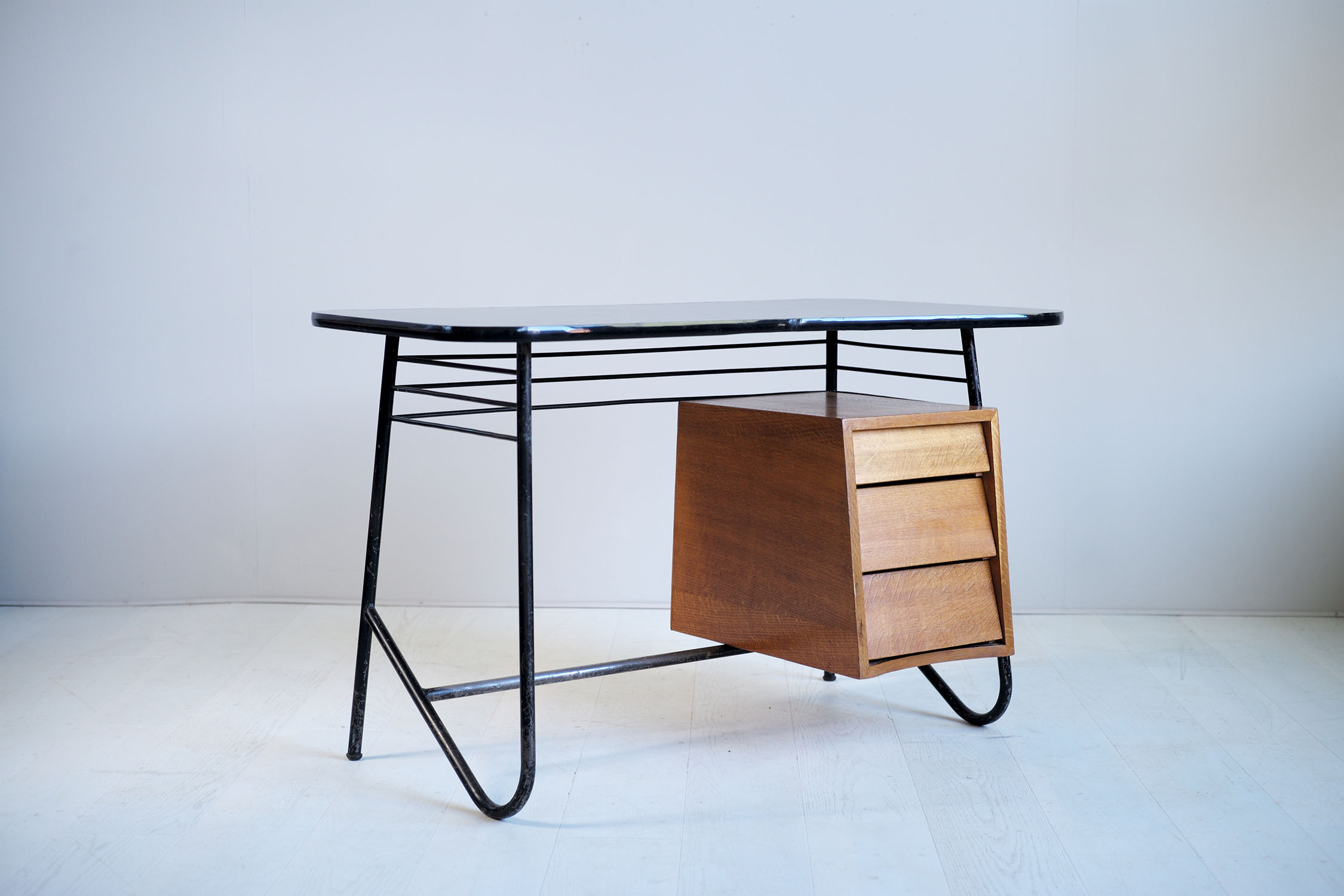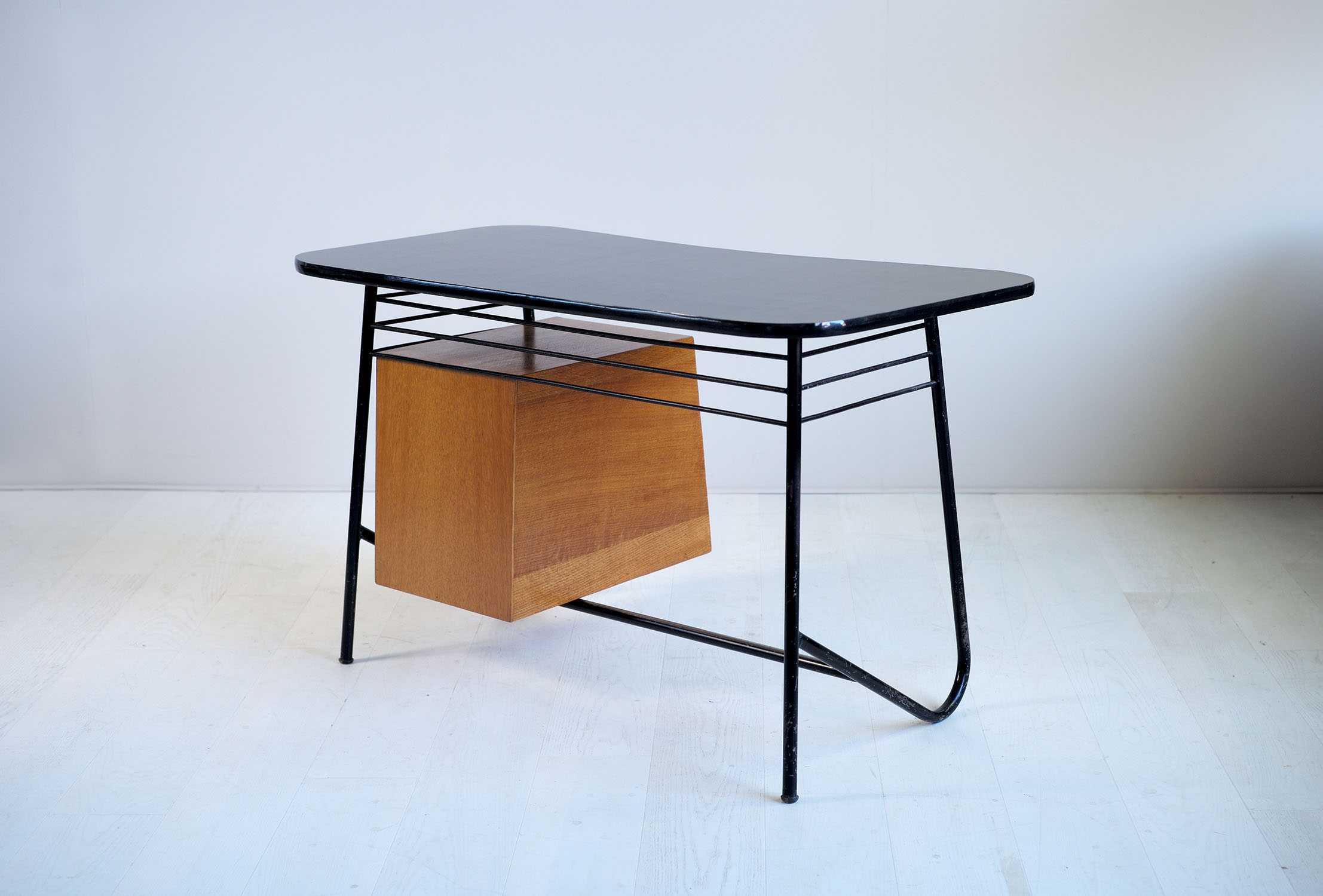 Bureau en métal tubulaire cintré laqué noir, caisson à trois tiroirs en chêne blond et plateau en Formica noir, France 1950.