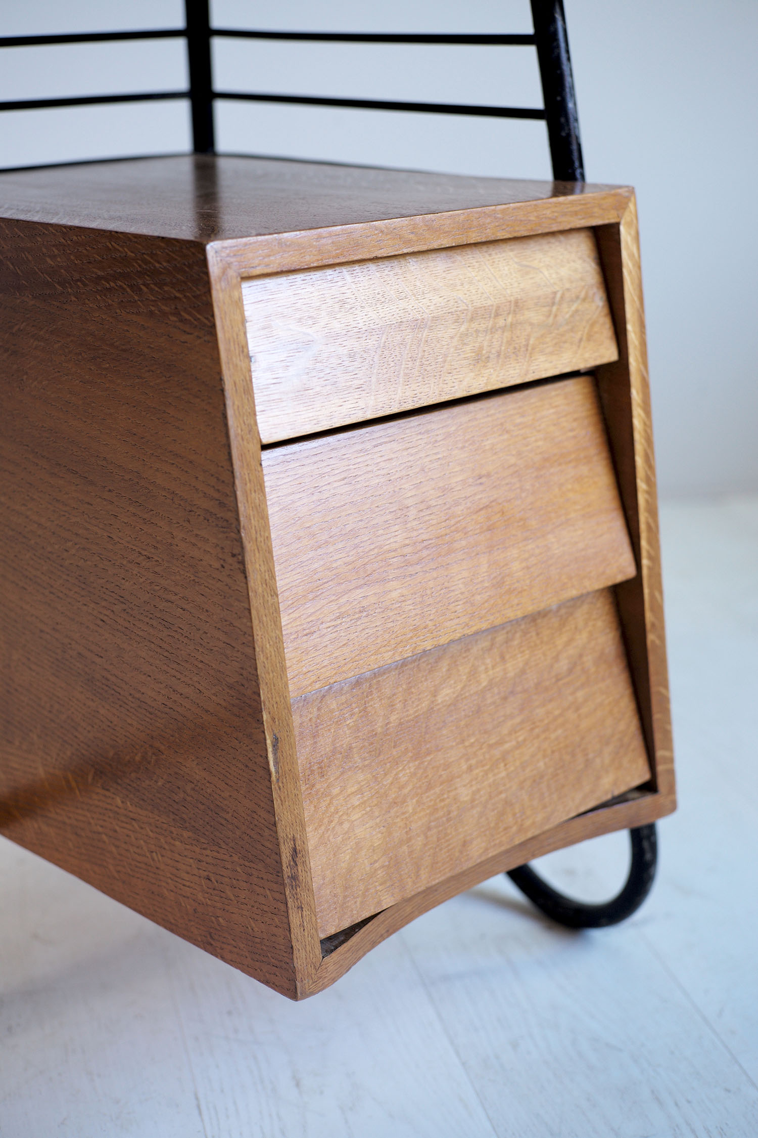 Le piètement, réuni par trois rangées d'élingues, les tiroirs à pan coupé et le plateau de forme rognon donnent à ce superbe bureau une présence à part.