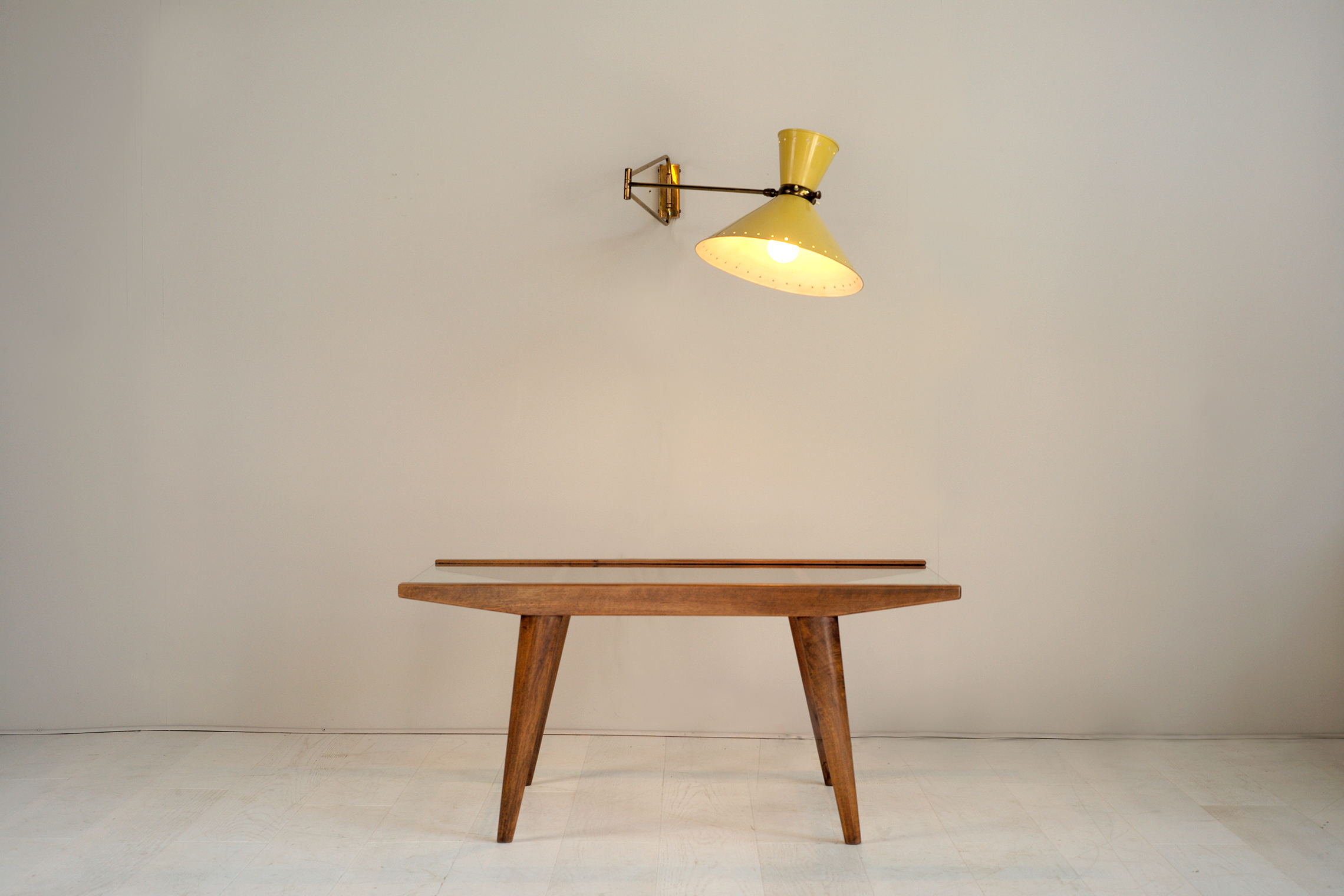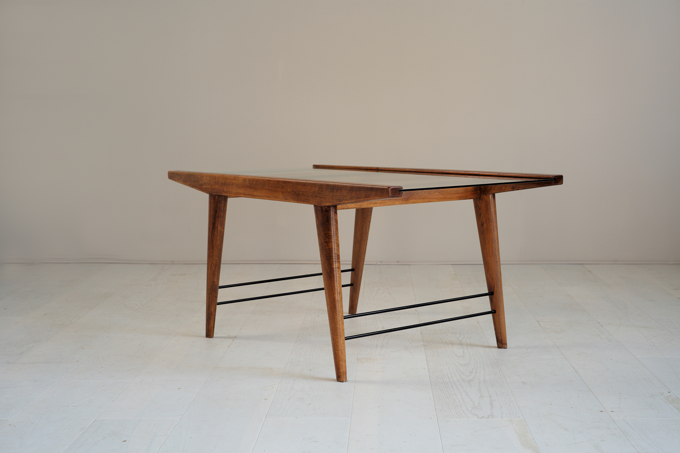 Elégante table de salon en acajou massif,France 1950. Une dalle de verre est insérée dans deux glissières, les quatre pieds sont réunis par trois élingues en laiton laqué noir.
