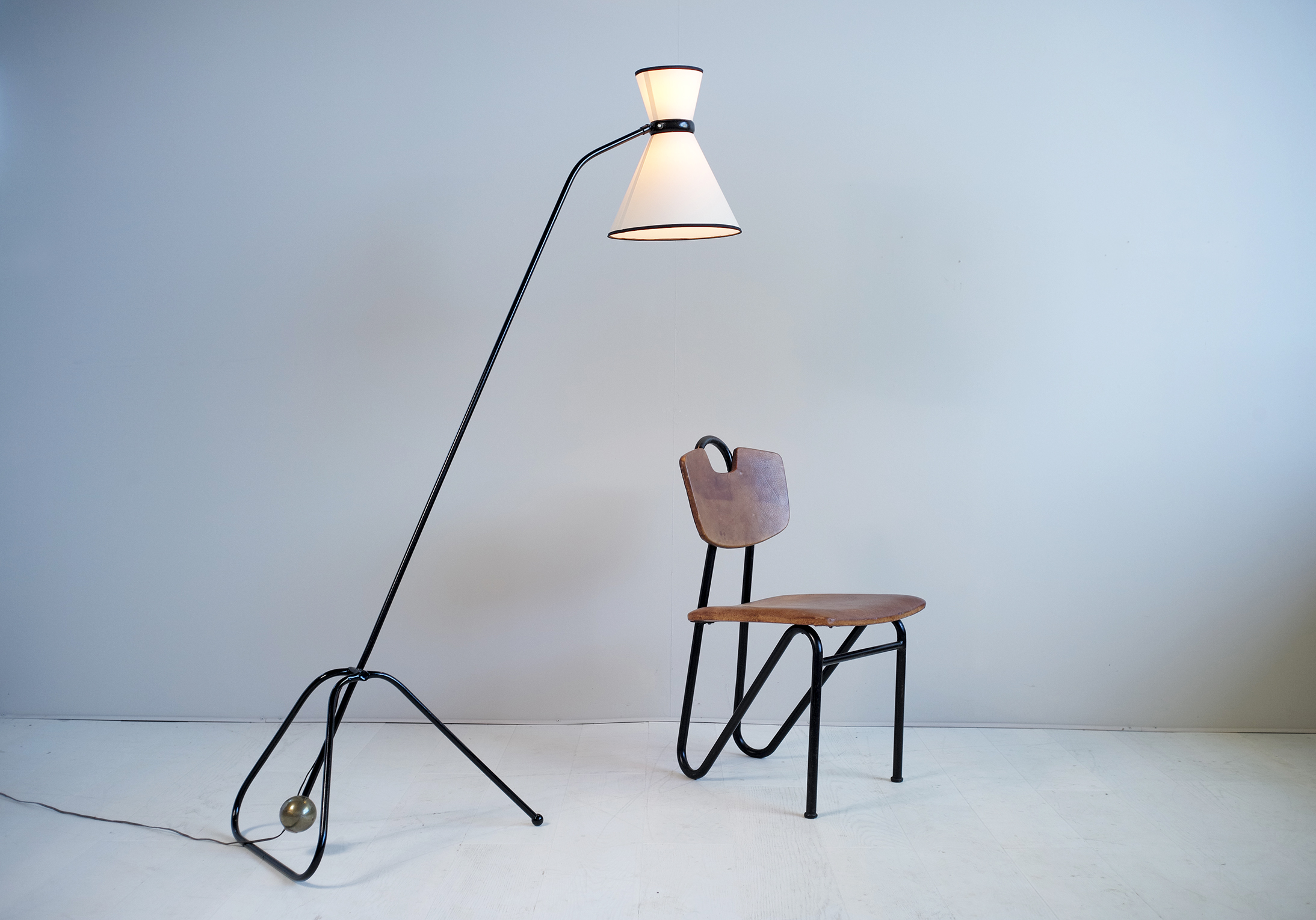 Rare lampadaire à contrepoids de Maurice Flachet, édité par Marcel Guillemard, Belgique 1950. Structure en laiton laqué noir, contrepoids en laiton poli/vernis, abat-jour en tissu écru à double allumage, articulé par rotule.
