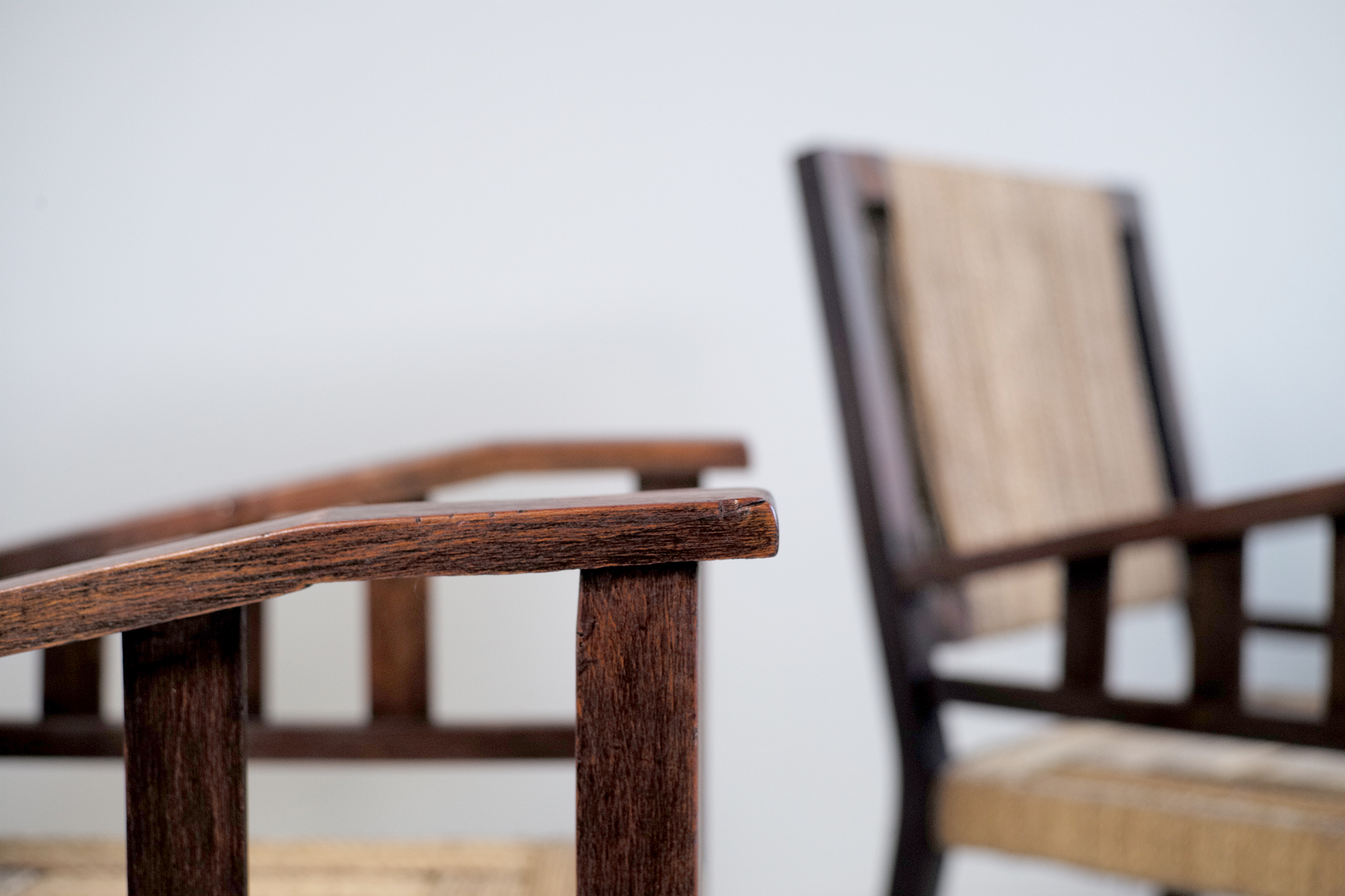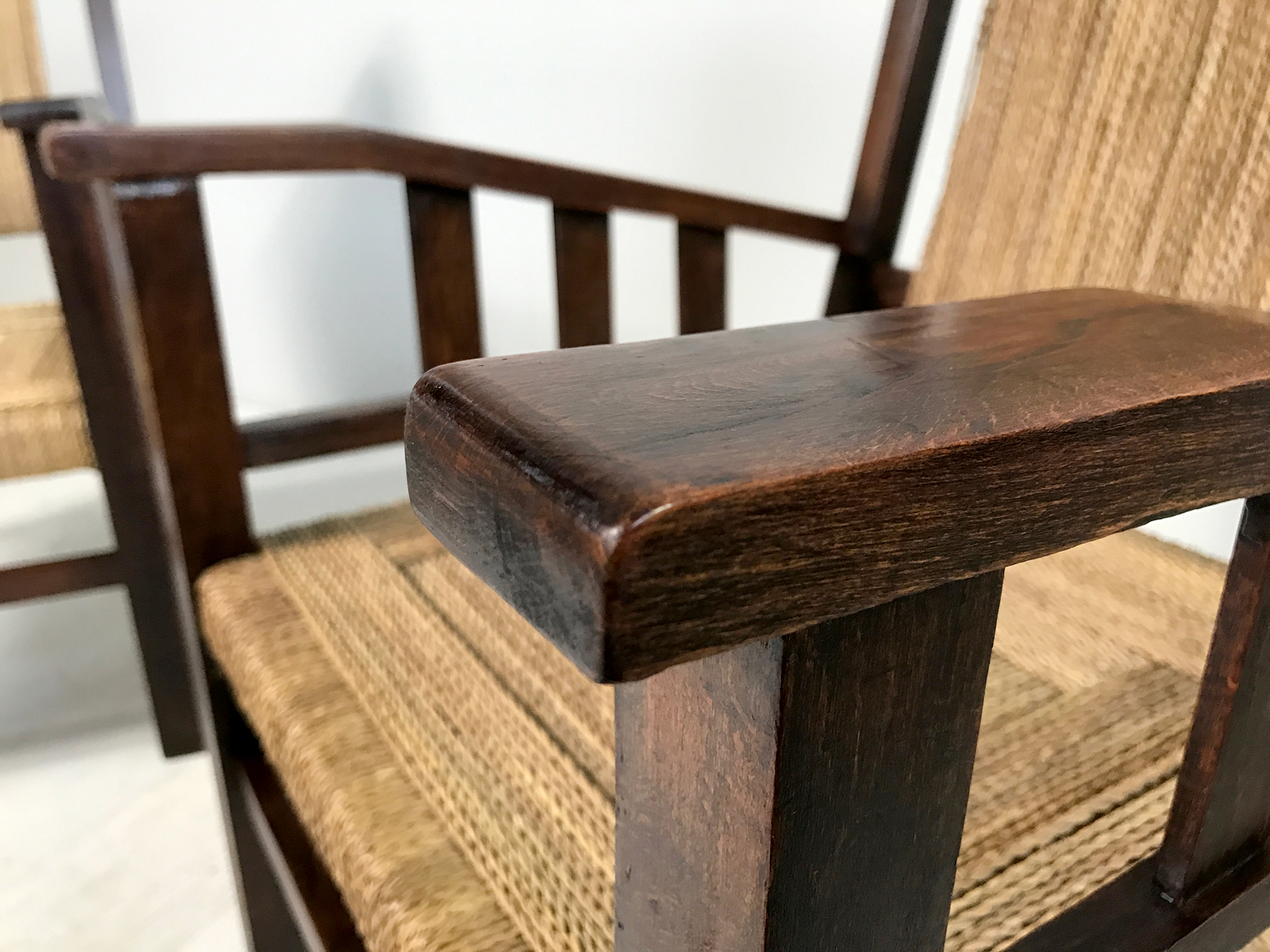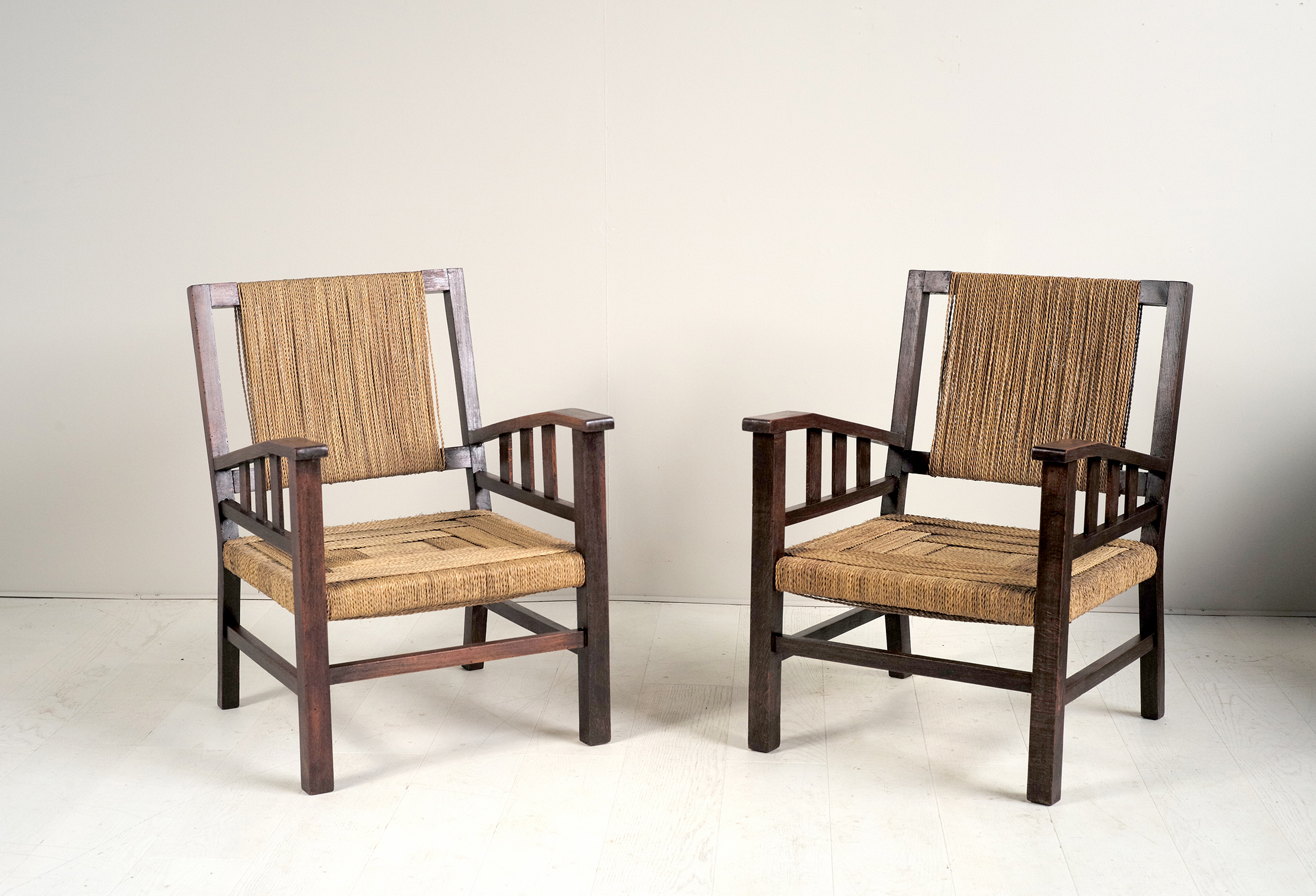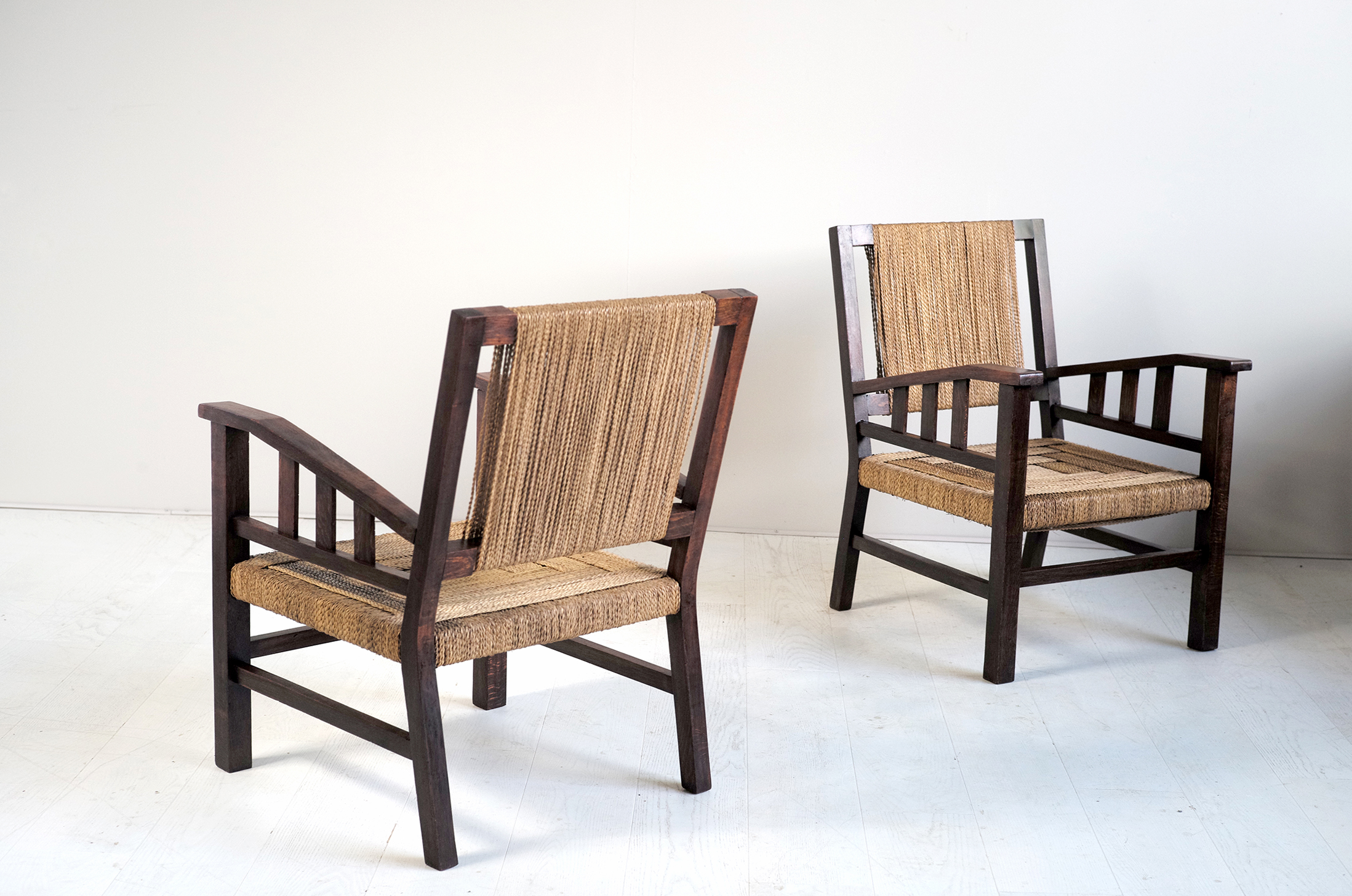 Francis Jourdain (1876_1958), paire de fauteuils en bois huilé à patine foncé et assise et dossier cordé, France 1930. Dessin minimaliste.