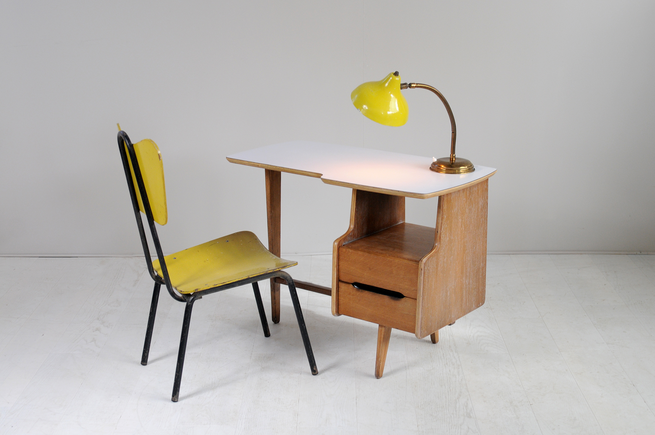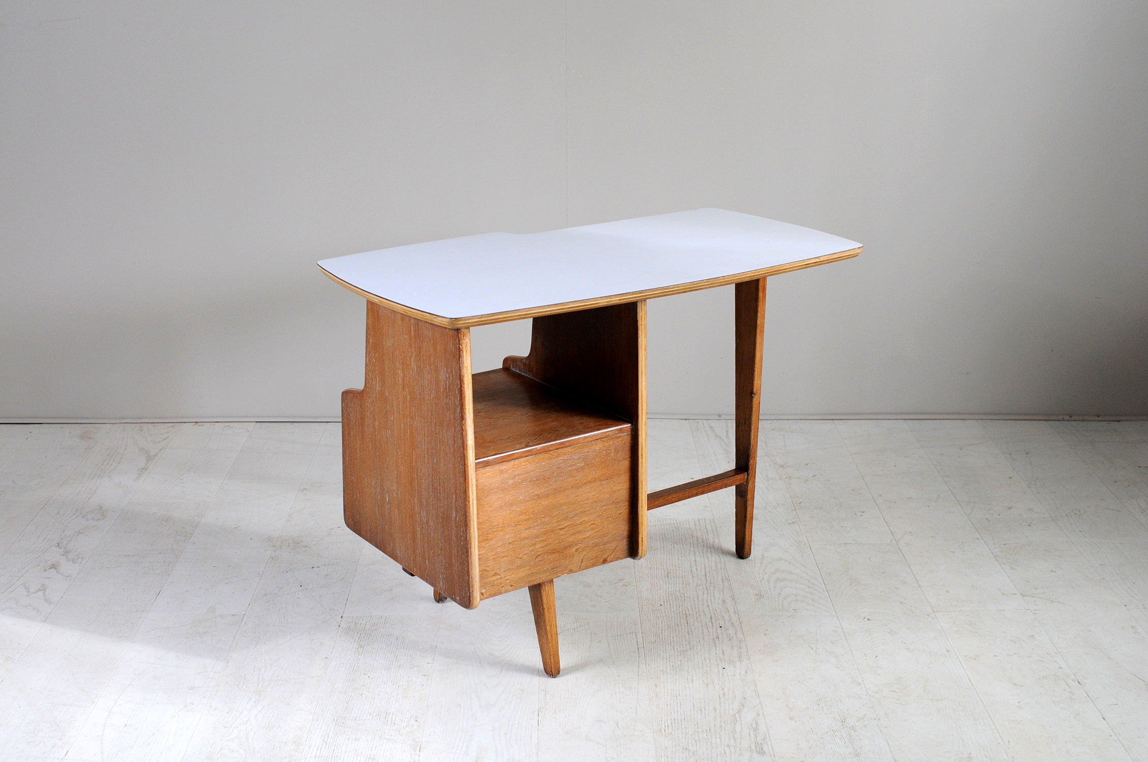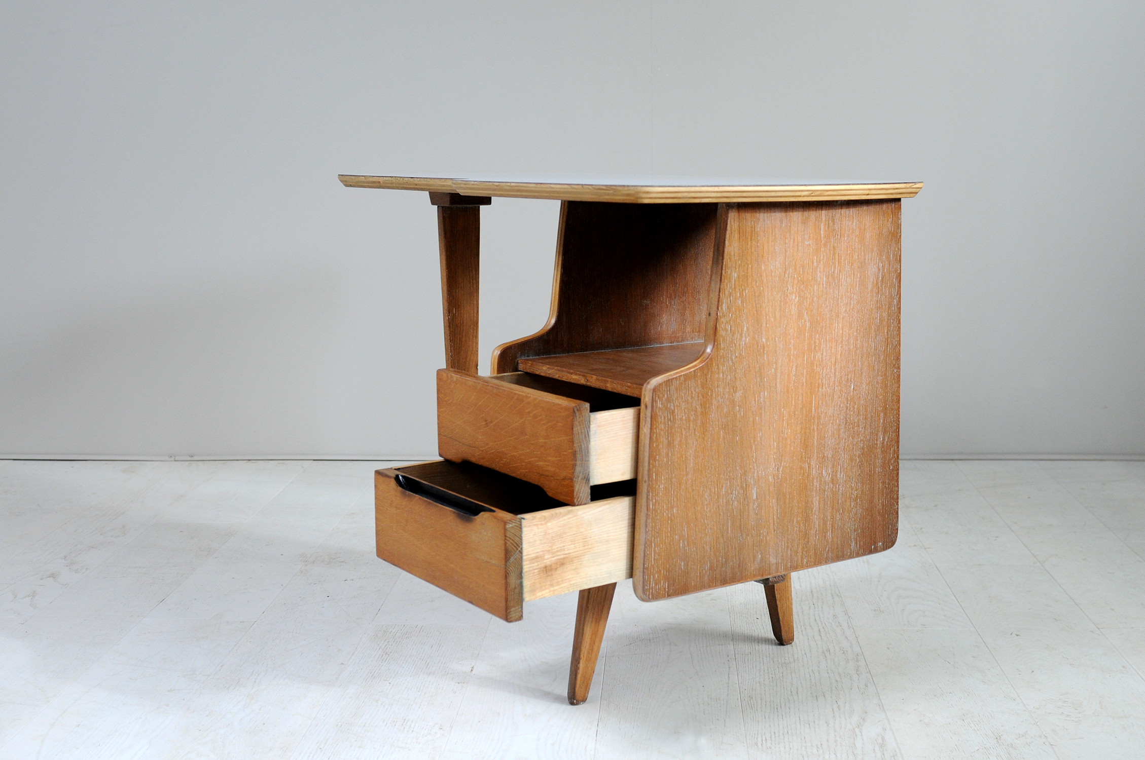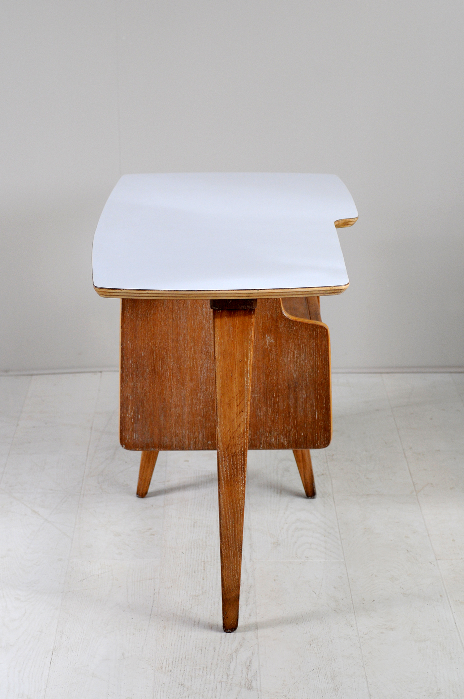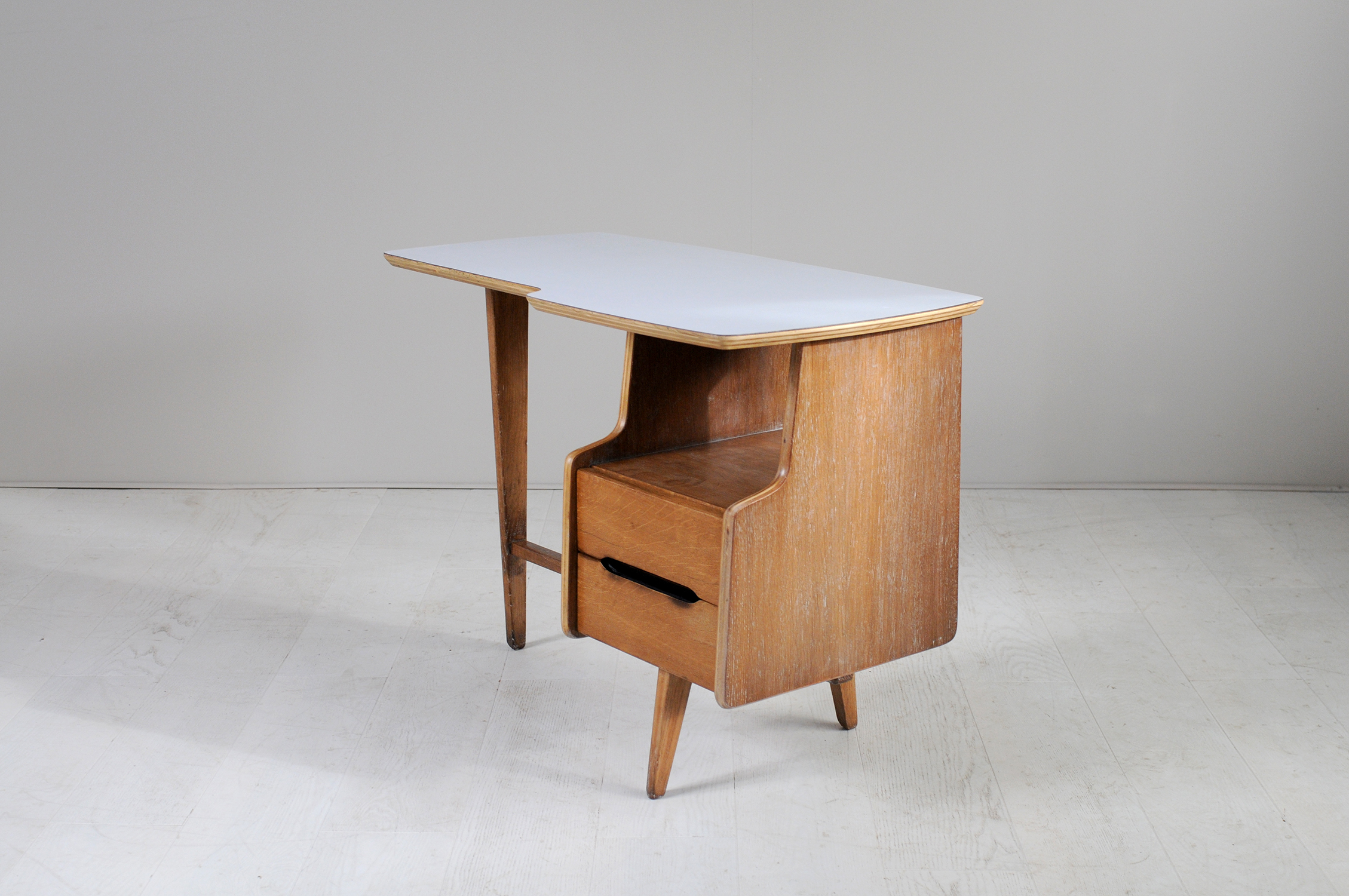 Rare bureau d'enfant en chêne cérusé et formica gris clair de Jacques Hauville, France 1950. Plateau de forme libre, caisson à deux tiroirs et piètement tripode.