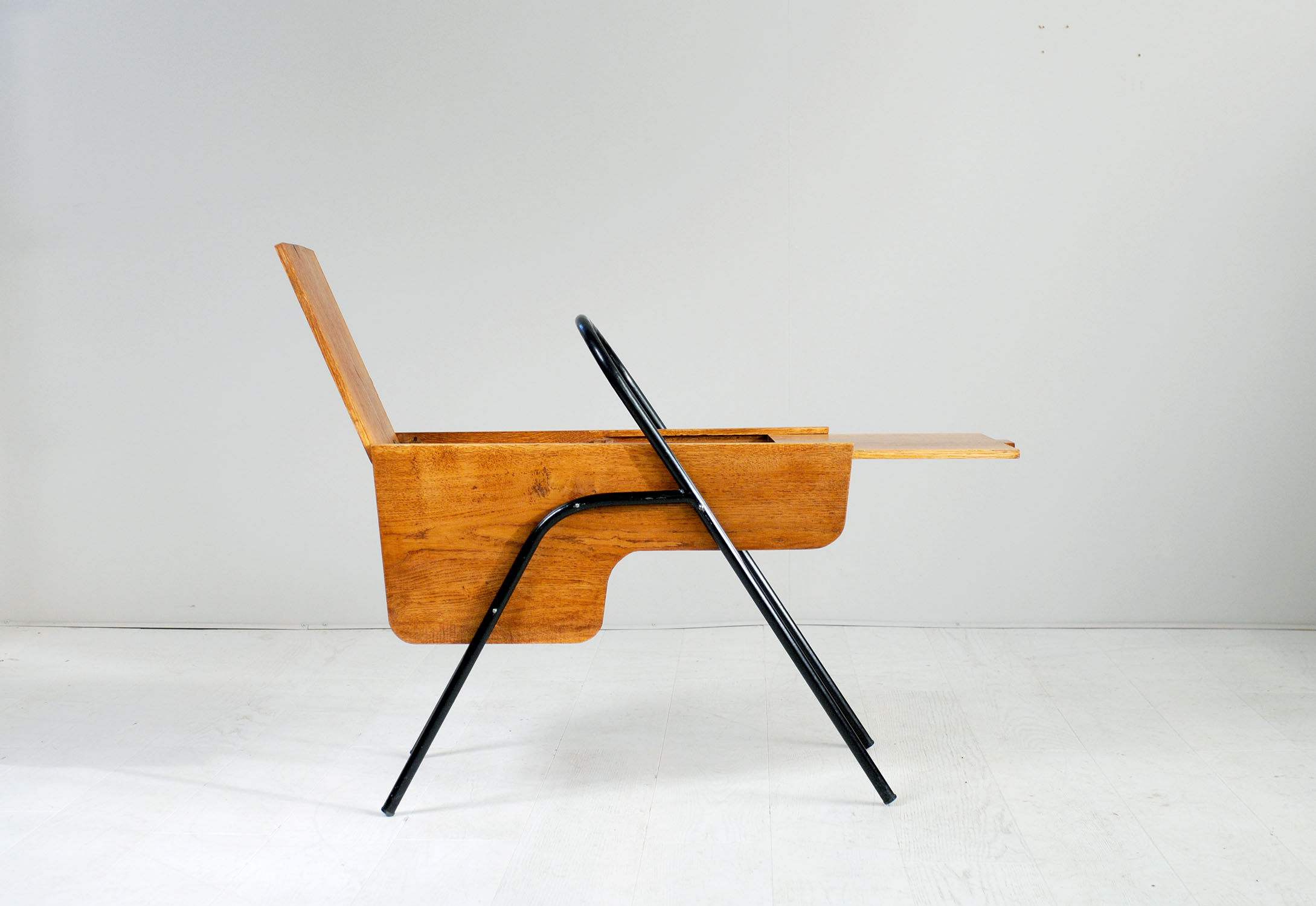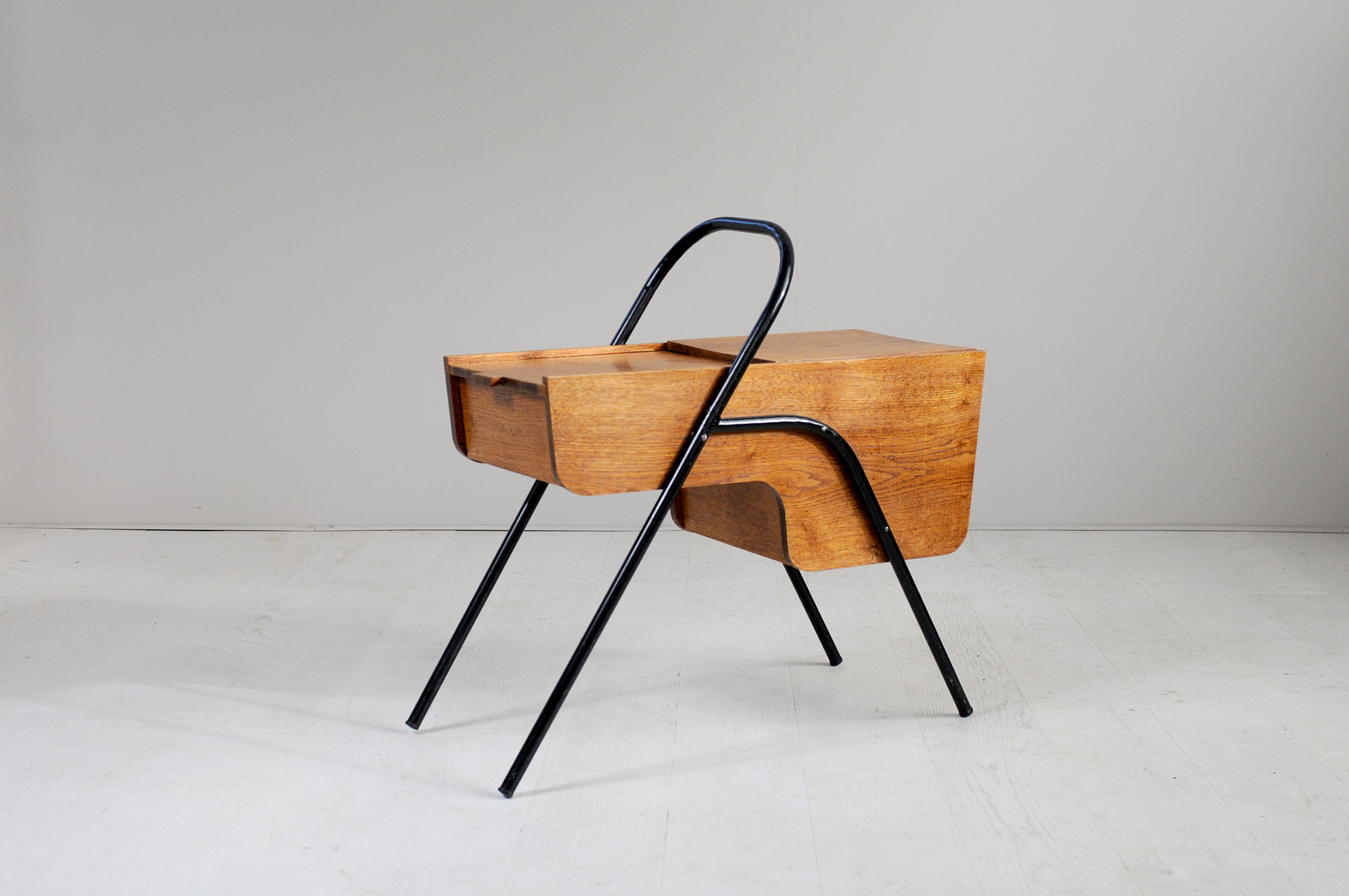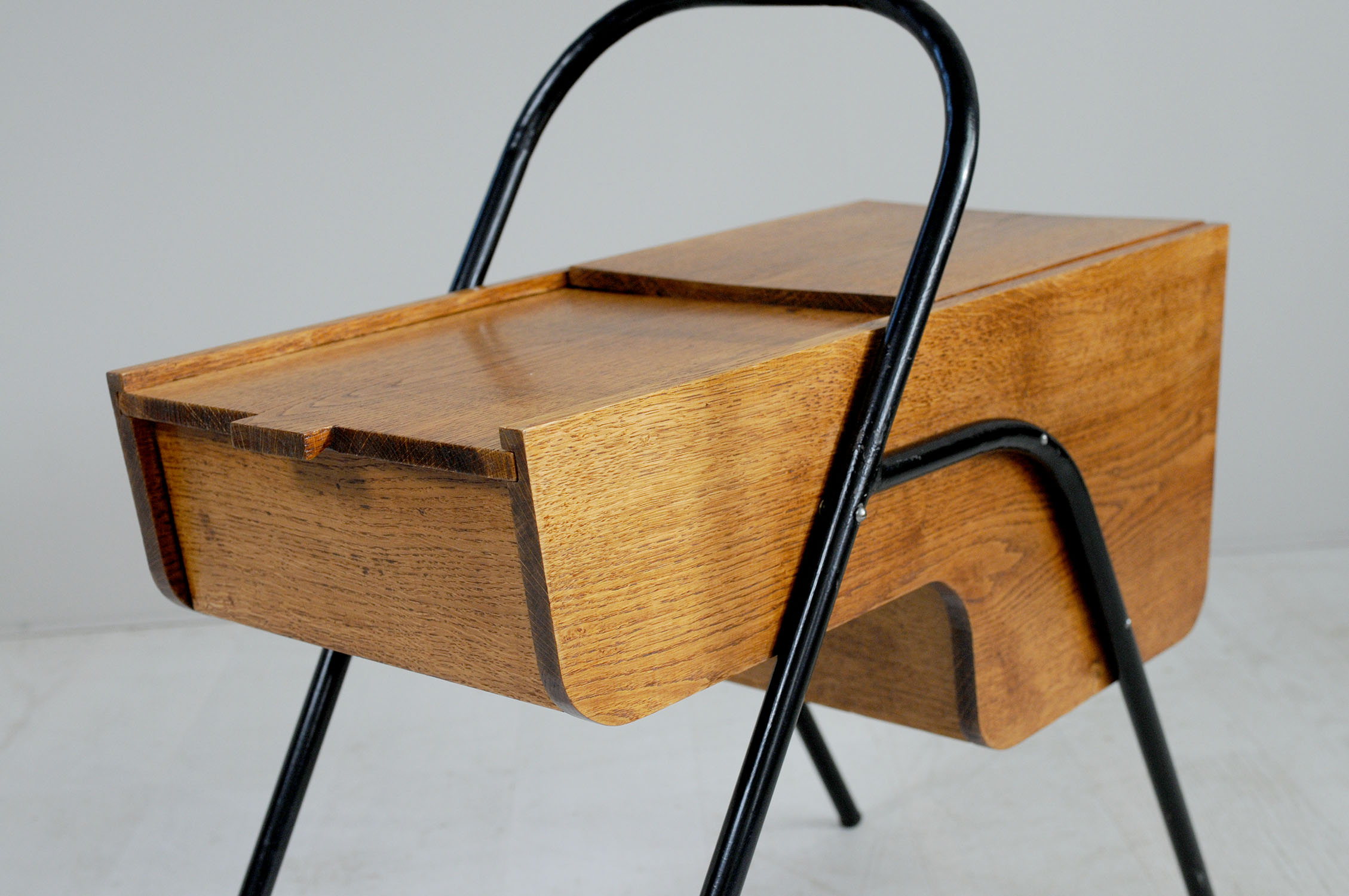 Travailleuse de forme libre en chêne massif, piètement en métal tubulaire laqué noir, France 1950. Le dessin, les proportions généreuses permettent de l'utiliser comme table d'appoint, mini-bar ou…nécéssaire à couture. Très bel état.