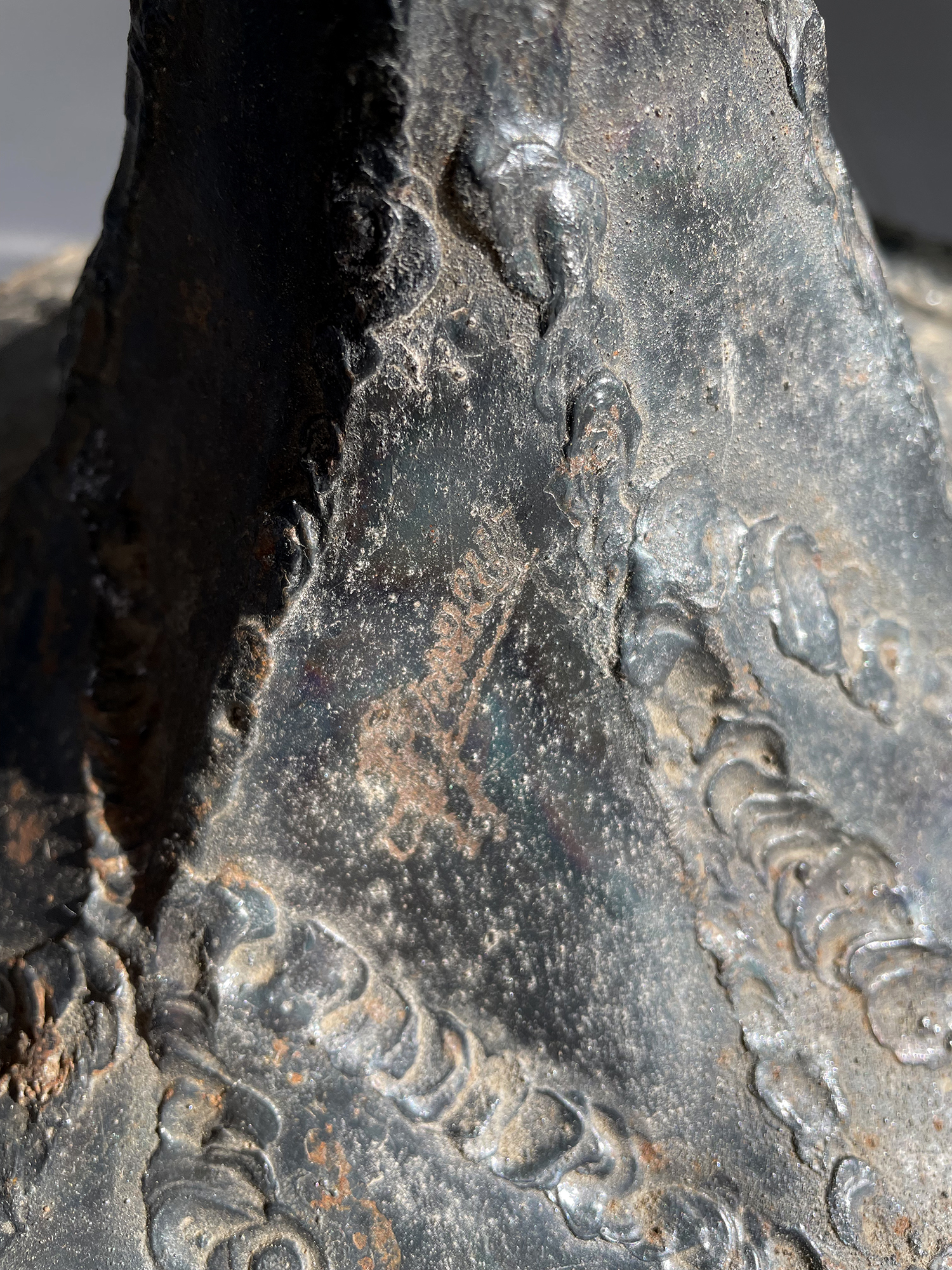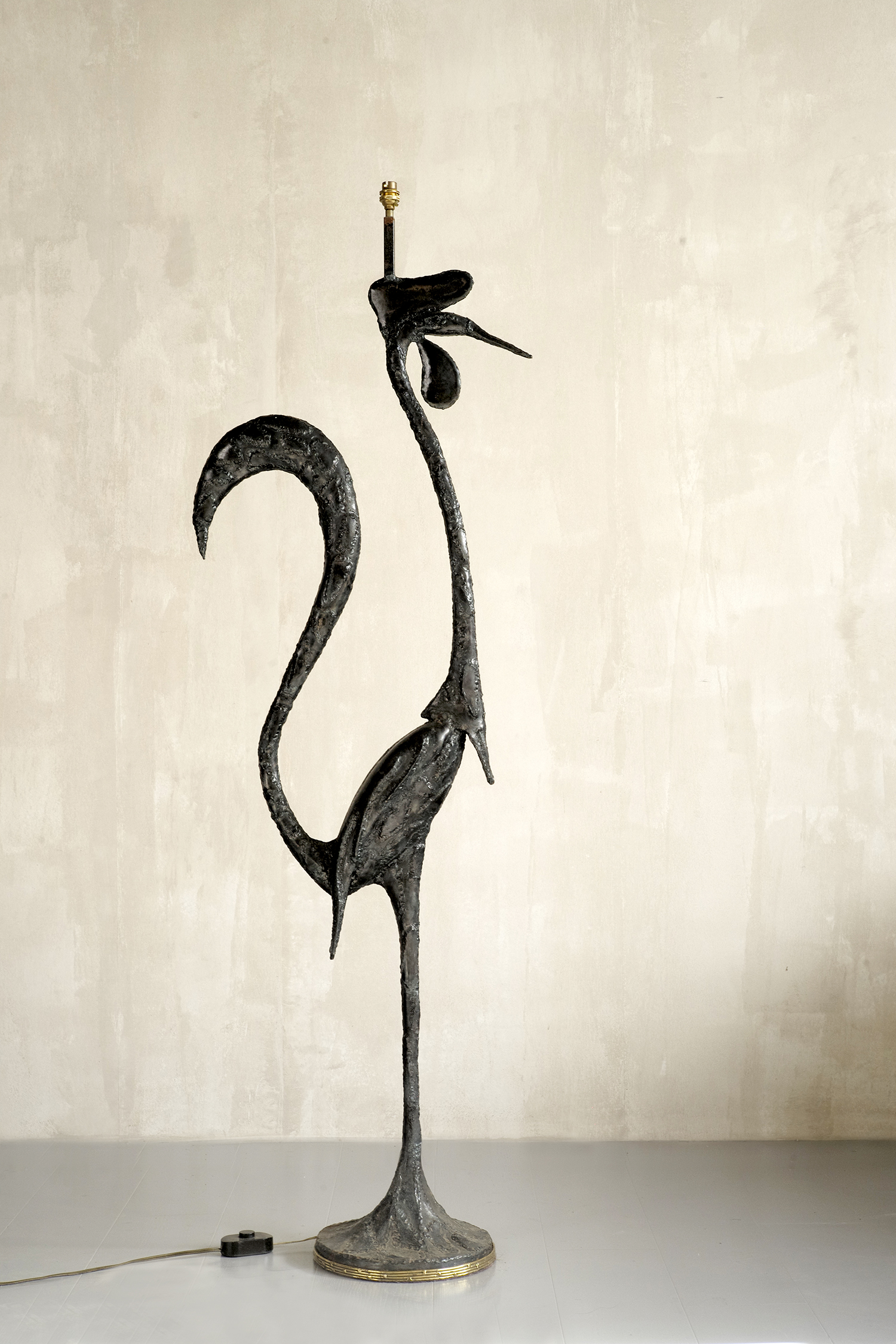 Jacques Duval-Brasseur, Grand lampadaire "Coq" en métal soudé à patine noire et laiton, France 1970/ Pièce unique signé sur le pied.