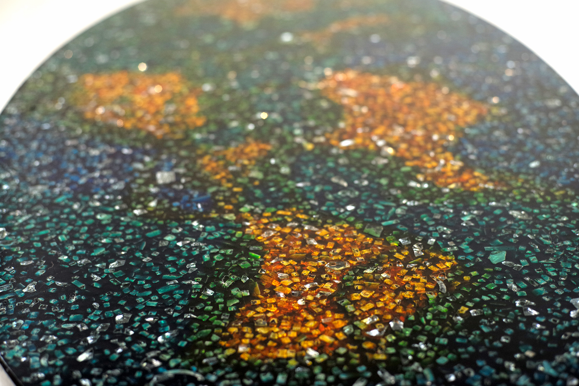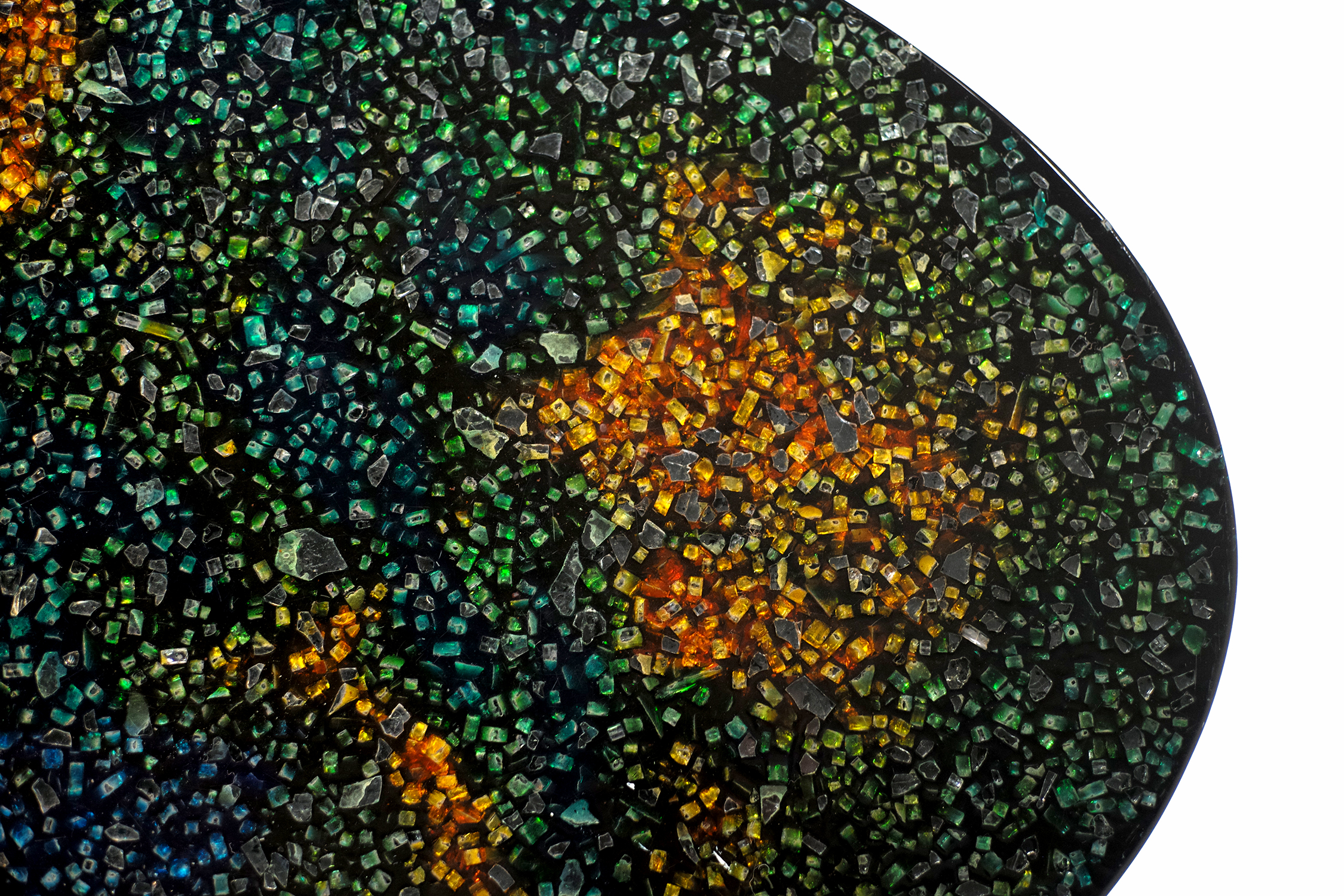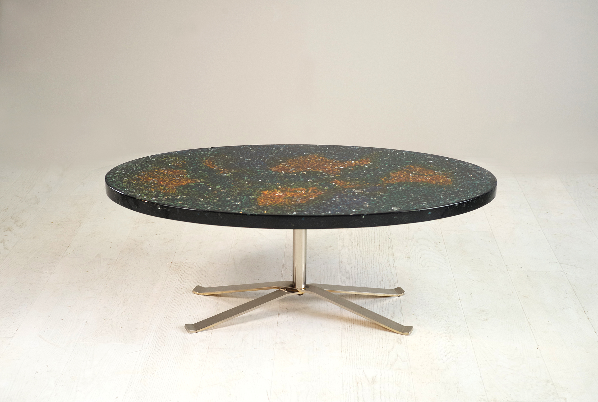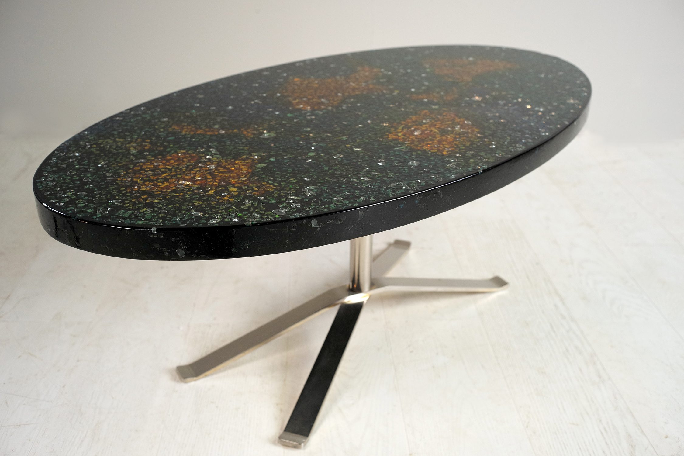 Pierre Giraudon, Table basse à plateau ovale en résine noire à inclusions de verres colorés bleu, orange et vert. Piètement en métal chromé.