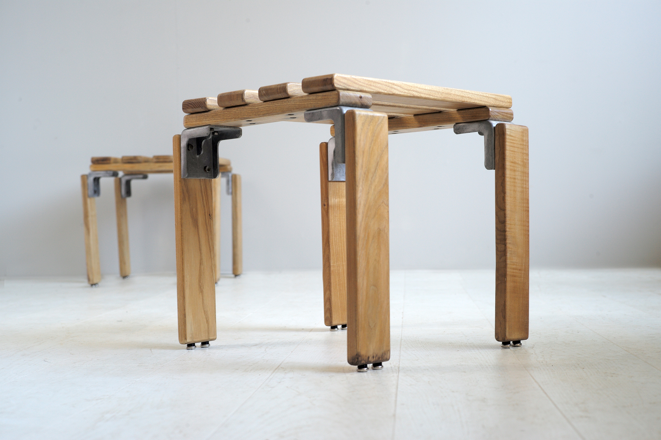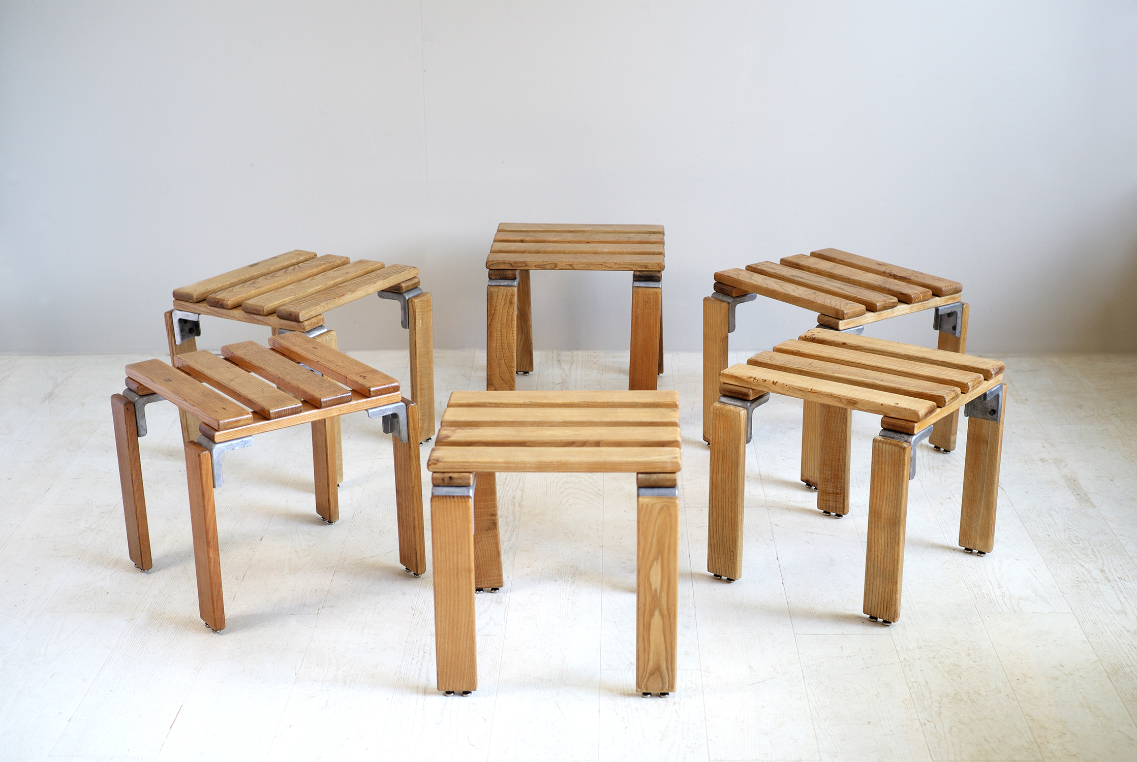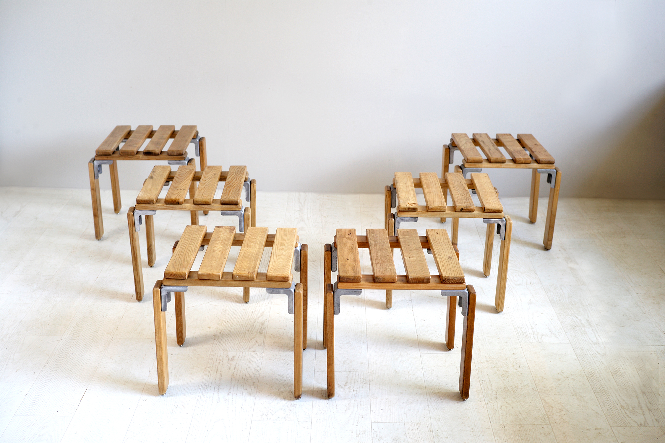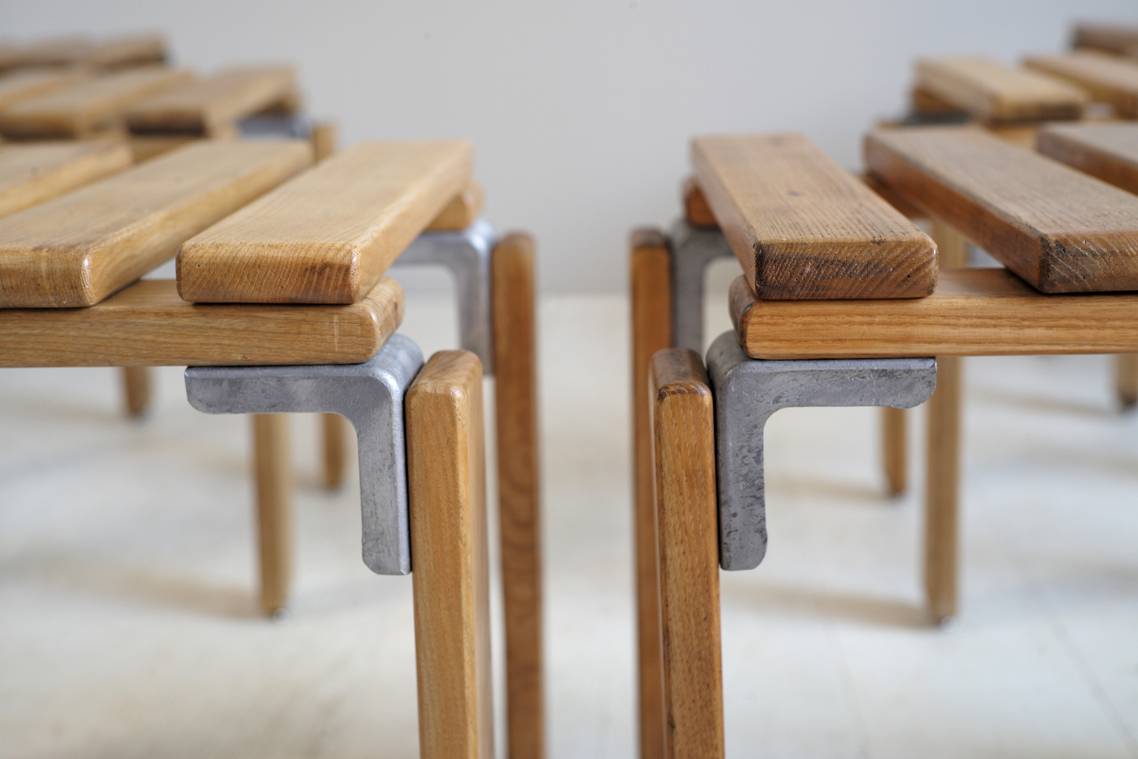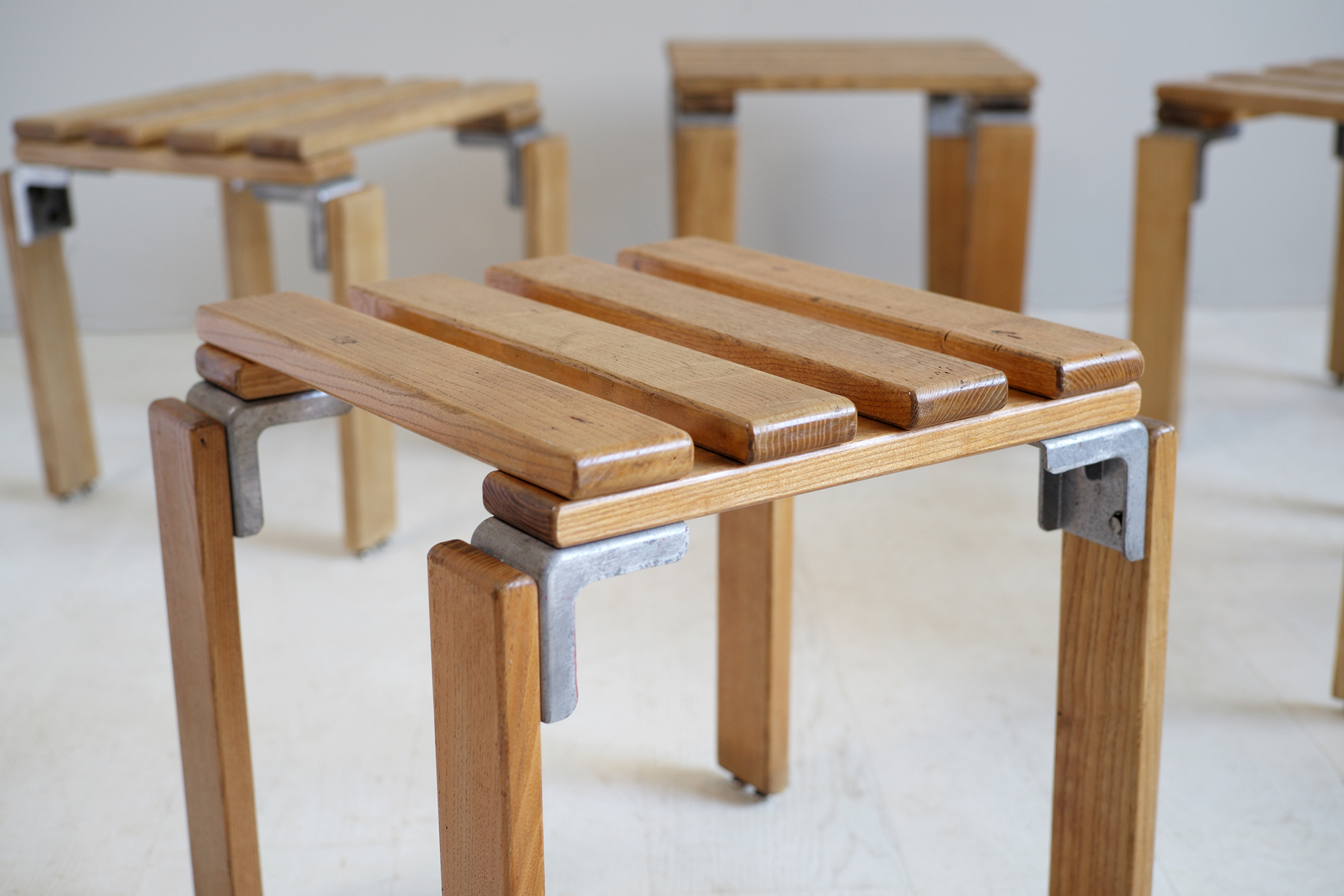 Ensemble de 6 tabourets de Georges Candilis et Anja Blomstedt, édités par Sentou en 1969. Dessinés pour la résidence "Les Carrats" (Port Leucate, France), ce mobilier exclusif combine le frêne et l'aluminium.