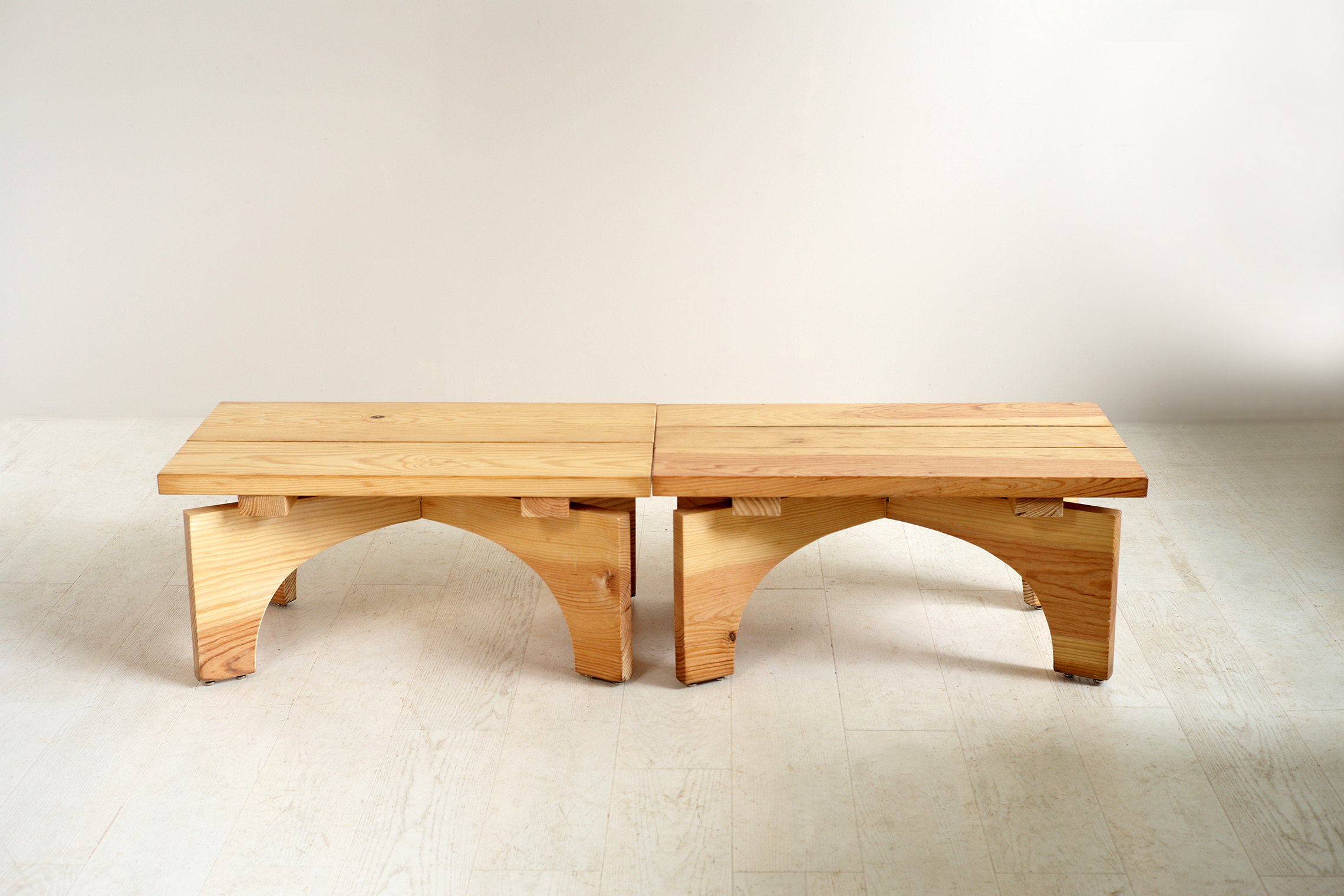 Piètement en arcatures croisées surmontées de deux traverses, plateau latté.