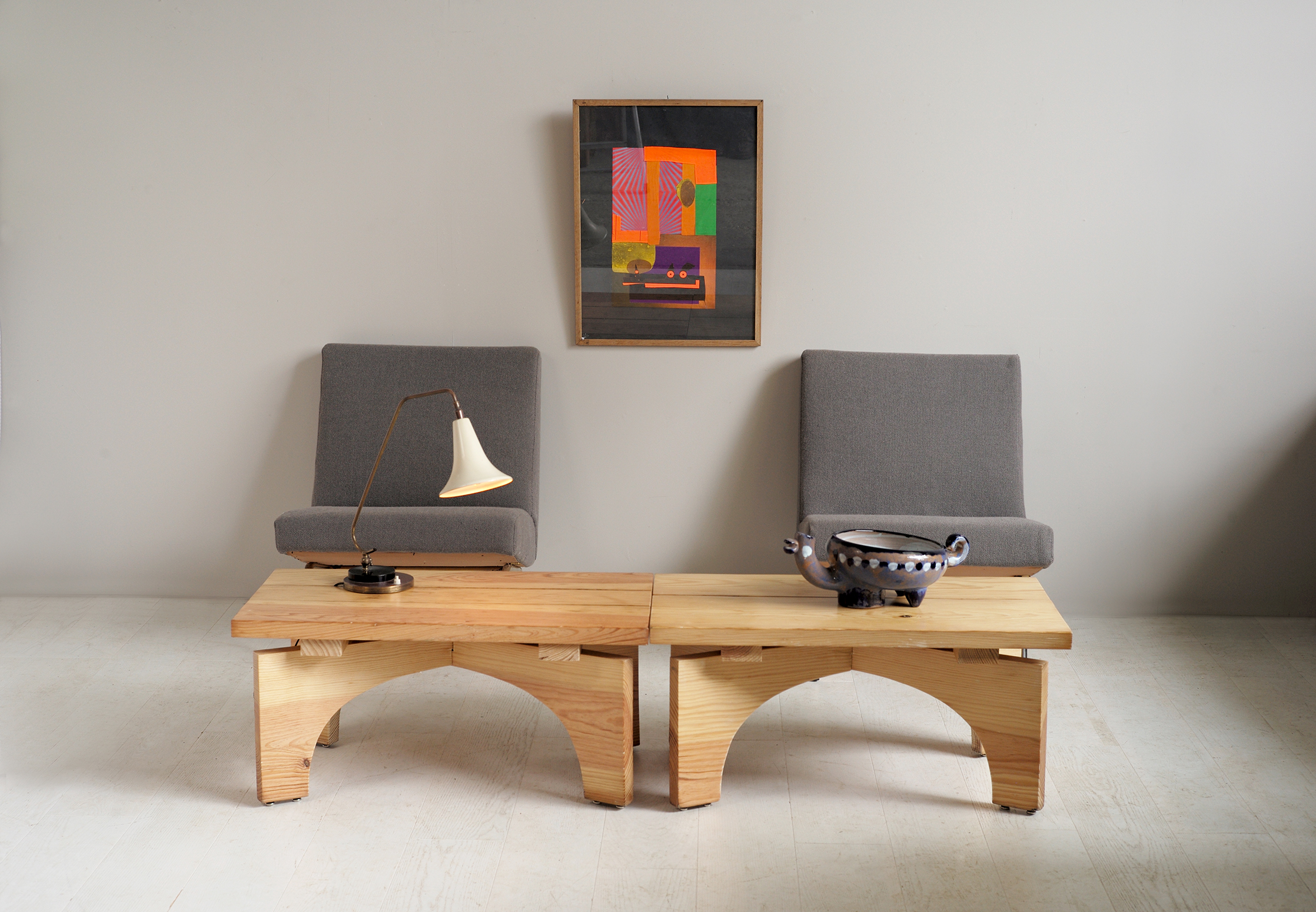 Paire de tables basses en pin provenant du mobilier de la piscine Foncillon, Royan, France, 1950.