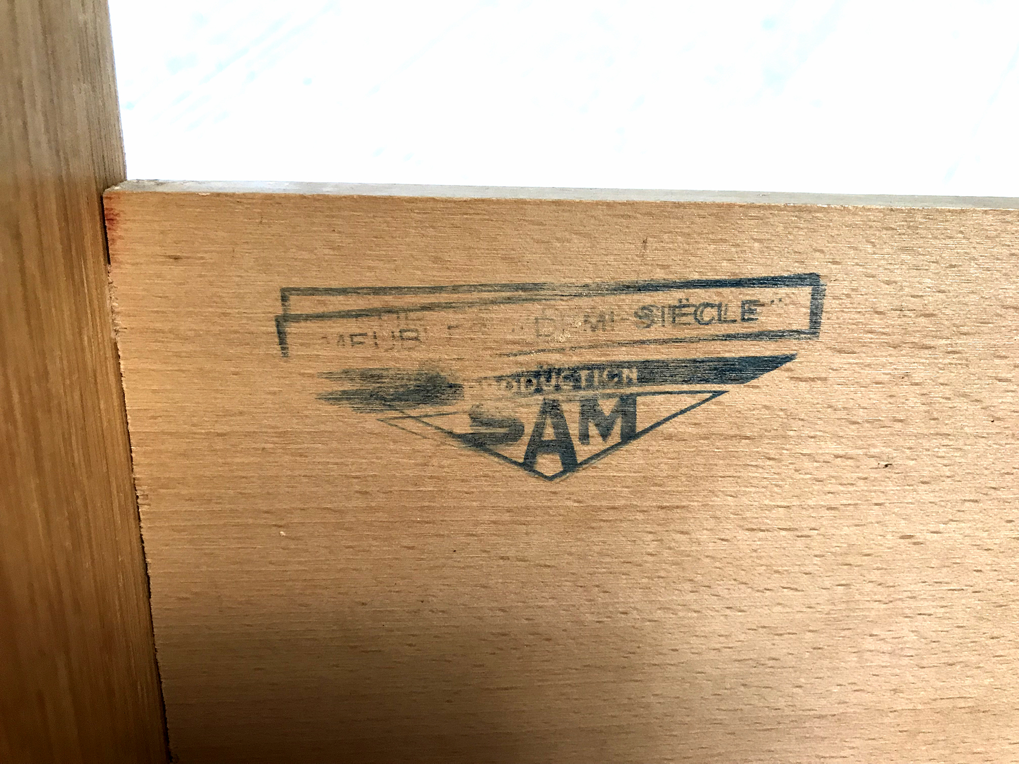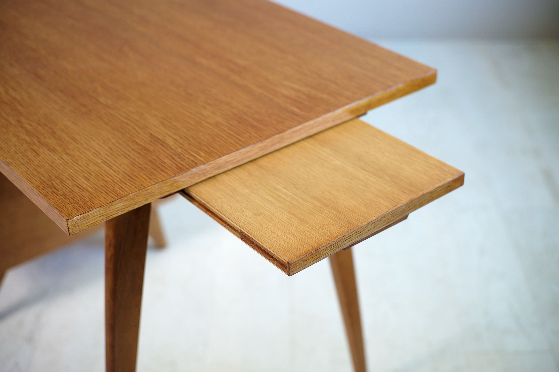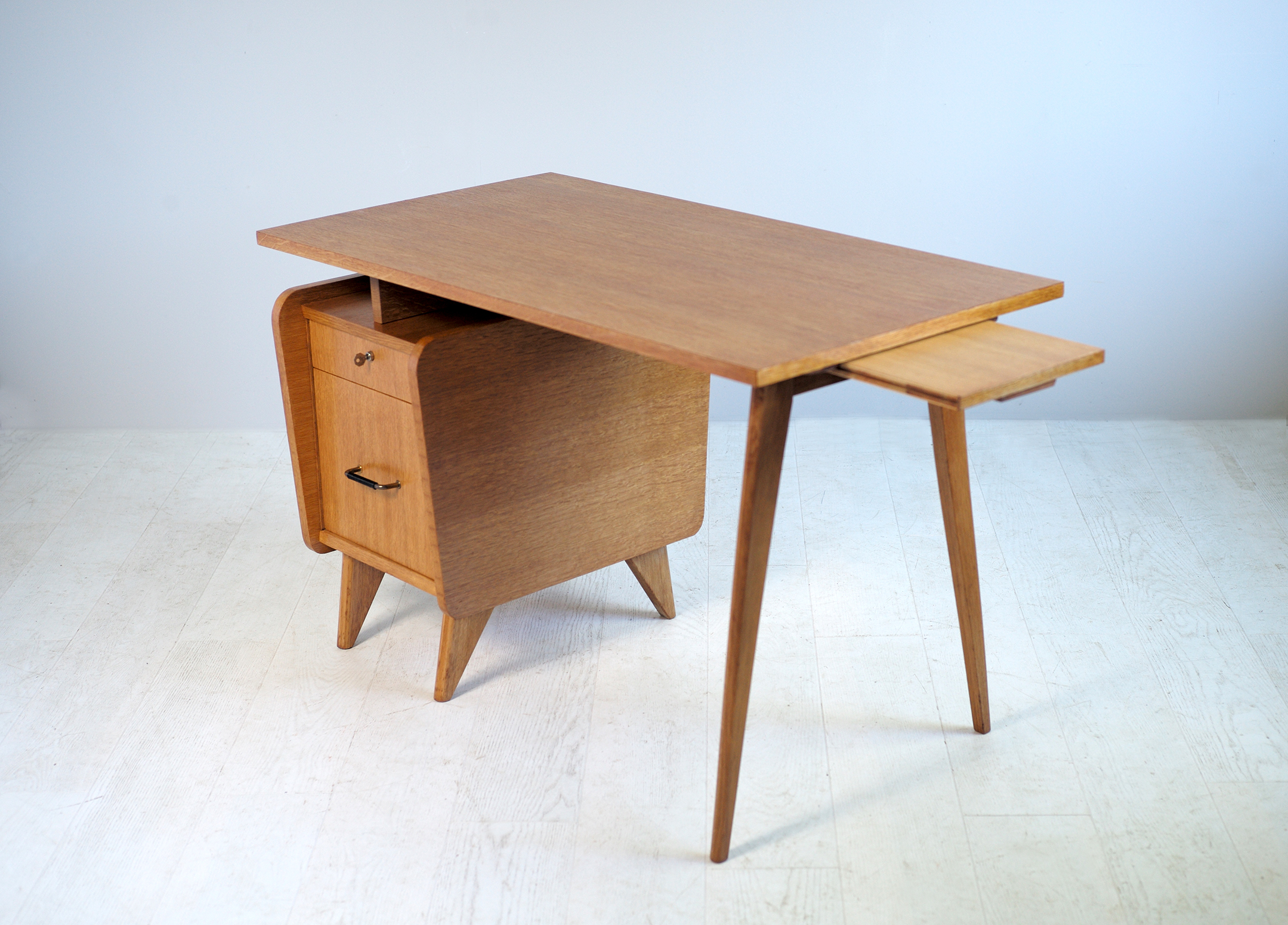 Bureau en chêne blond signé SAM (Société Auxiliaire du Meuble. Dans le style Reconstruction Française, ce joli bureau à pied compas est doté d'un caisson à deux tiroirs et d'une tablette coulissante sous le plateau. On peut le disposer à droite ou à gauche