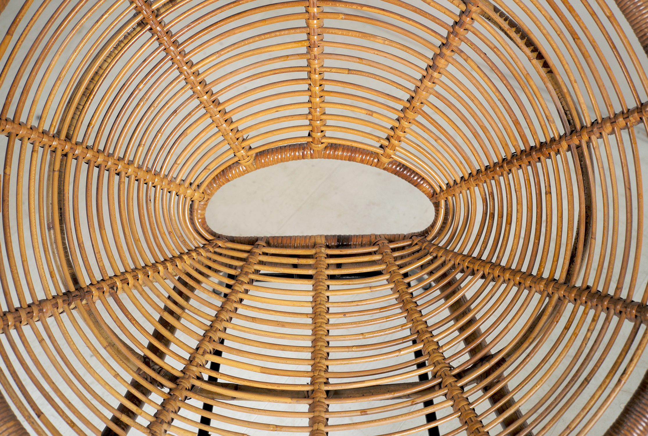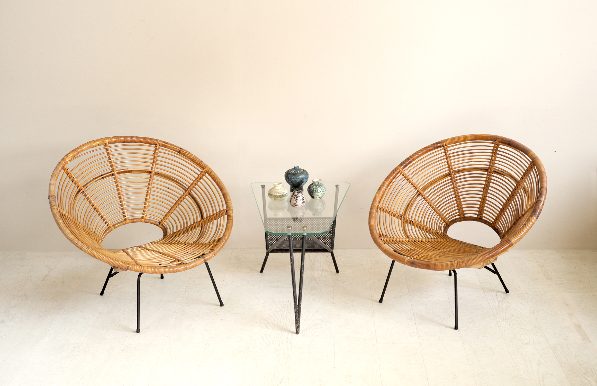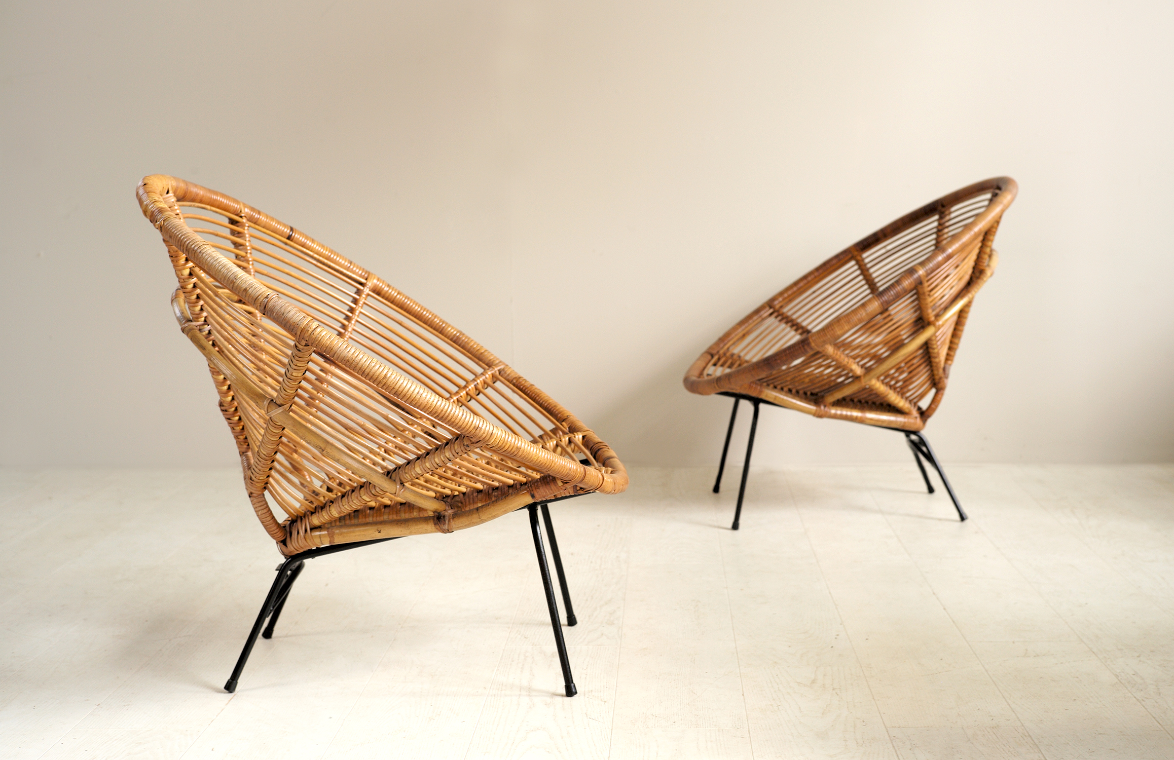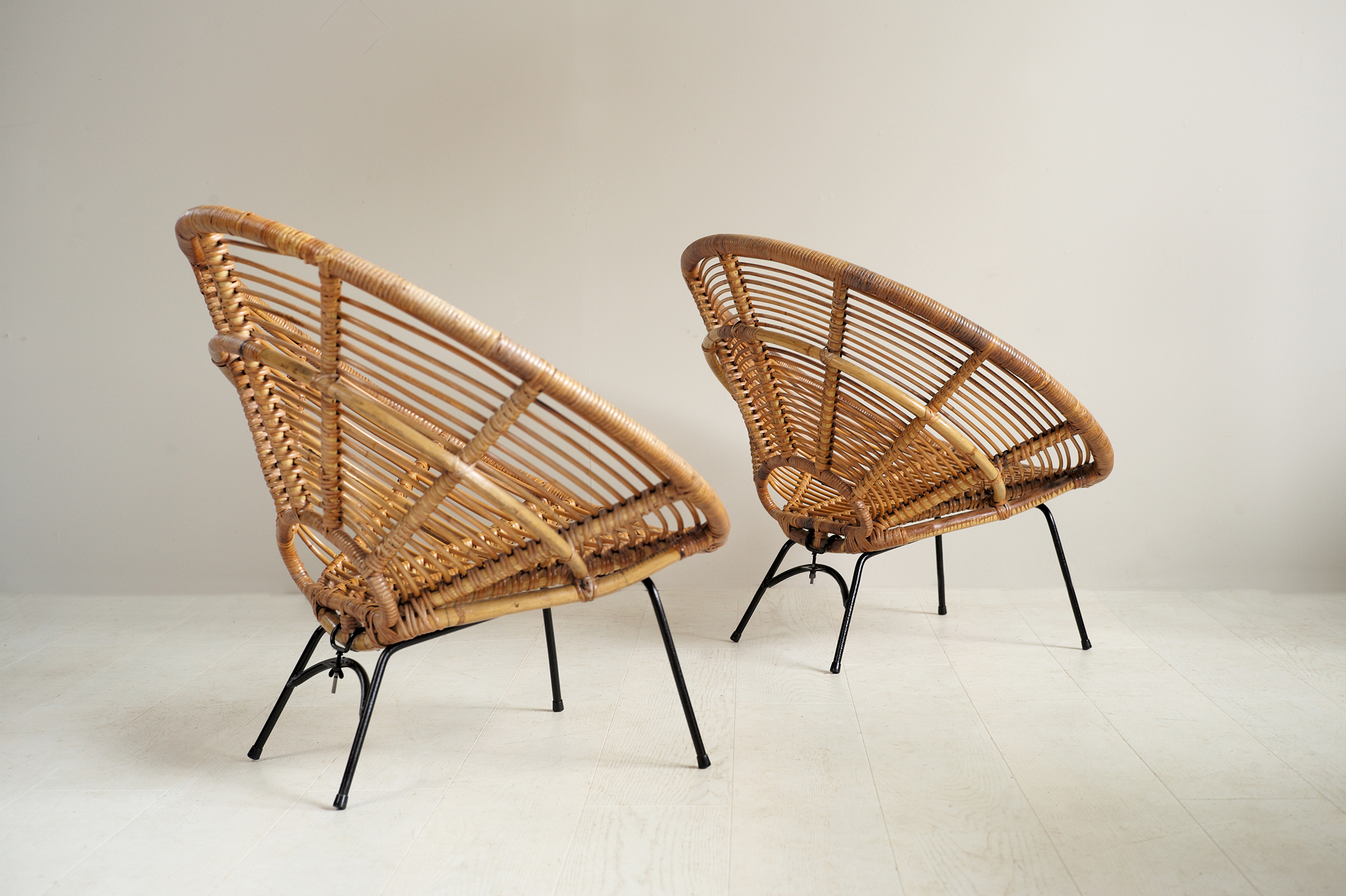 Paire de fauteuils "Soleil" en rotin tressé, France 1960. L'assise, maintenue par un écrou papillon, repose sur un berceau tubulaire en métal laqué noir. On peut ainsi ranger les fauteuils en empilant les sièges l'hiver ou les garder toute l'année dans votre salon, leur allure et leur confort permettant toutes les utilisations.