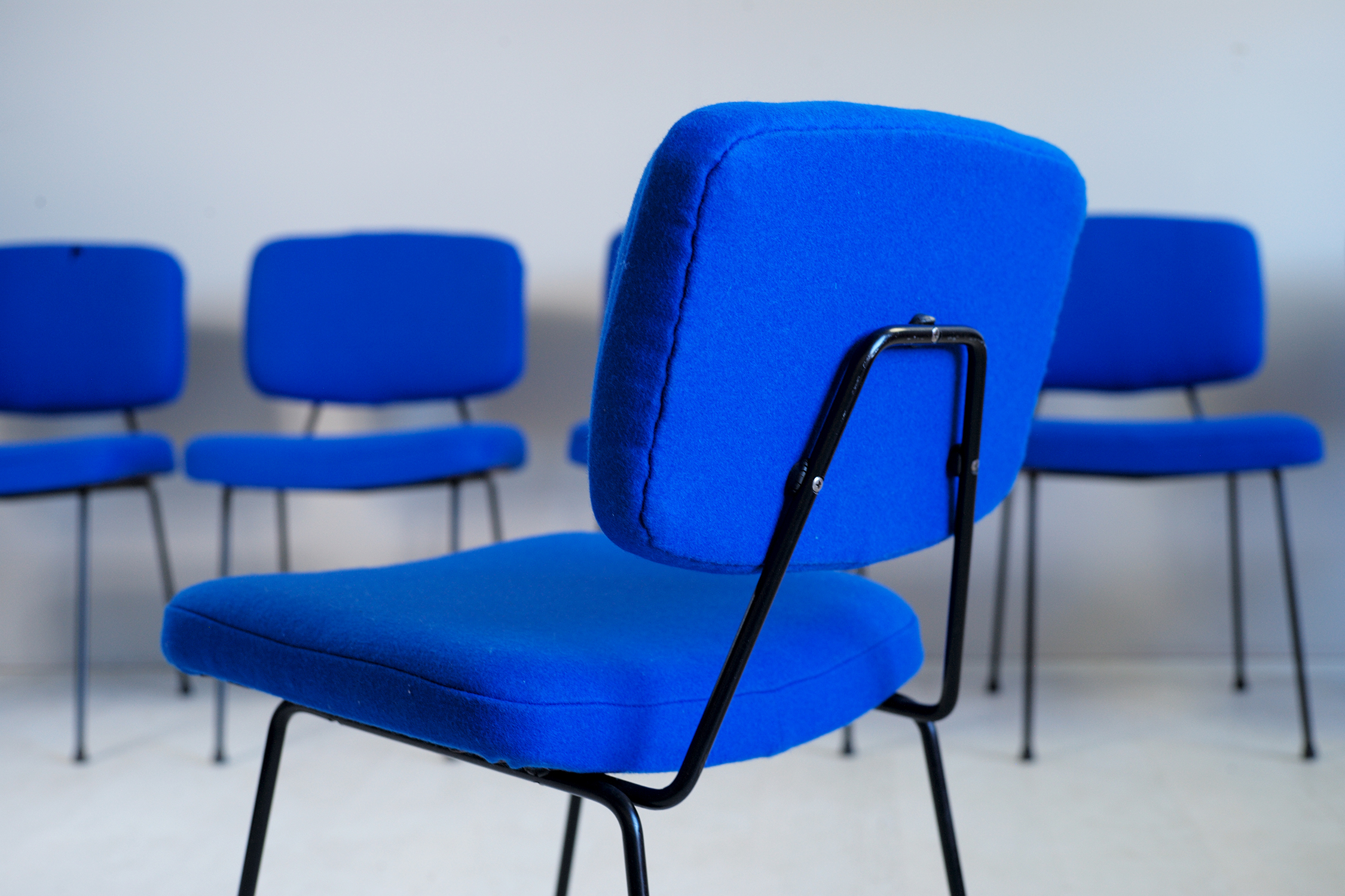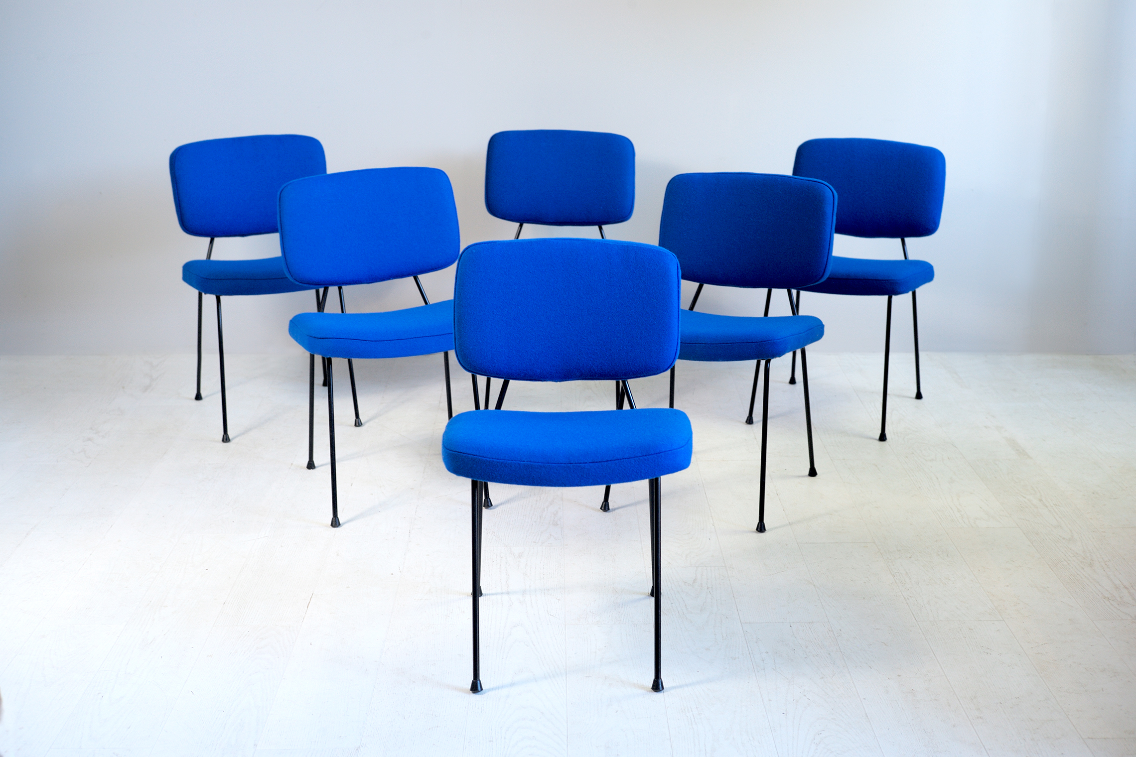 Ensemble de 6 chaises CM 196 de Pierre Paulin, éditées par Thonet France en 1960. Piètement en métal tubulaire plein laqué noir, assises et dossier refaits mousse et tissu Kvadrat Divina bleu.