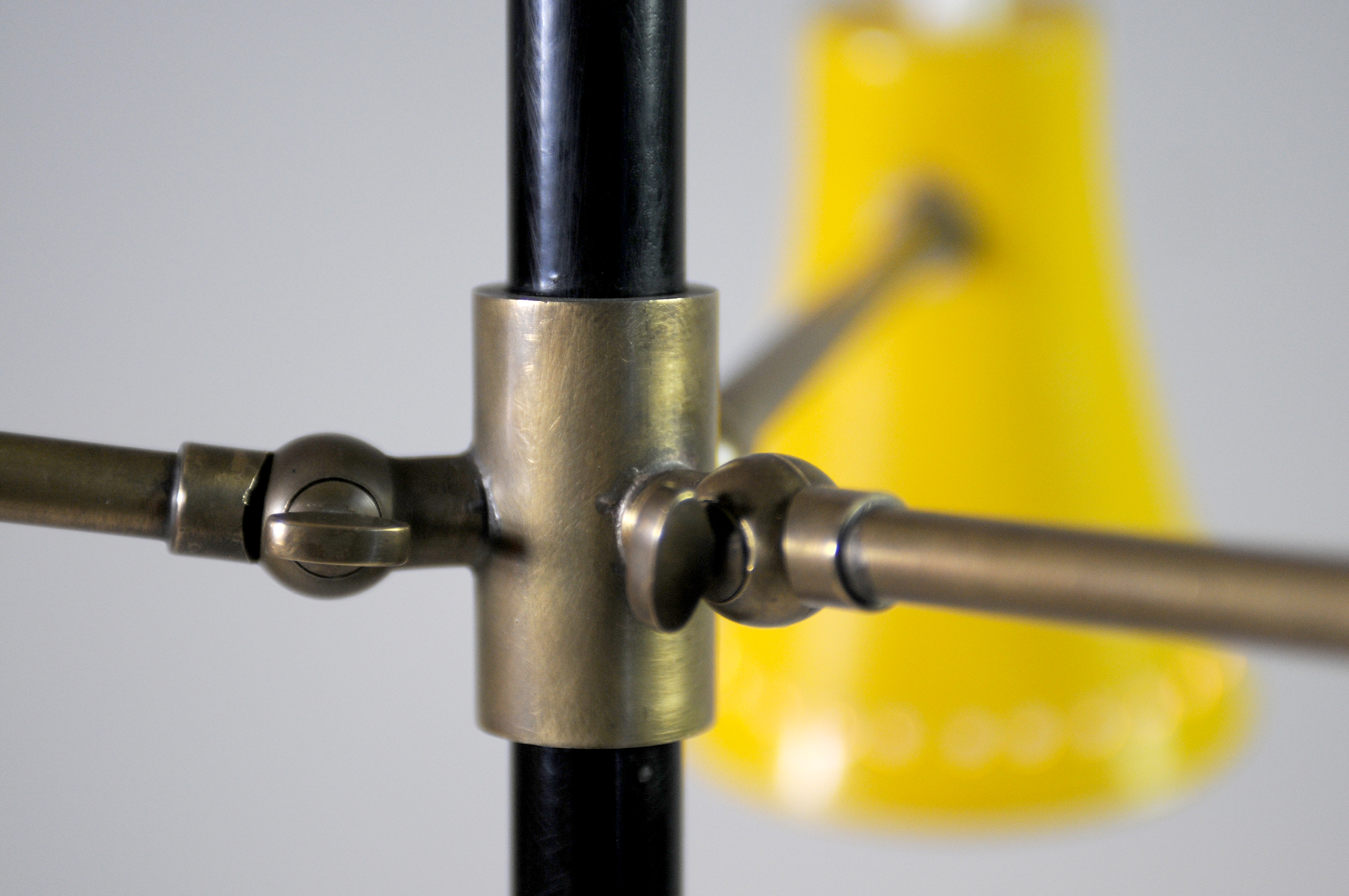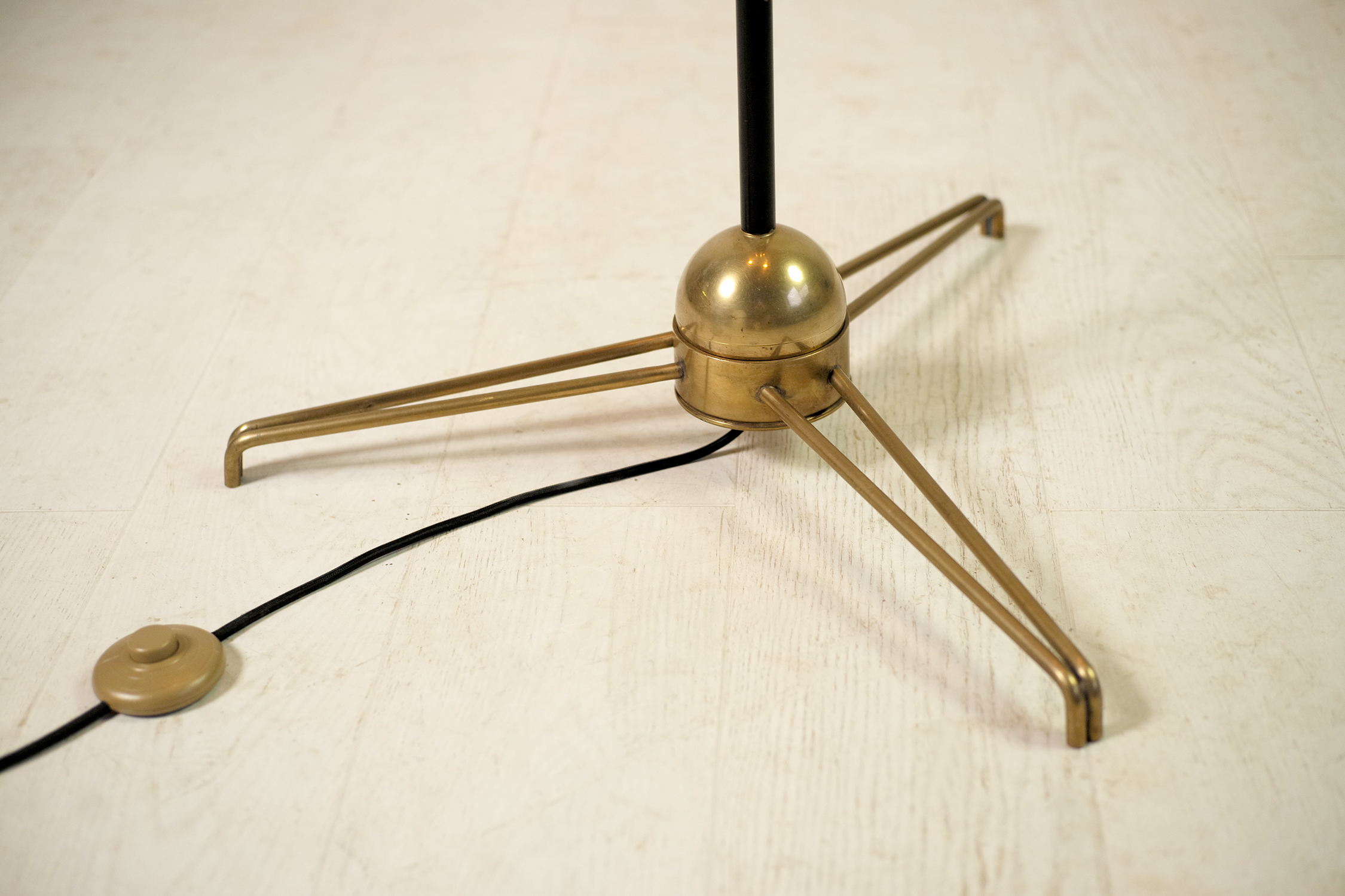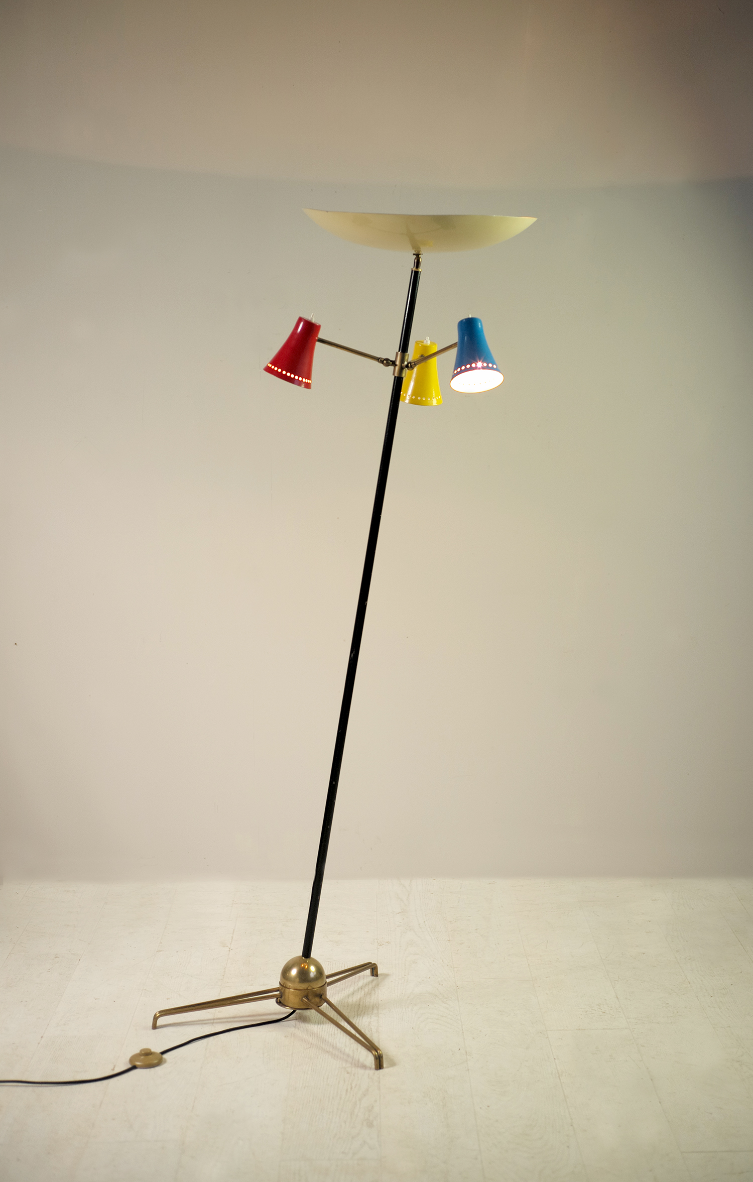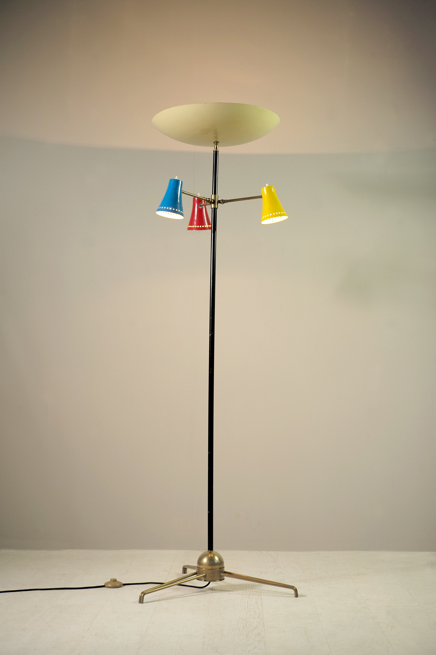 Lampadaire tripode en métal laqué et laiton, Stilnovo 1950. Le fût laqué noir repose sur une sphère lourdement plombée permettant de régler l'inclinaison. Trois bras de lumières réglables par une rotule à clé reçoivent un réflecteur polychrome bleu, jaune et rouge. Chacun est équipé d'un interrupteur à bouton poussoir. En haut, une grande vasque réglable par rotule fournit une lumière indirecte.
