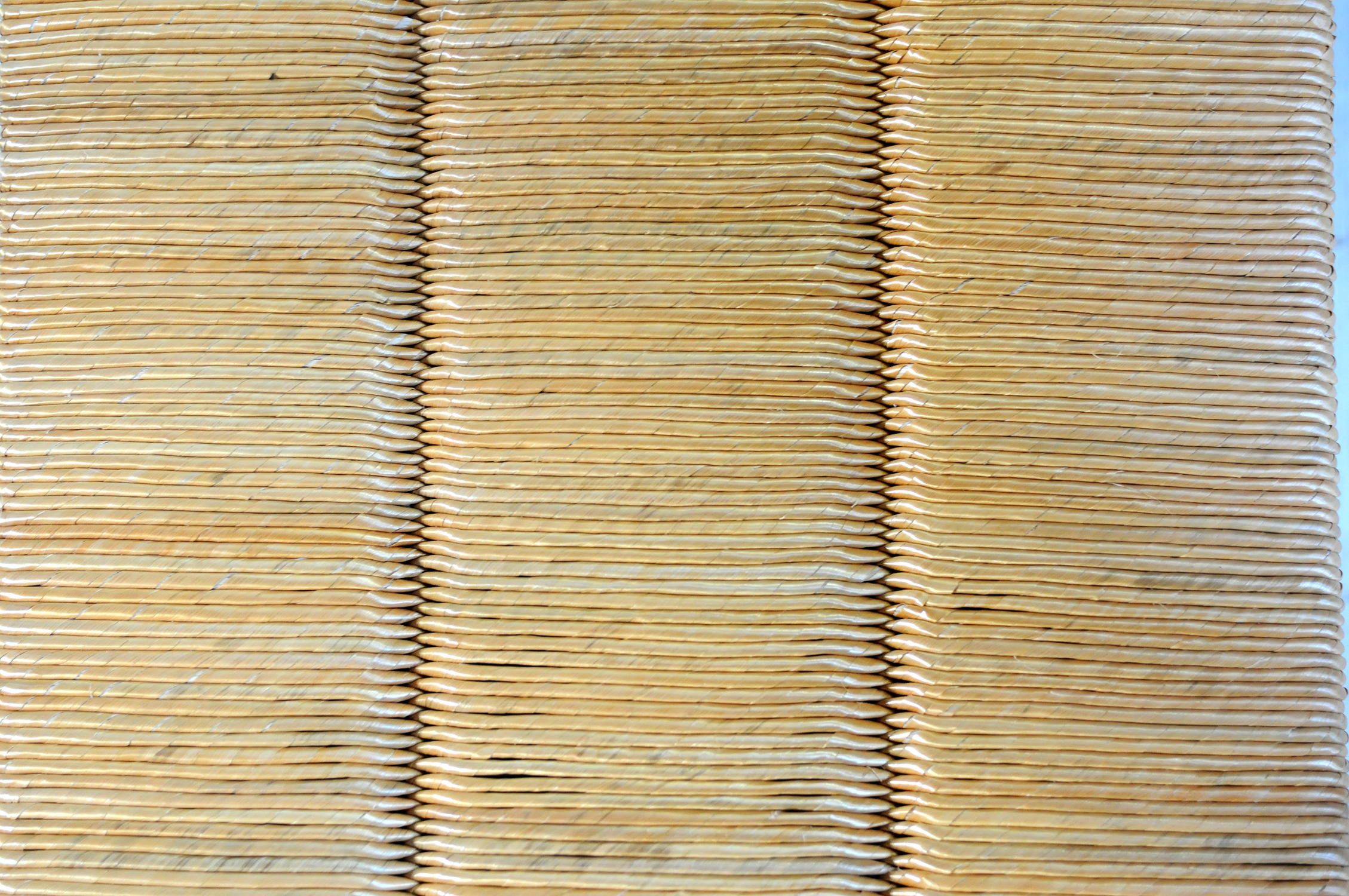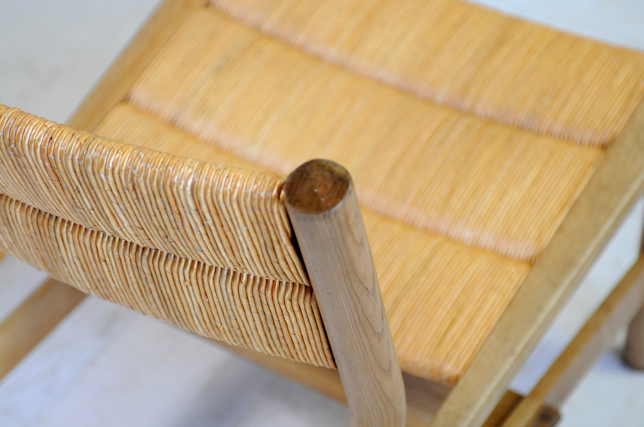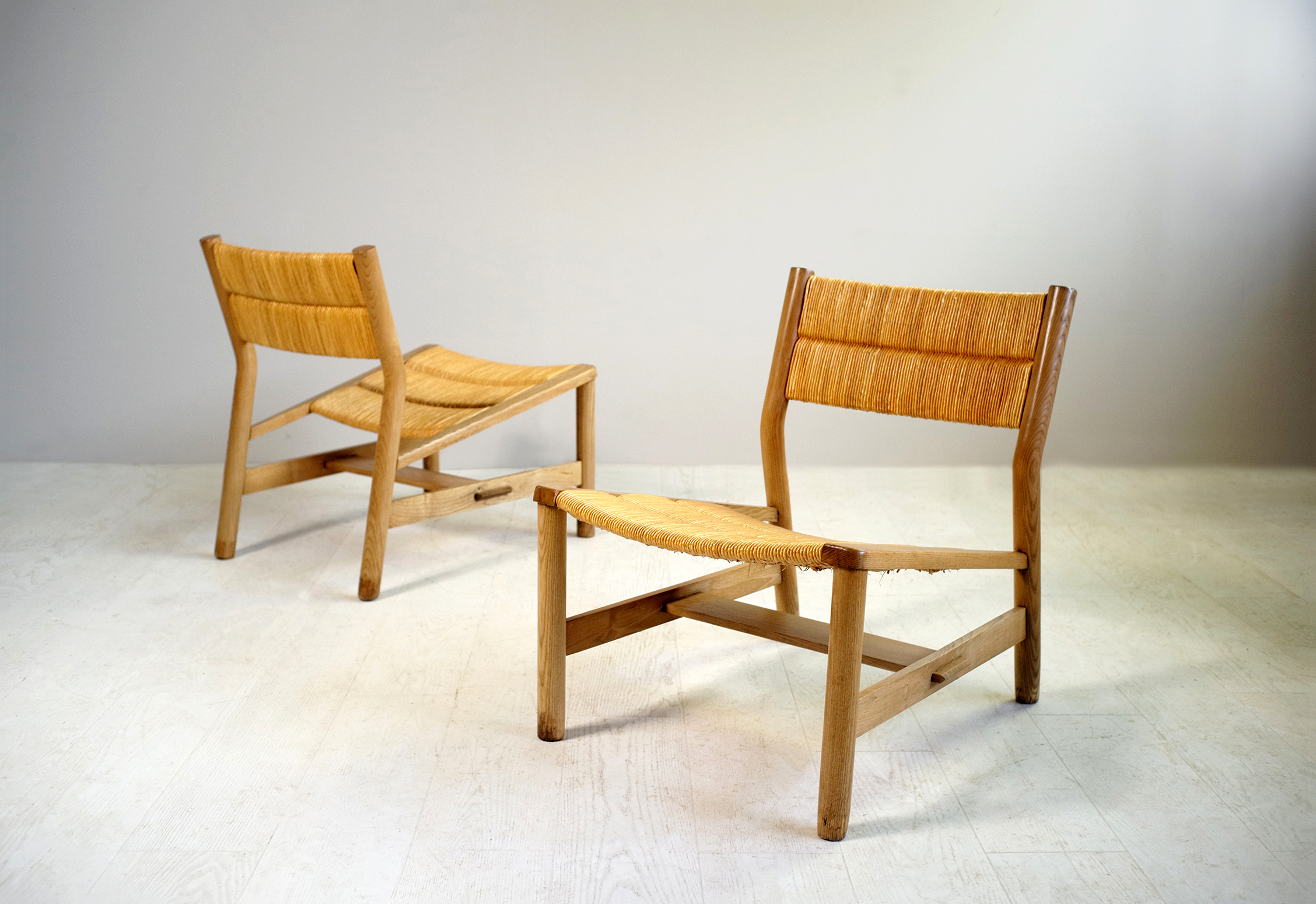 Pierre Gautier-Delaye, paire de chauffeuses en frêne et paille, édition Vergnères, France 1956. Puisant dans le registre du mobilier populaire, Pierre Gautier-Delaye conçoit la série Week-end au début des années 50, privilégiant les matériaux naturels comme le pin, le frêne et la paille. Il reçoit le prix Gabriel pour cette création.