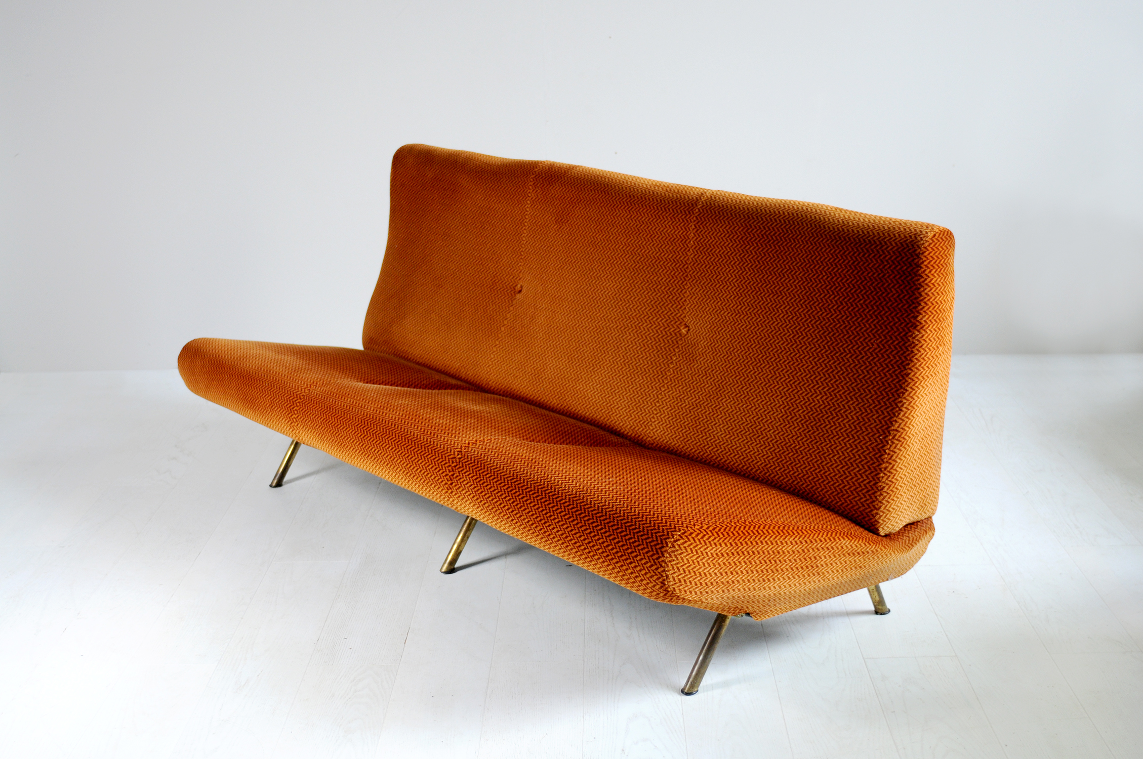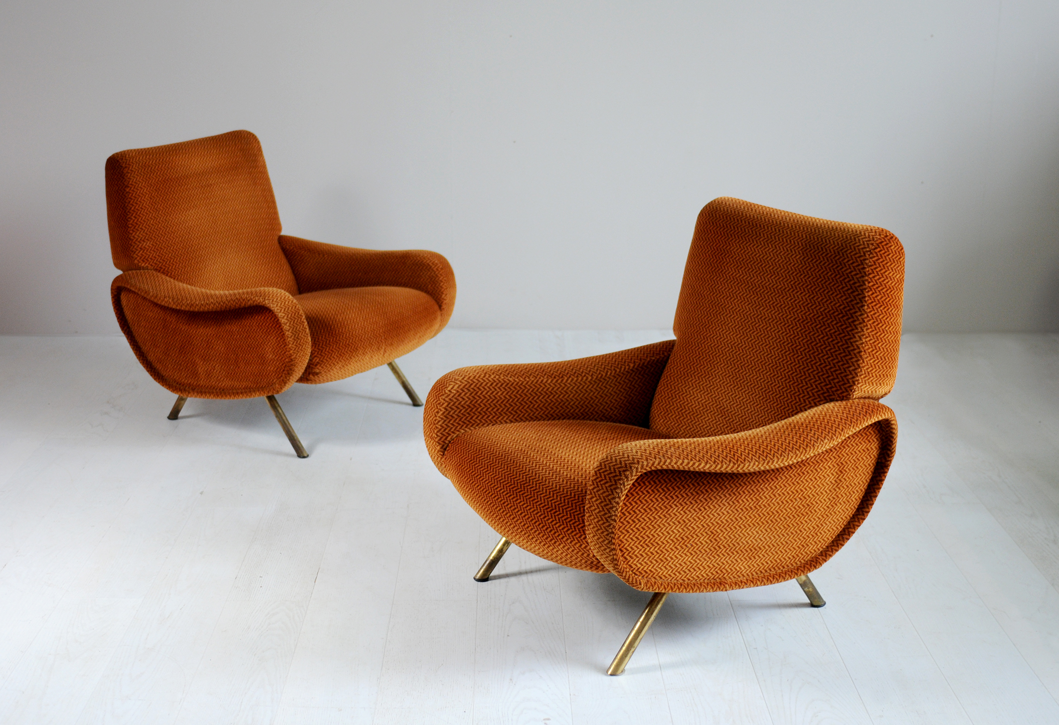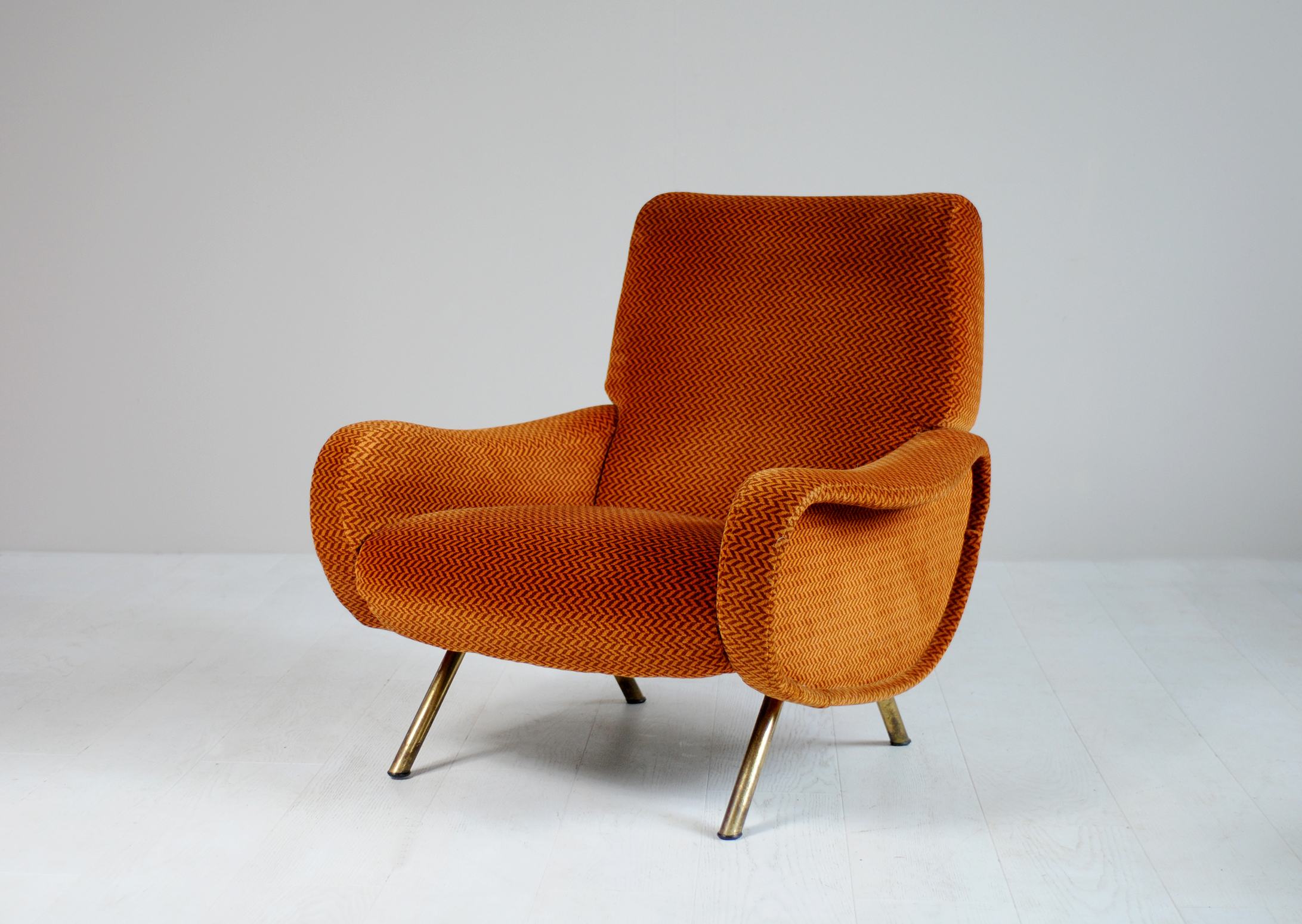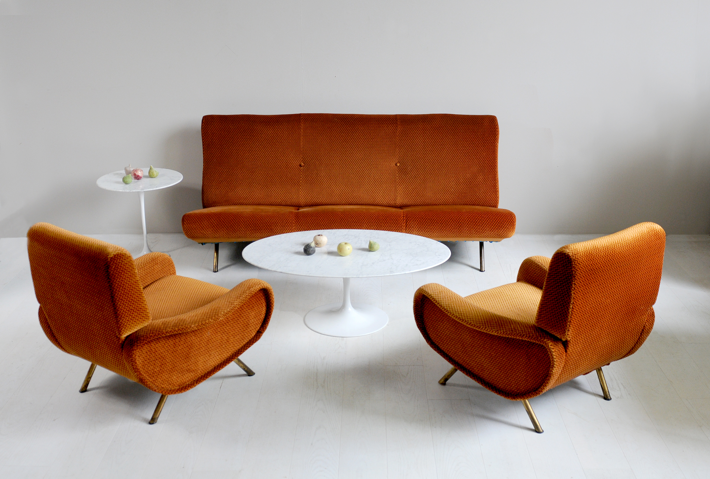Salon composé d'un canapé 3 places Triennale et deux fauteuils Lady créés par Marco Zanuso pour Arflex, Italie 1951.Recouvert de velours Rouge-orangé à décor de chevrons, cet ensemble est dans un état de fraicheur remarquable.