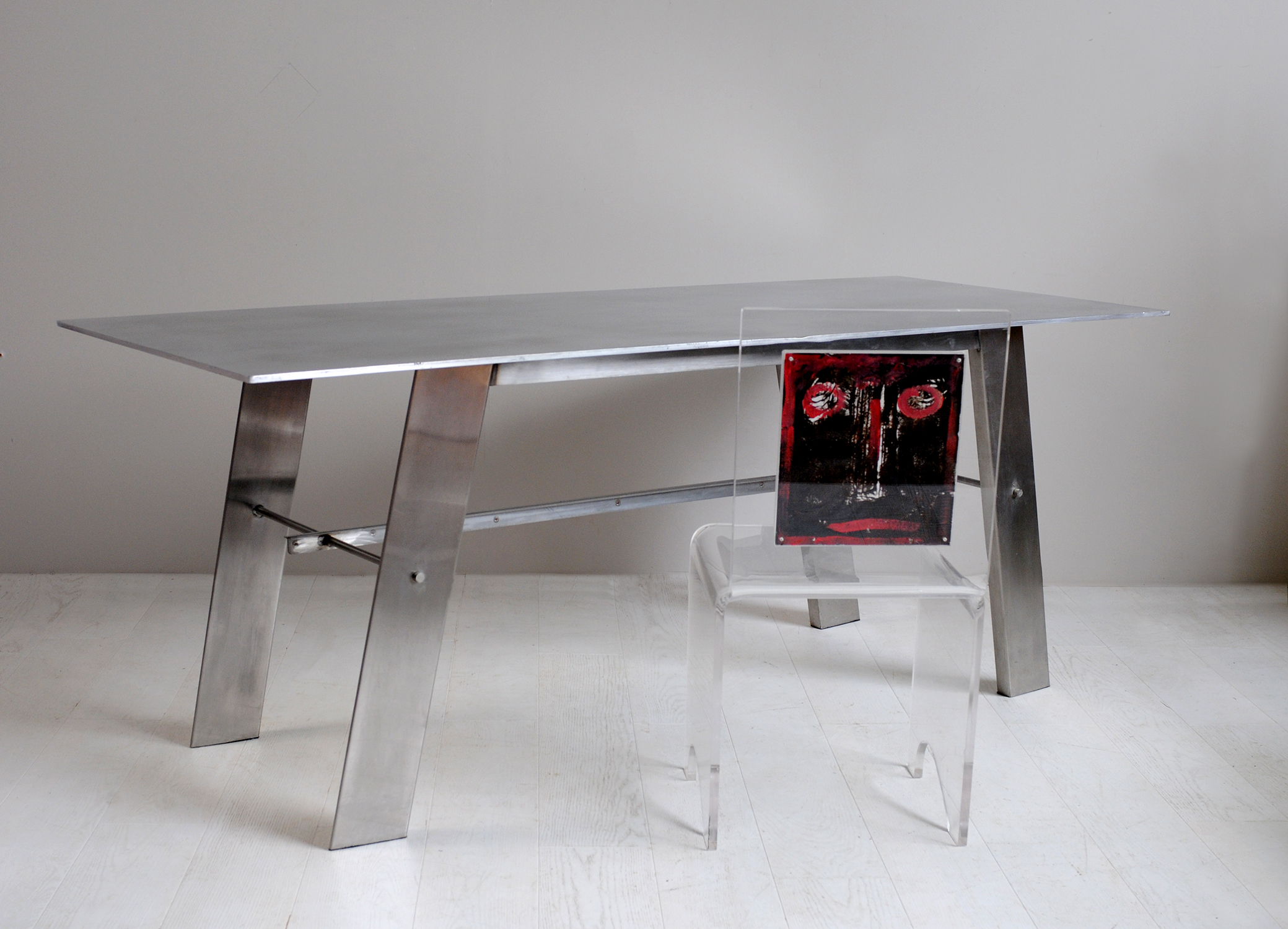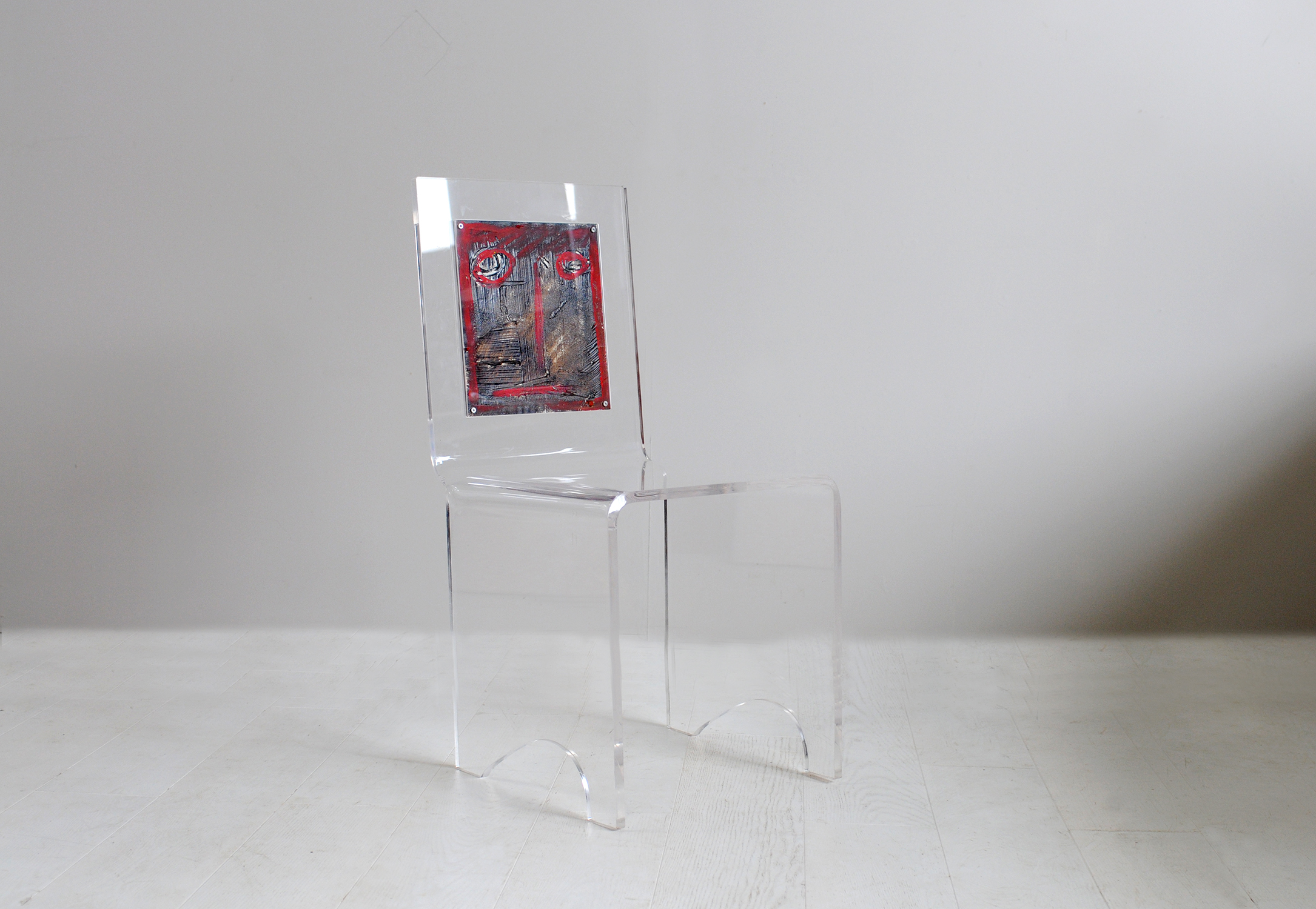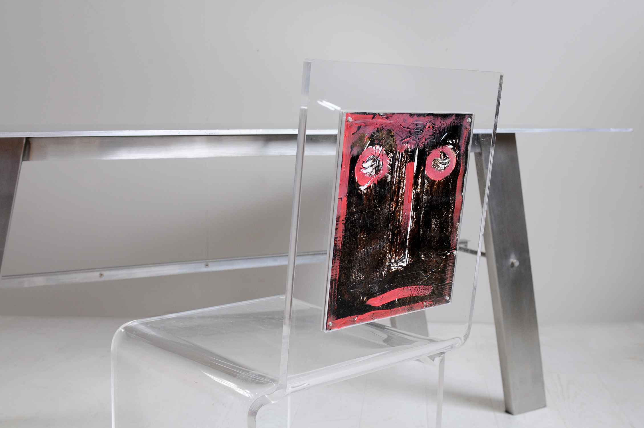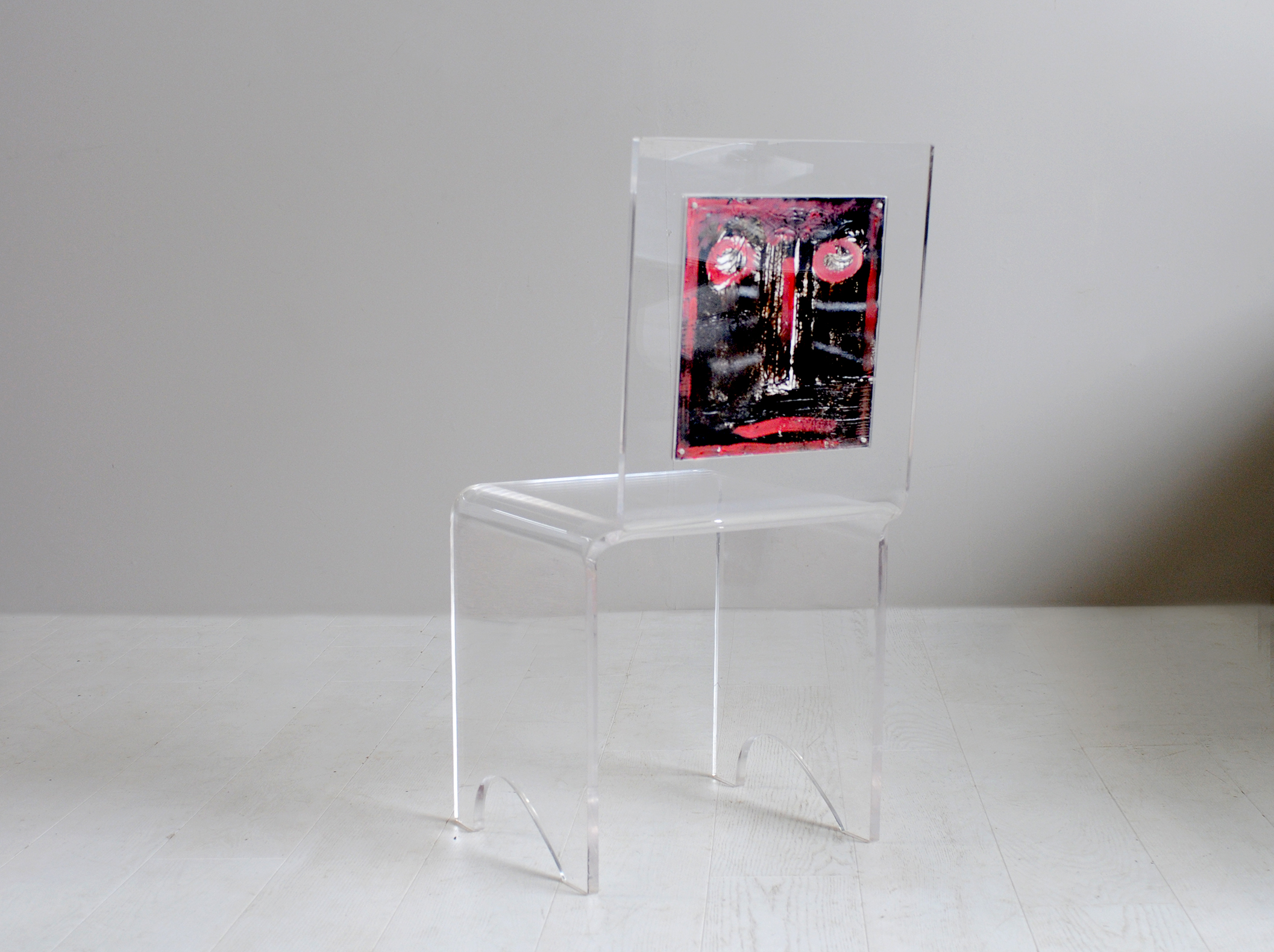 Chaise aux 2 masques, France 2010. Insérés dans le dossier deux œuvres sur toile signées Yves le Guellec.