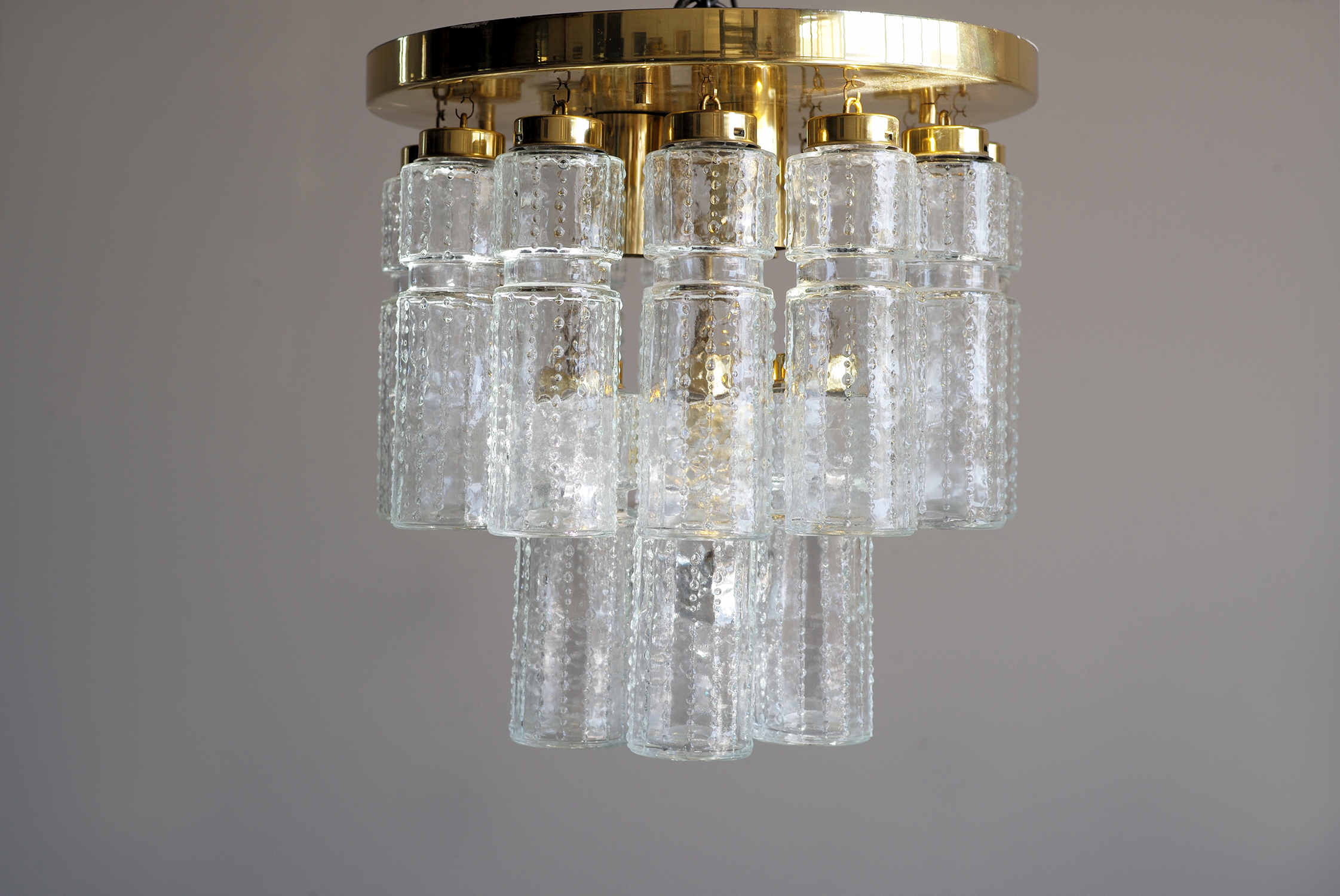 Ensemble de 3 luminaires de la maison Limburg (Allemagne 1960), composé d'un plafonnier à 3 lumières et de deux plafonniers a une lumière. Métal doré et verre soufflé.