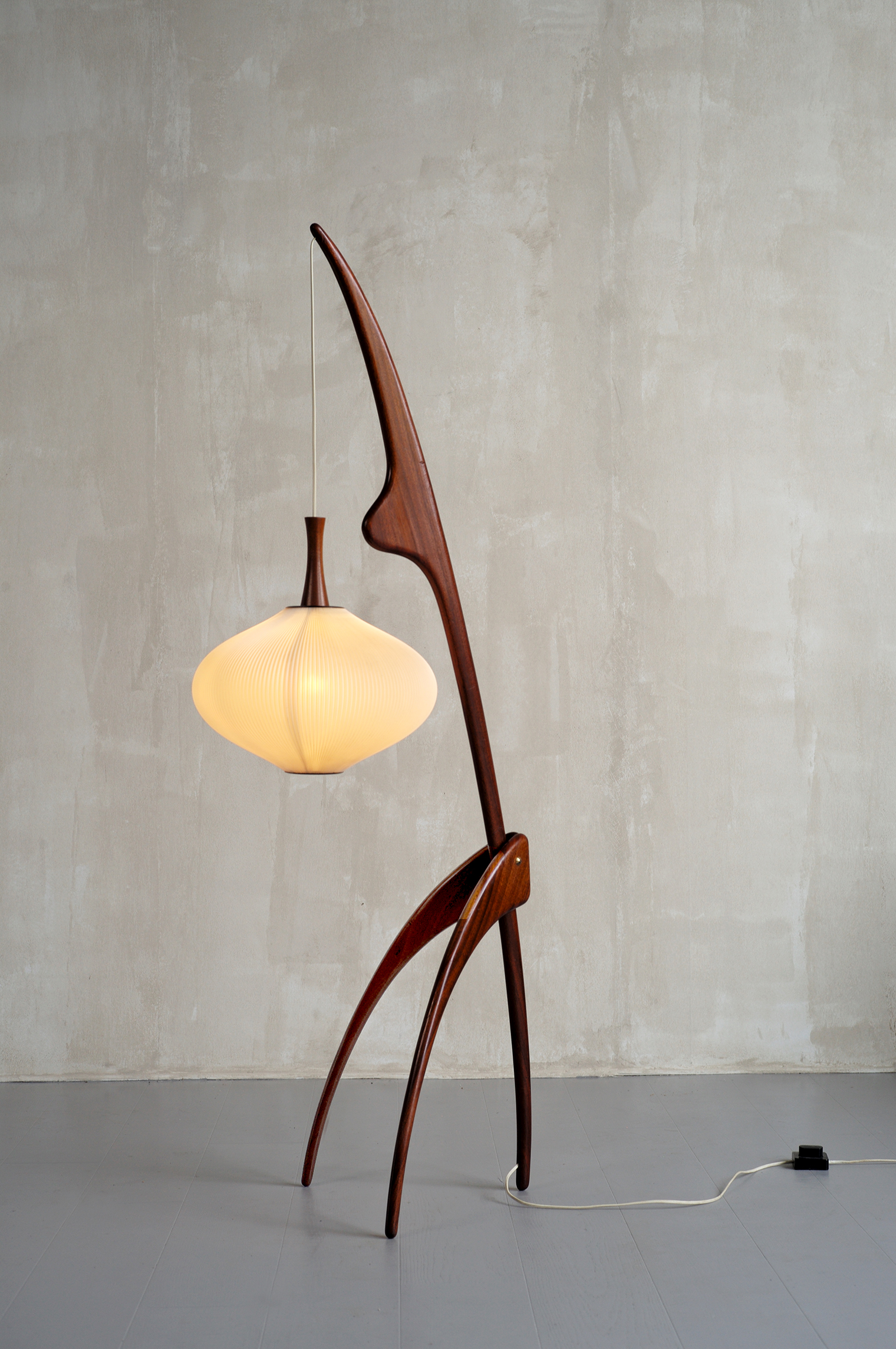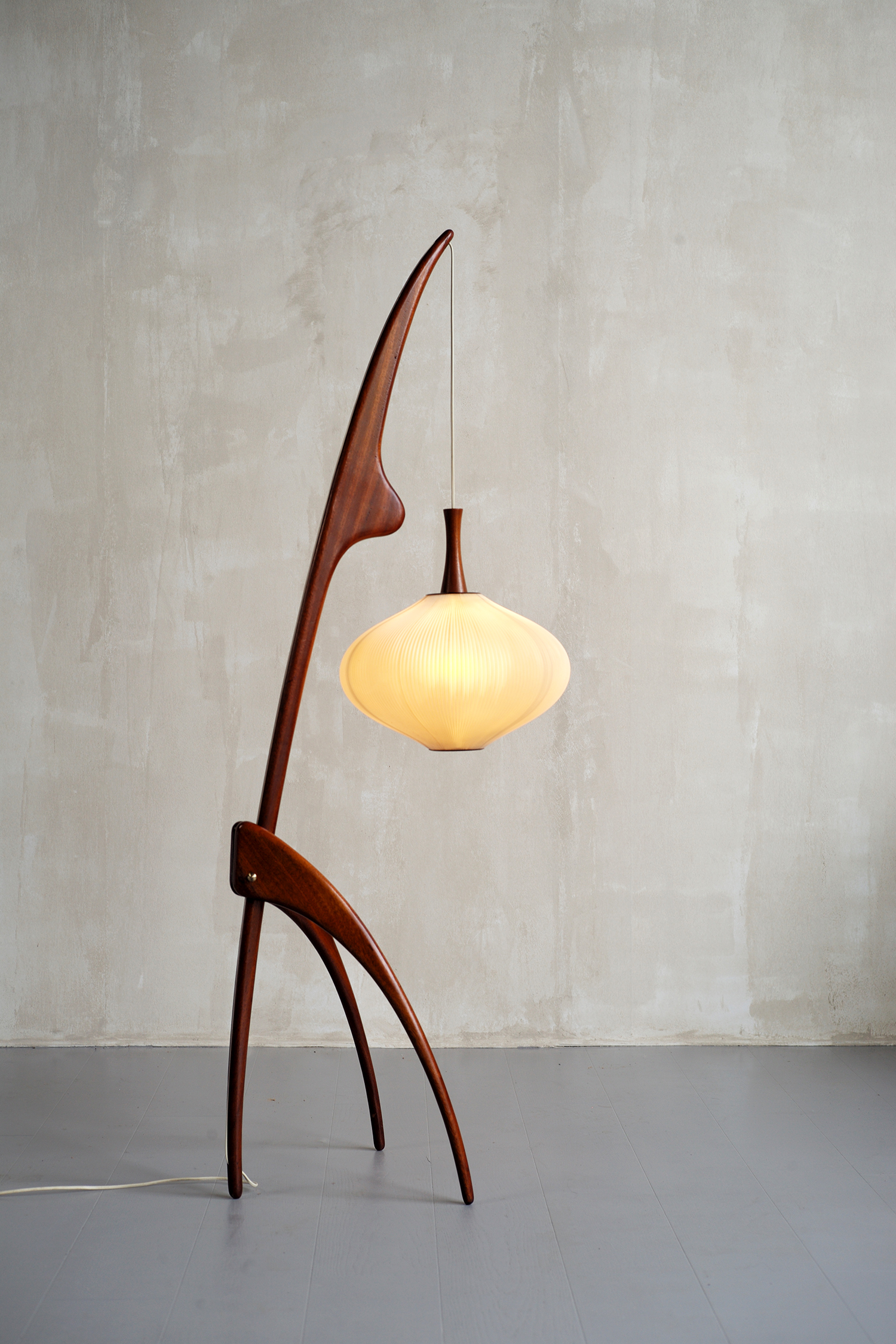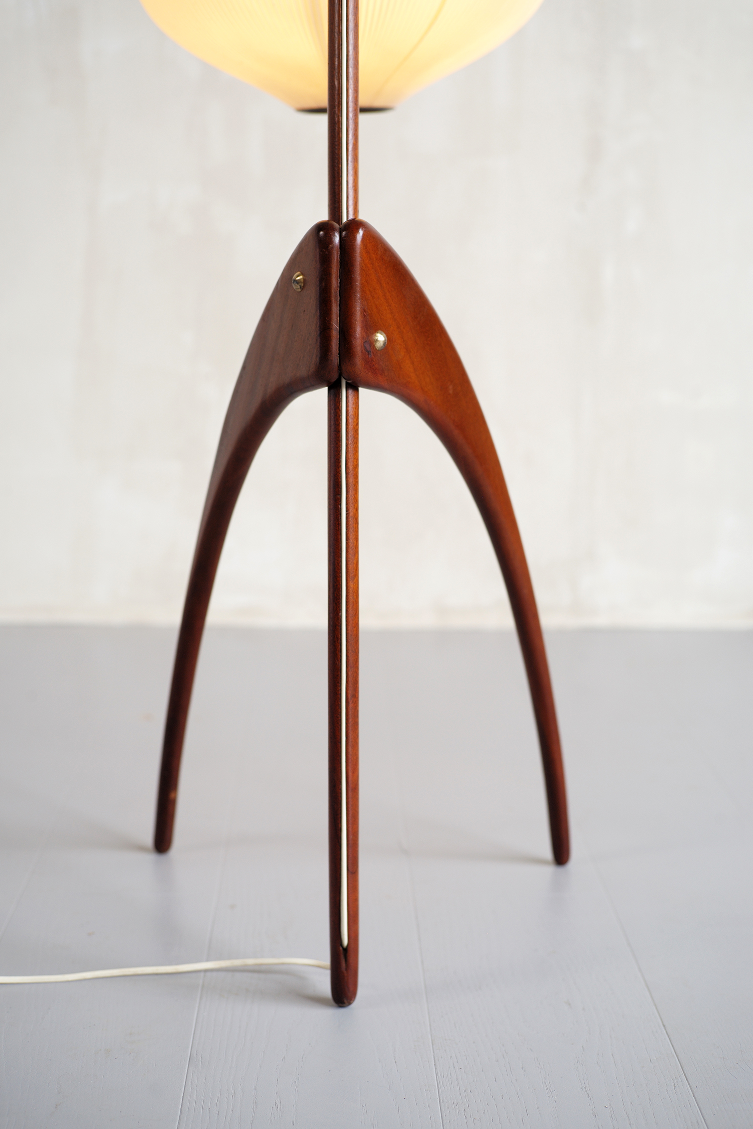 Jean Rispal, Lampadaire tripode n° 14.950 surnommé "Mante Religieuse", acajou massif et abat-jour en rhodoid plissé. Créé en 1950, présenté au Salon des arts ménagers en 1955 sous sa version définitive, ce luminaire est aujourd'hui un des grands classiques du design français.