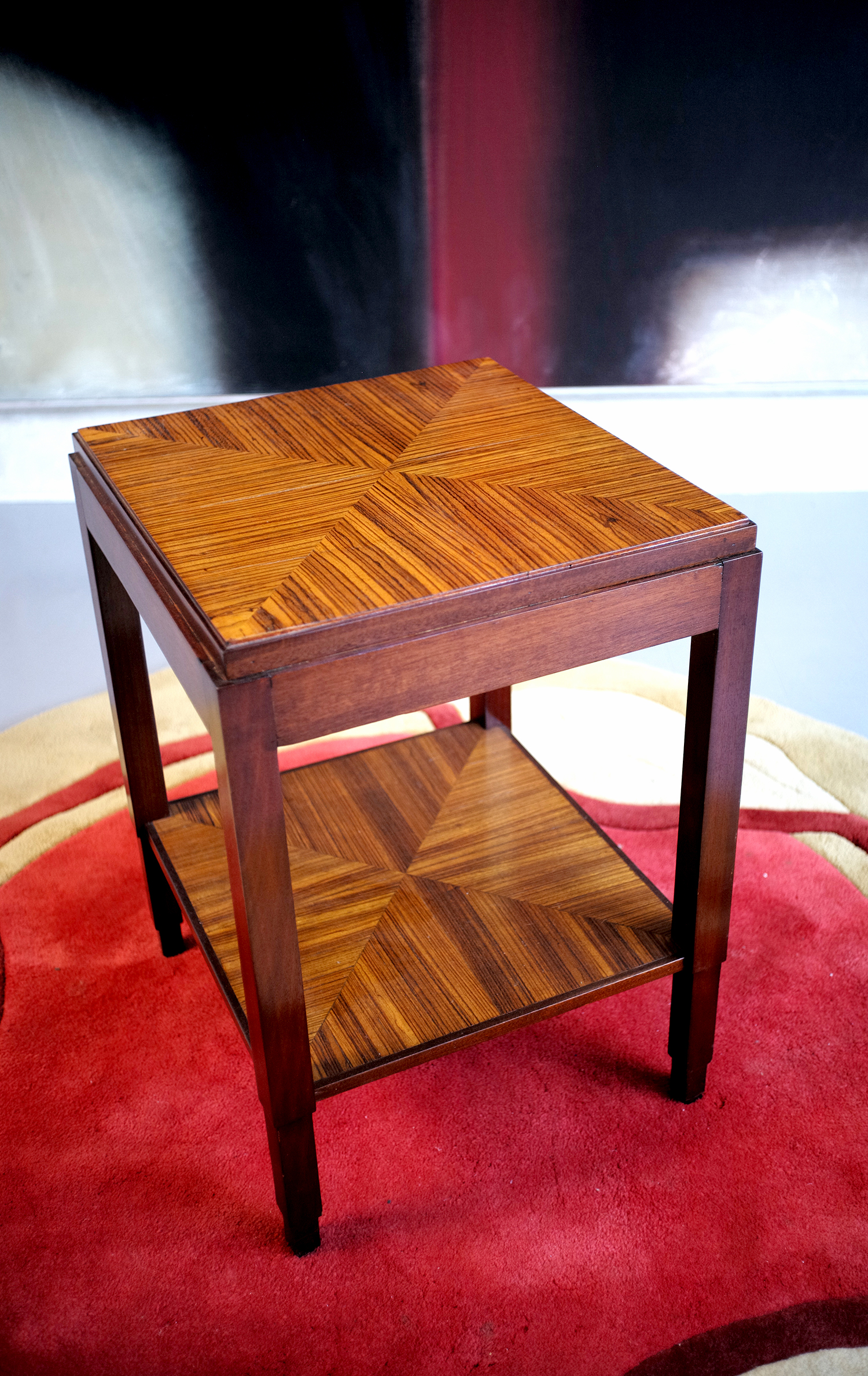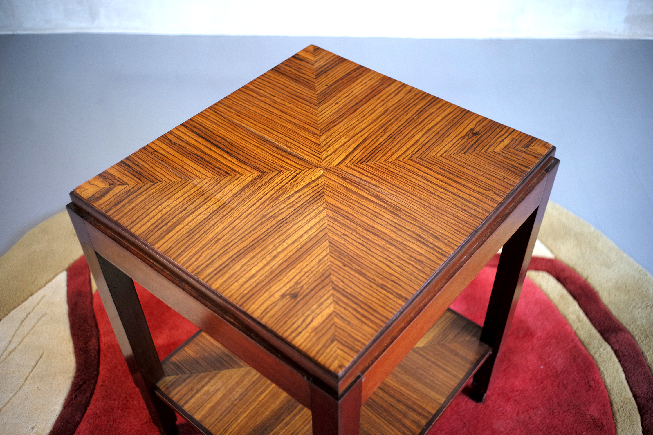 Table de milieu en acajou et Zebrano, France 1940. Piètement à gradins, plateau inférieur et supérieur en placage de Zebrano rayonnant. Très beau dessin.
