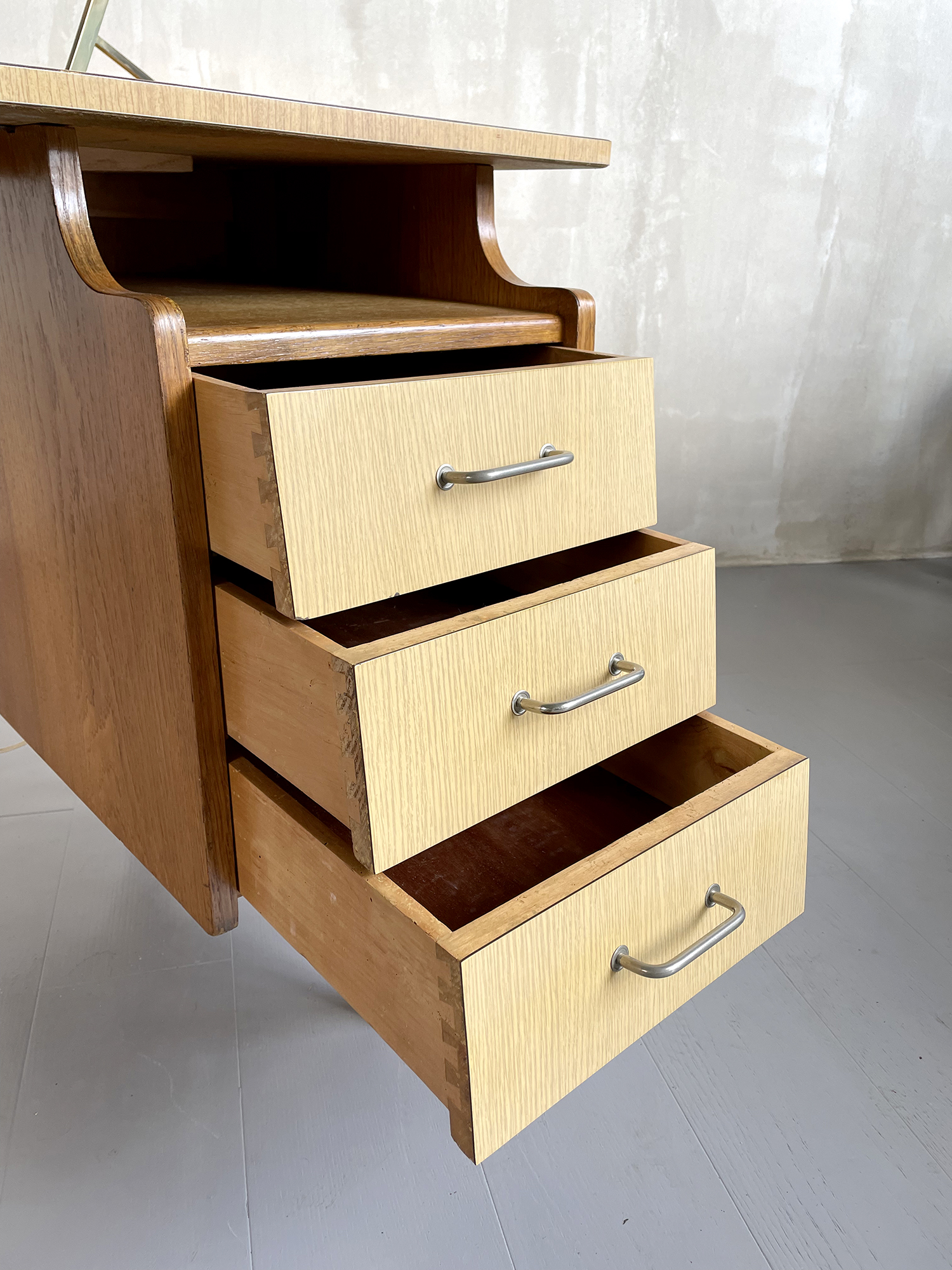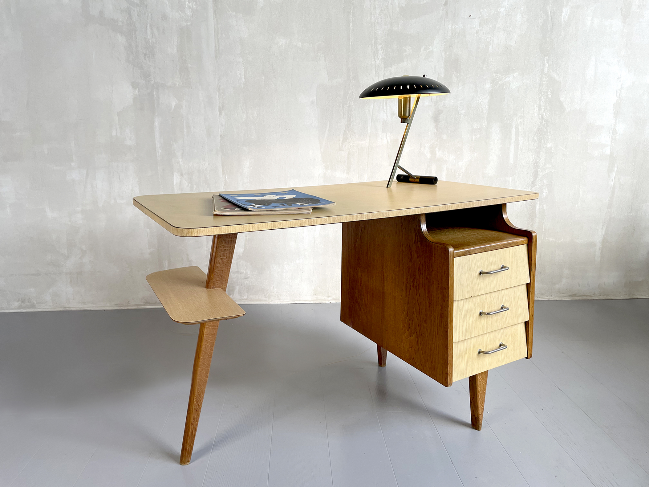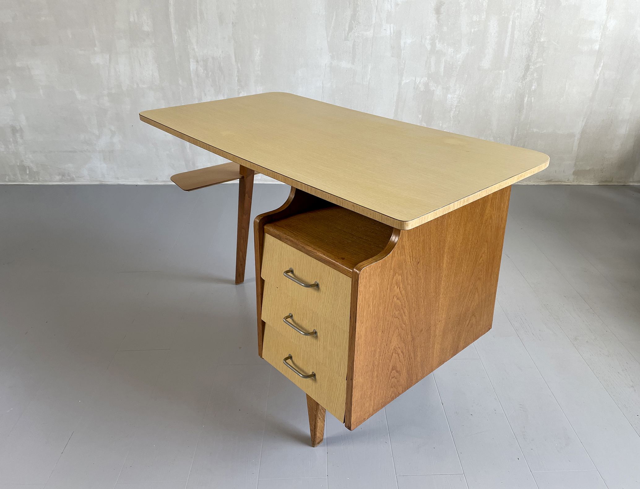Bureau tripode en chêne blond et formica satiné de Jacques Hauville, France 1950. Le caisson à 3 tiroirs est placé à droite et dispose d'un rangement sous le plateau. Une étagère profilée est fixée sur le montant gauche.