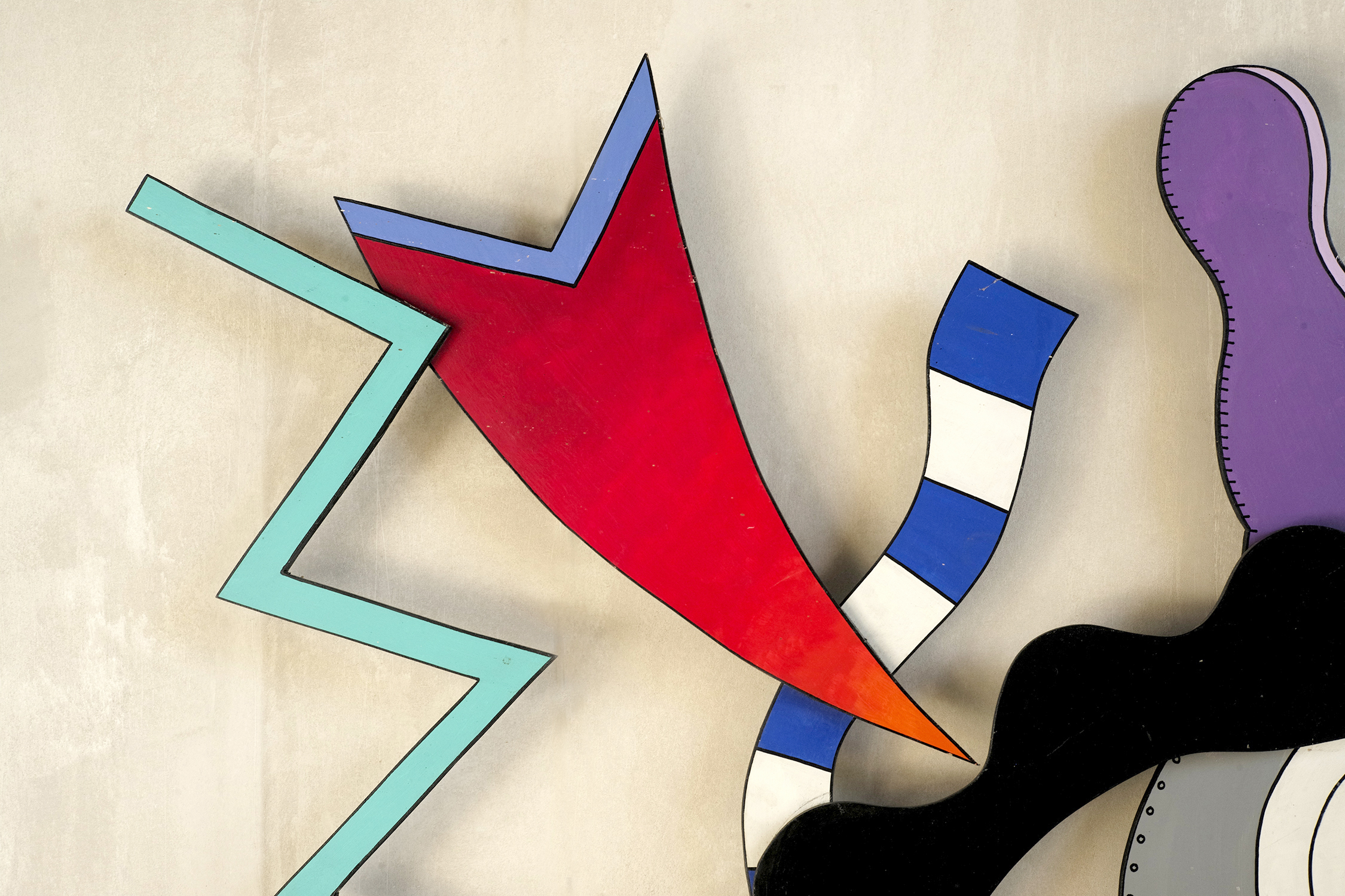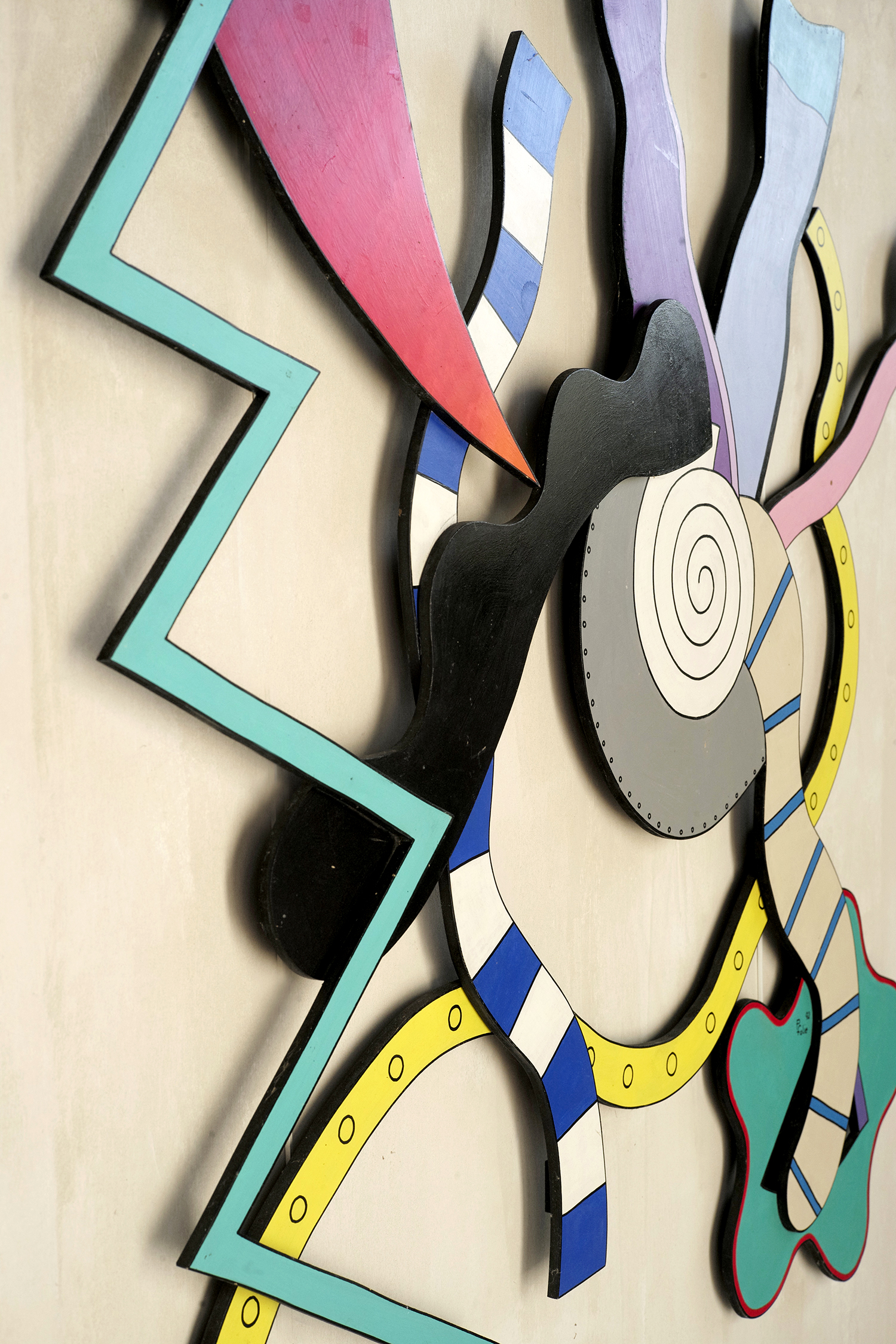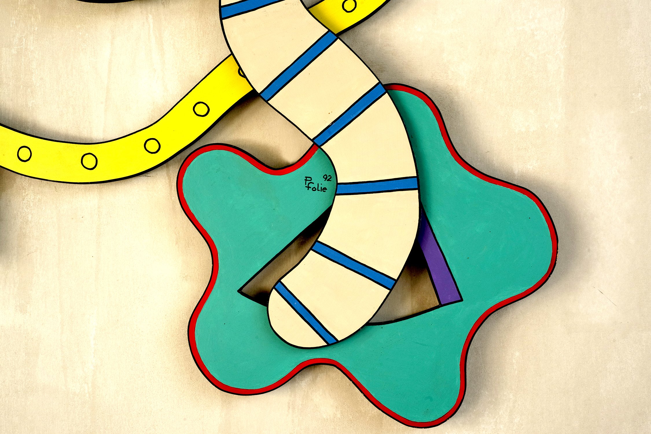 Pierre Folie (1938-2020), Grande sculpture murale en médium laqué et assemblé de la série "Découpages", France 1992. Pierre Folie, artiste et designer était un créateur insatiable. Il a conçu des meubles en acier inoxydable dans les années 1970, sans jamais cesser de peindre, de dessiner et de sculpter. La série "Découpages" créée dans les années 90 témoigne d'une recherche permanente de nouveaux médias. Pour cette série, il utilise le médium, le découpe, le superpose en appliquant une palette de couleurs vibrantes.