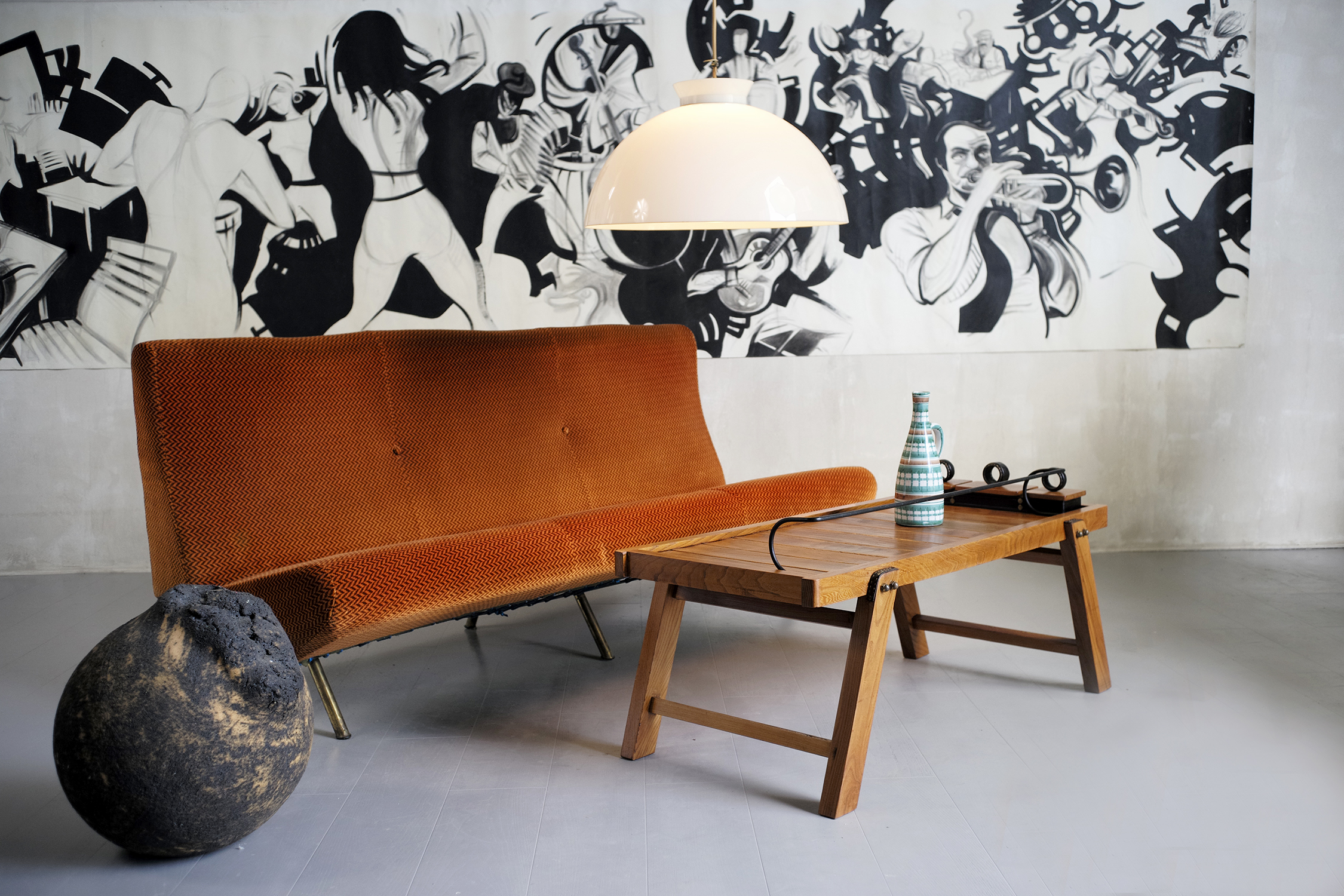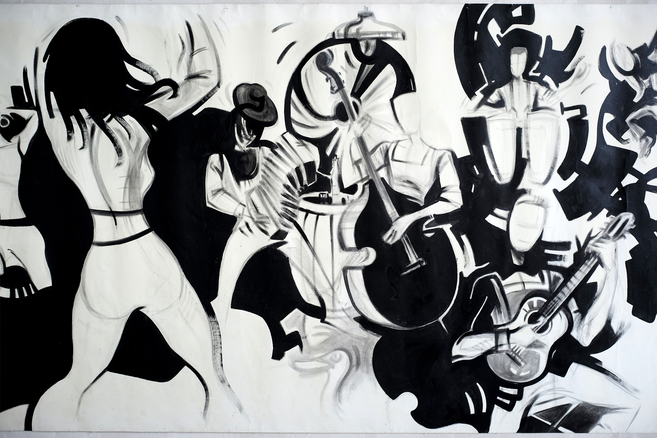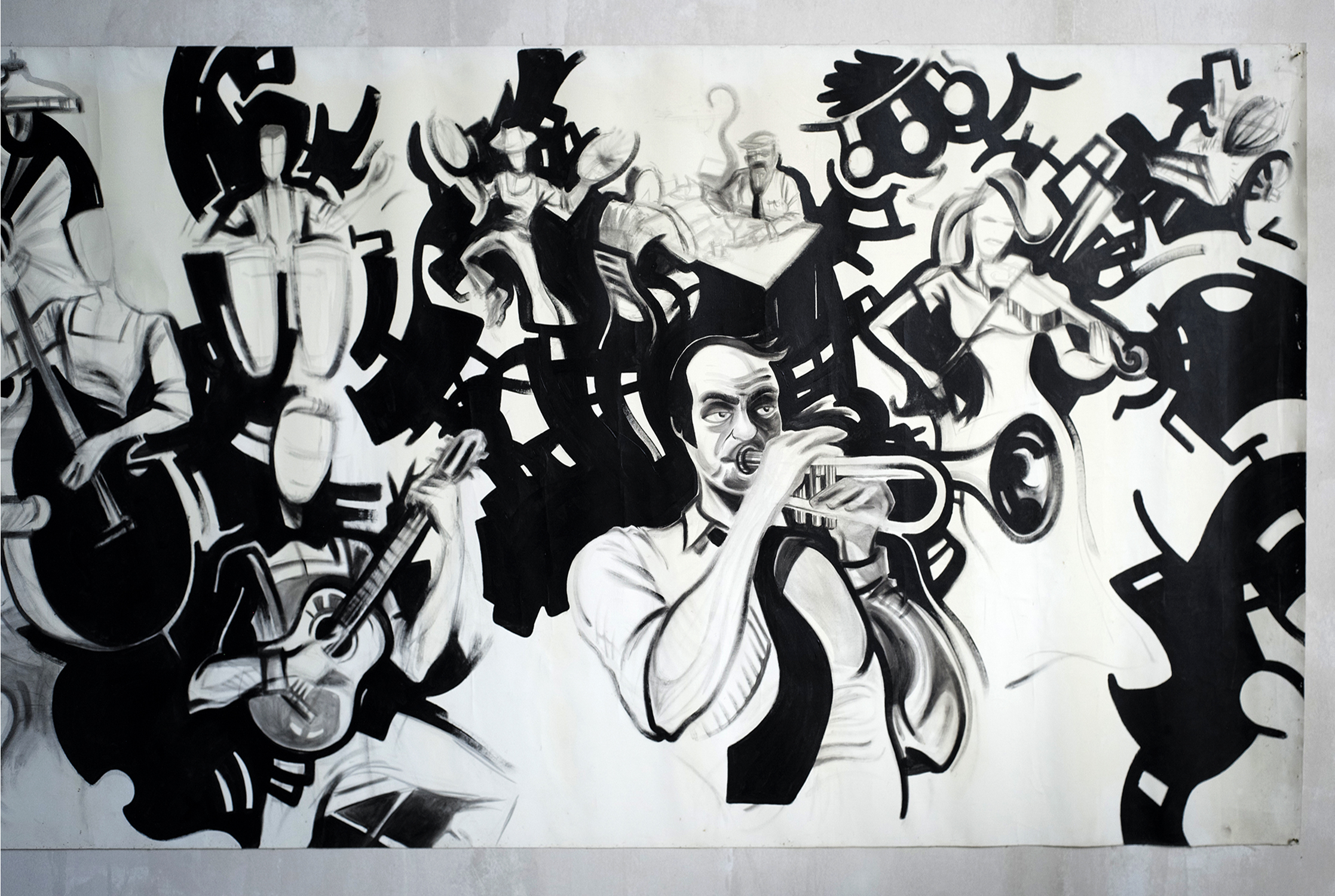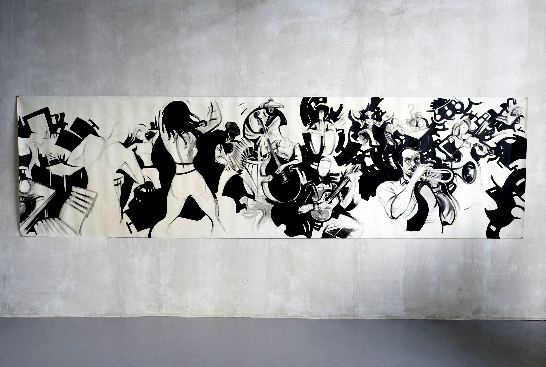 Importante fresque murale "Jazz Box", huile sur toile, France 1960. Cette composition de 438 cm de long représente un orchestre de jazz en concert, des danseurs et en fond des joueurs de cartes. Traitée en noir et blanc, cette œuvre de l'Ecole Toulousaine des années 1960 est probablement une création de Christian Schmidt (1919-2003).